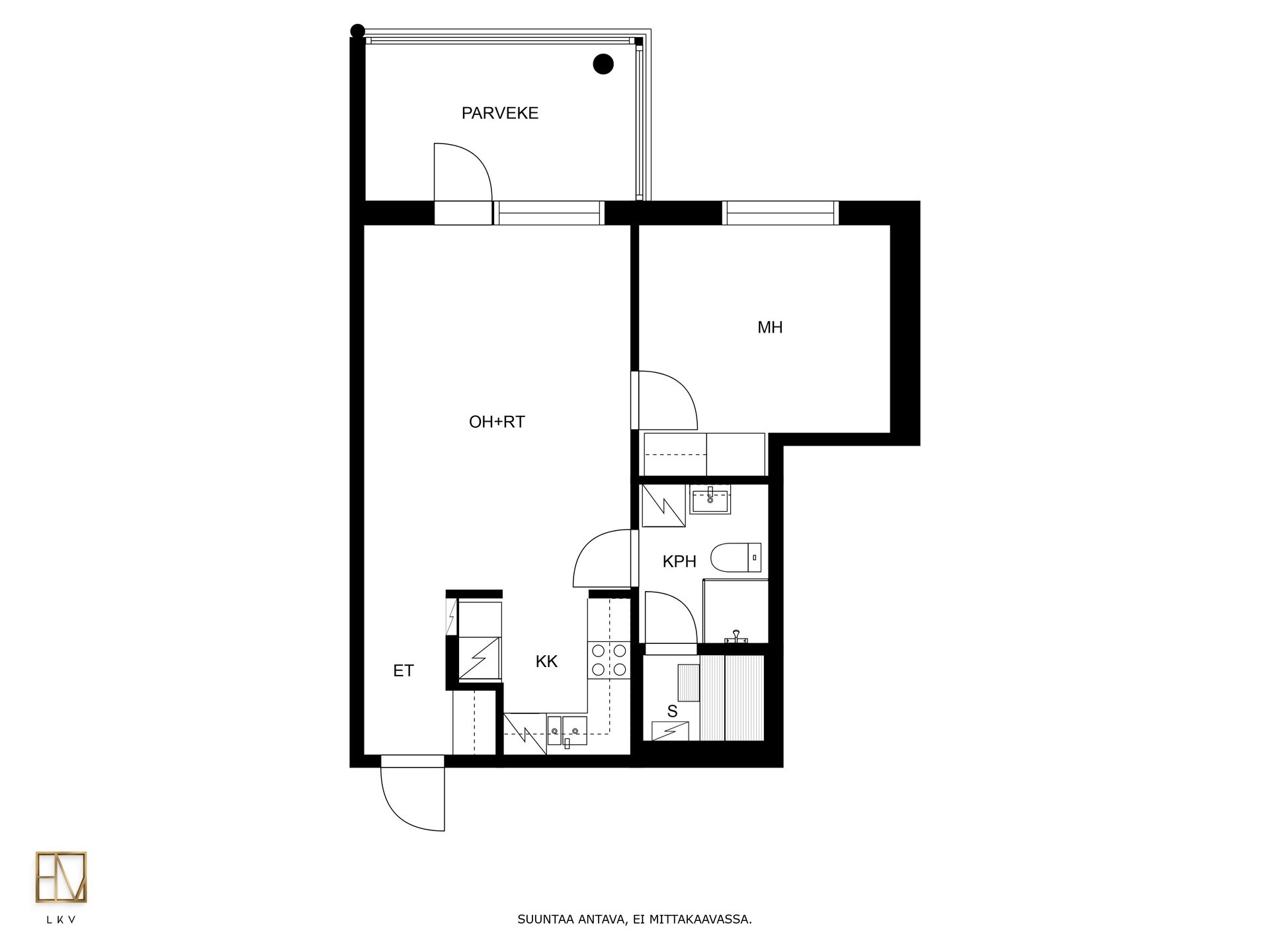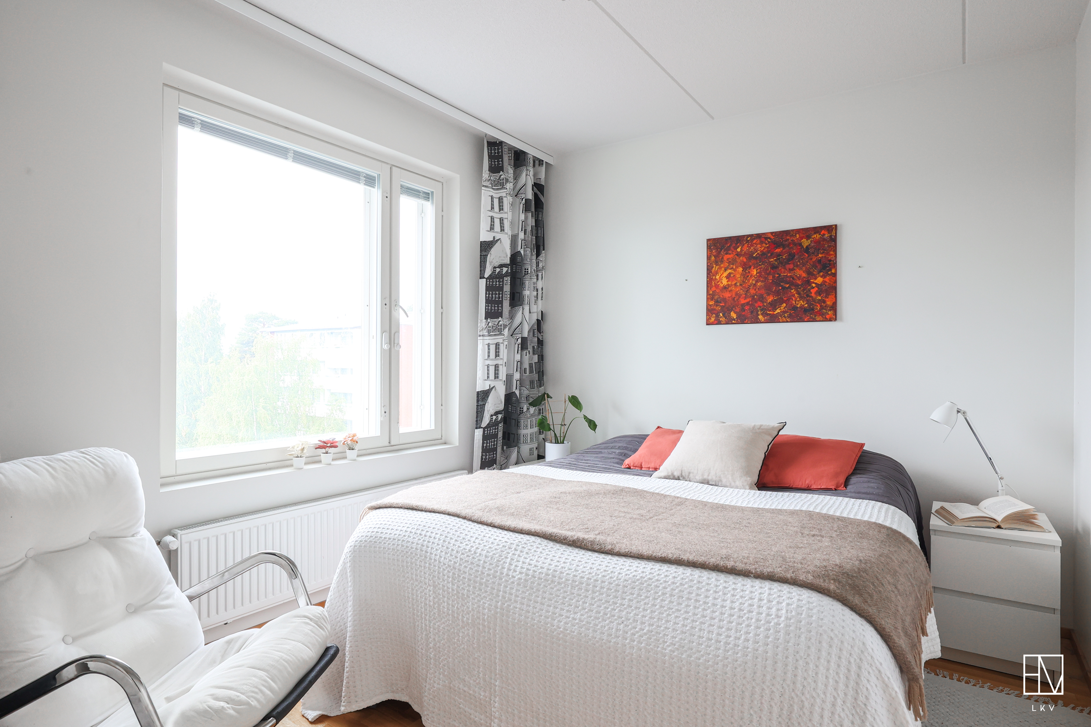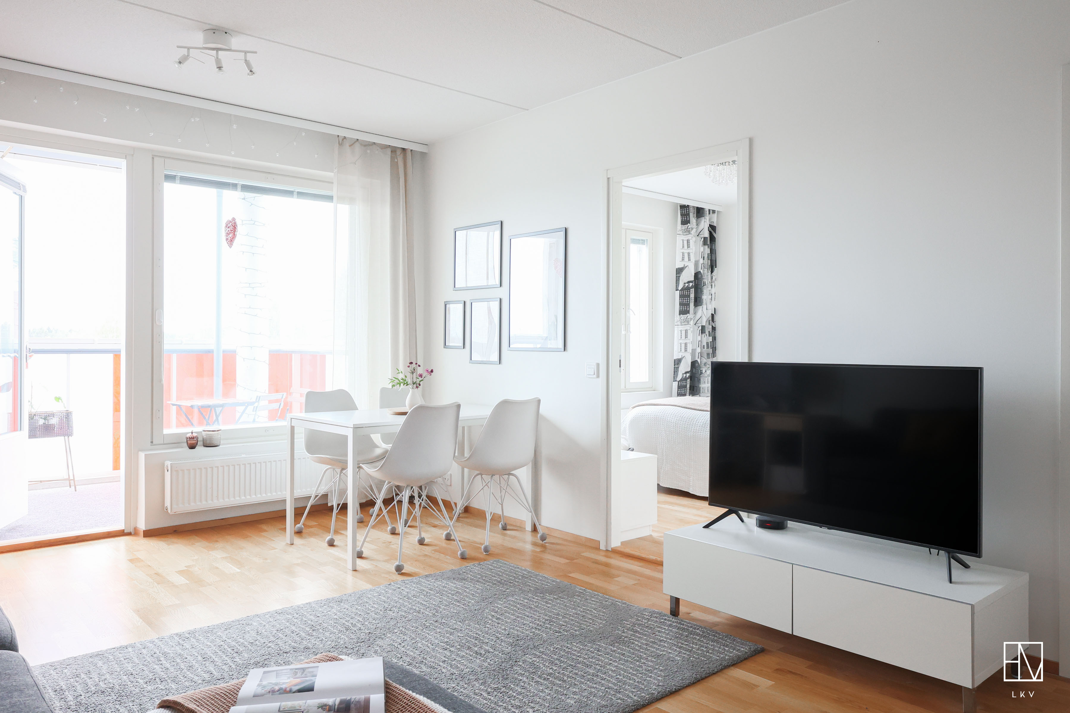 Asunnon sydän on avara ja käytännöllinen olohuone, joka on sulavasti samaa tilaa keittiön kanssa. Suurella lasitetulla parvekkeella on mukava rentoutua ja se toimii kuin lisähuoneena pitkälle syksyyn. Makuuhuone on mukavan kokoinen ja löytyypä asunnosta vielä oma saunakin.