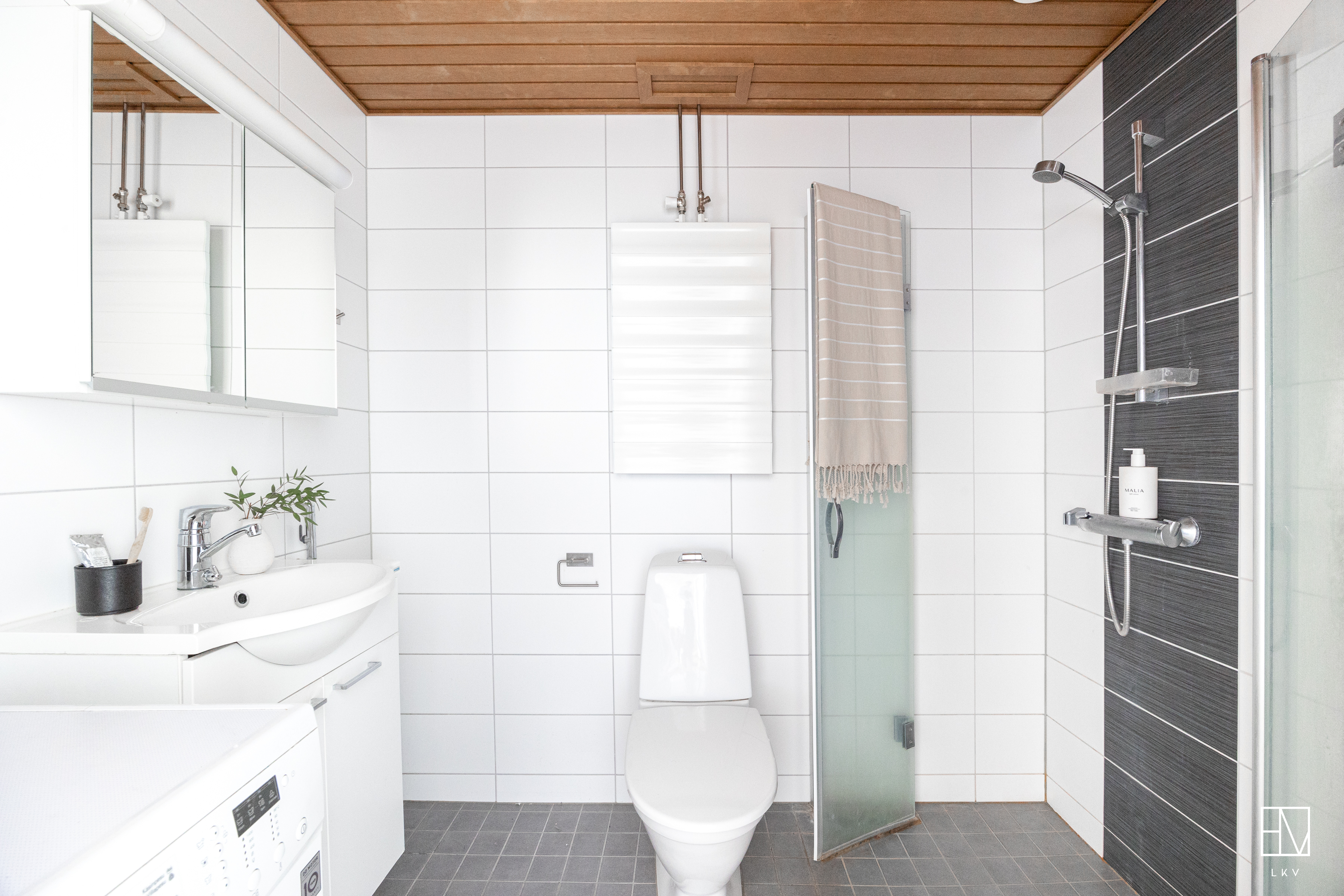 Varusteet: suihkuseinä, pesukoneliitäntä, wc-istuin, suihku, peilikaappi, kiinteät valaisimet