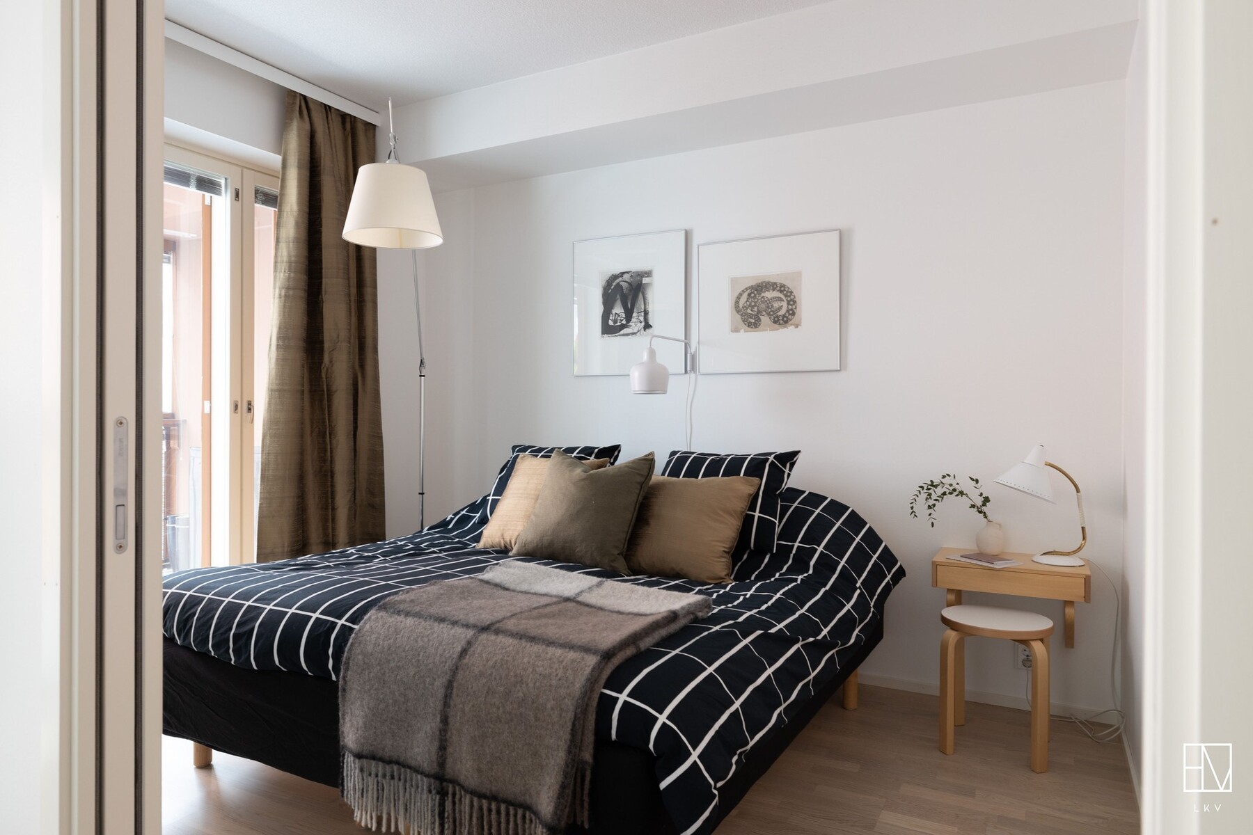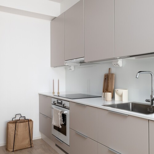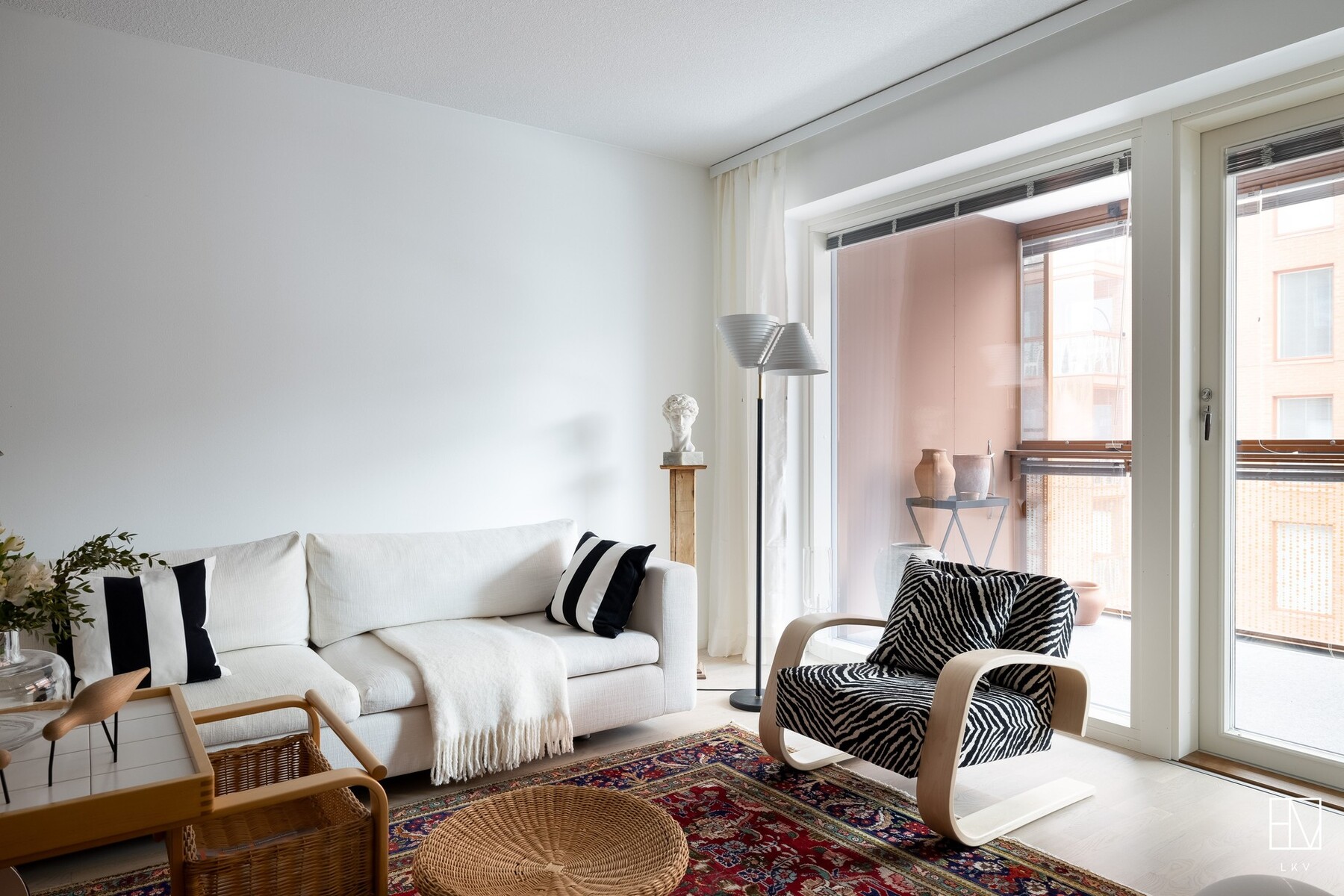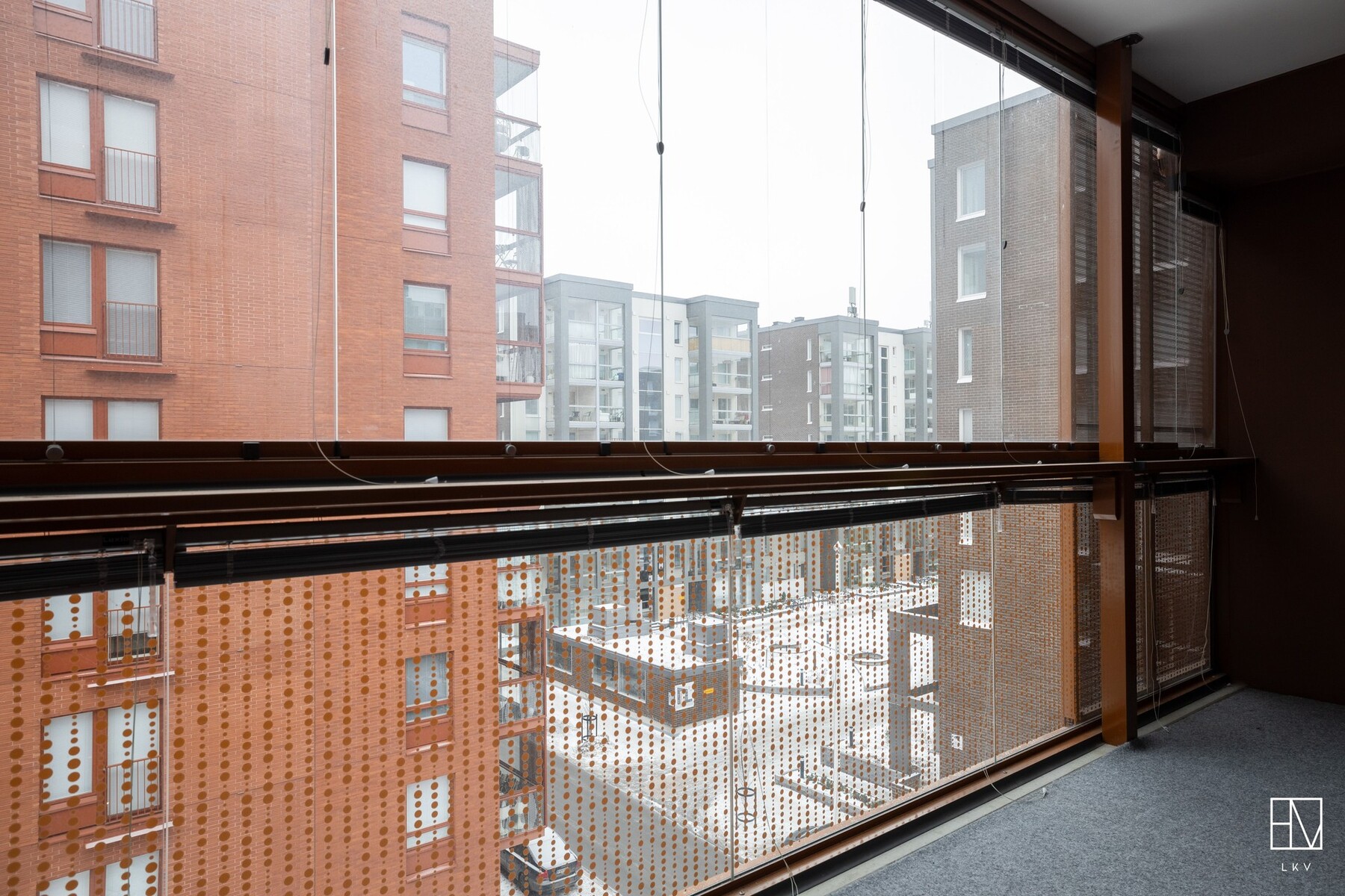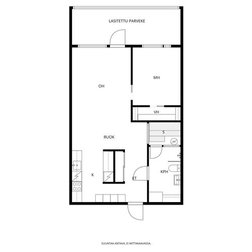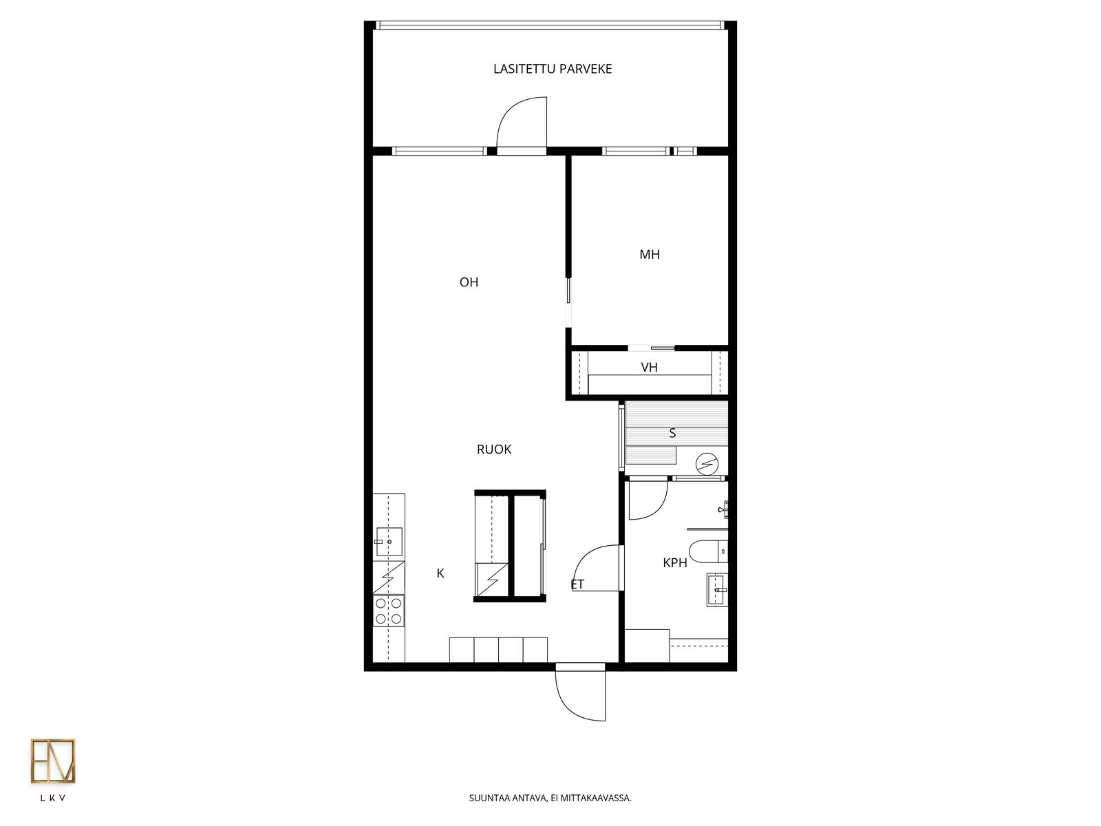 Avara ja selkeä pohjaratkaisu on toimiva ja se tarjoaa mm. keittiön ja olohuoneen muodostamat yhtenäiset oleskelutilat. Tilan tuntua oleskelutiloihin tuo koko huoneiston levyinen lasitettu parveke! Makuuhuone on mukavan väljä ja sen yhteydessä on vaatehuone.