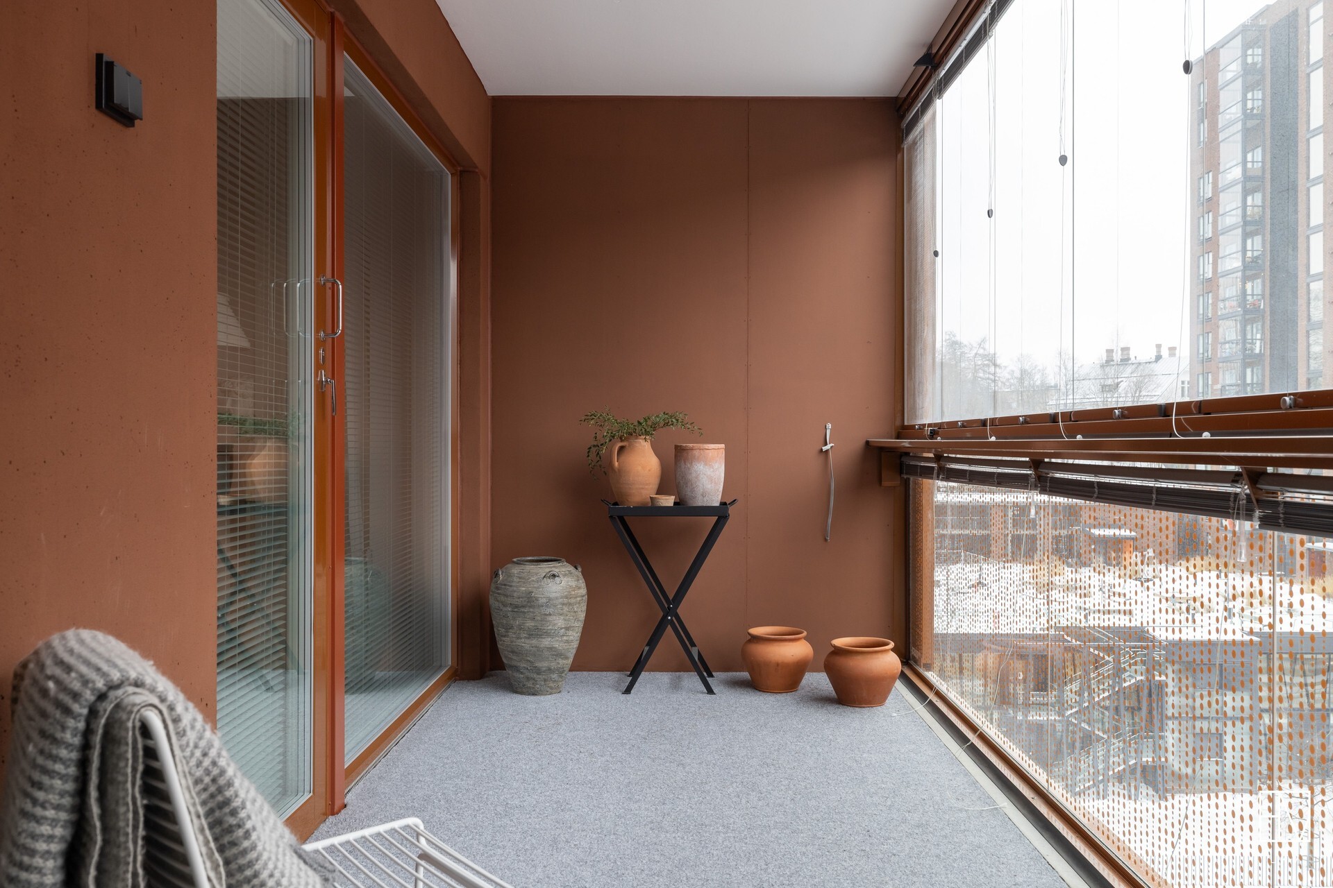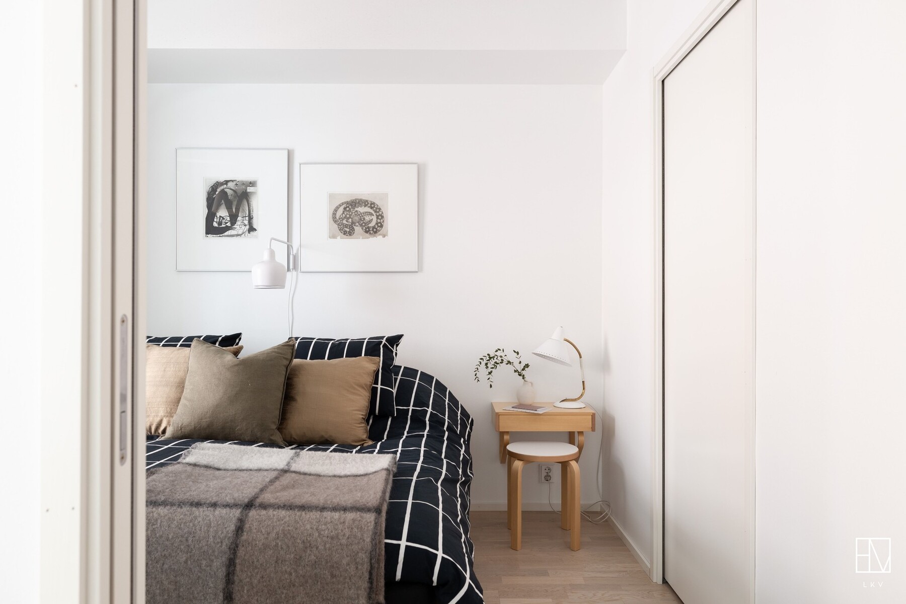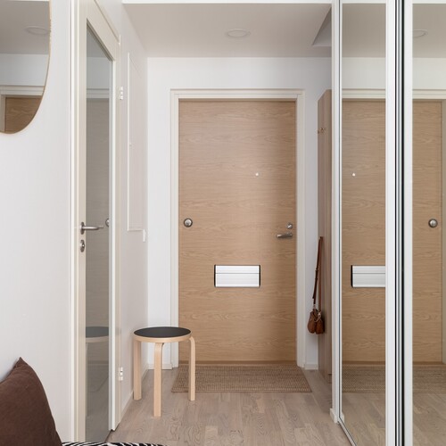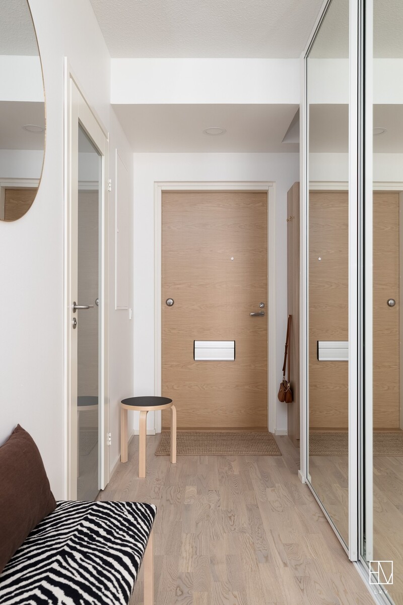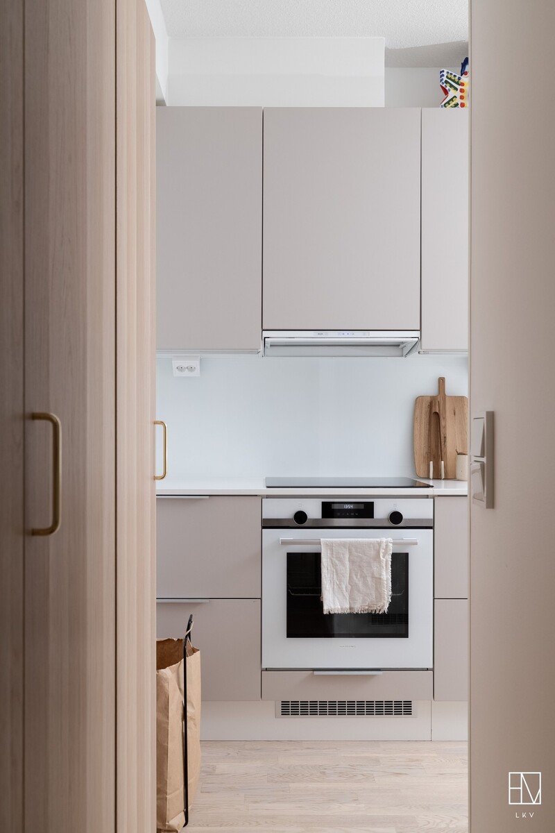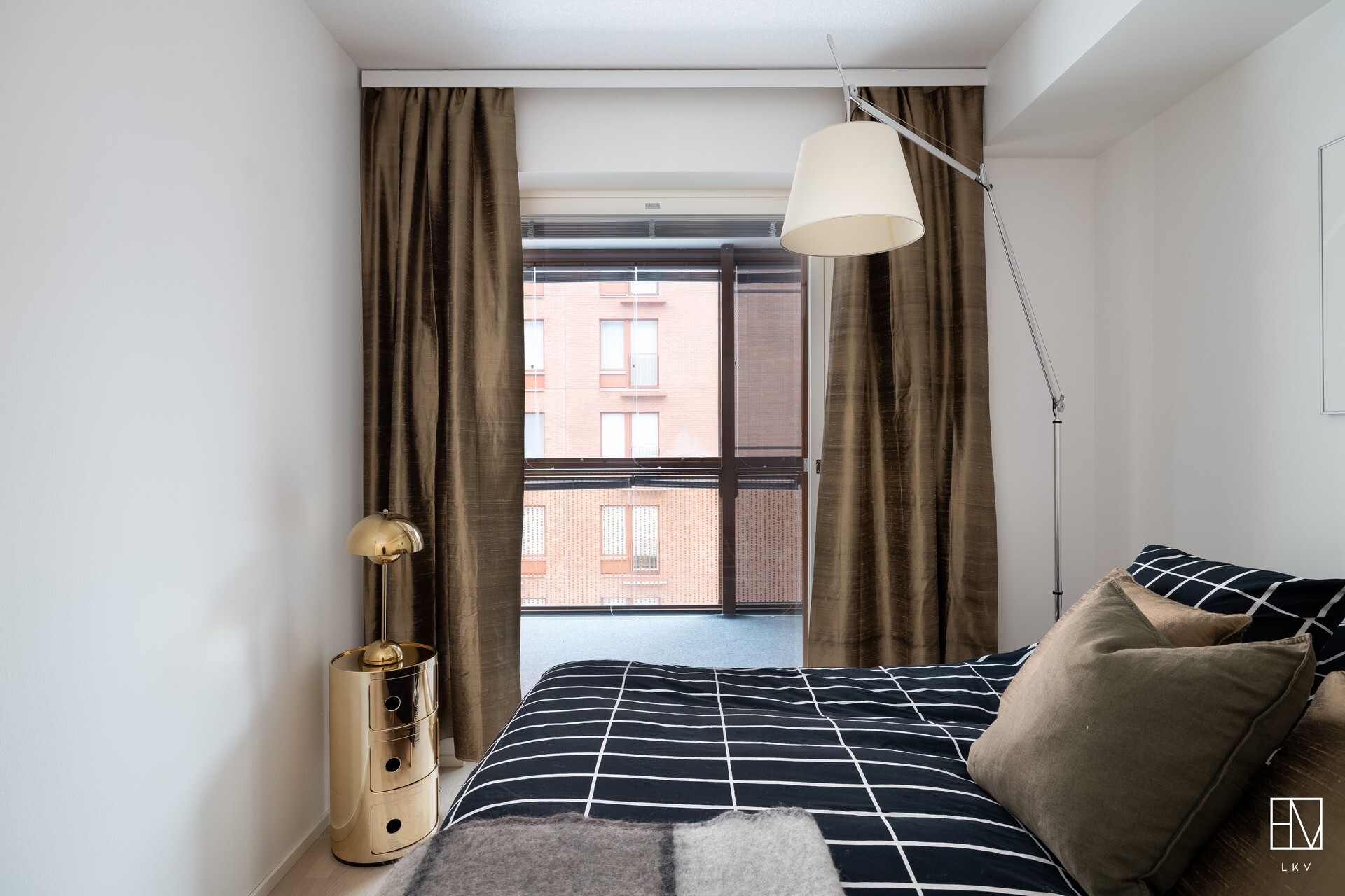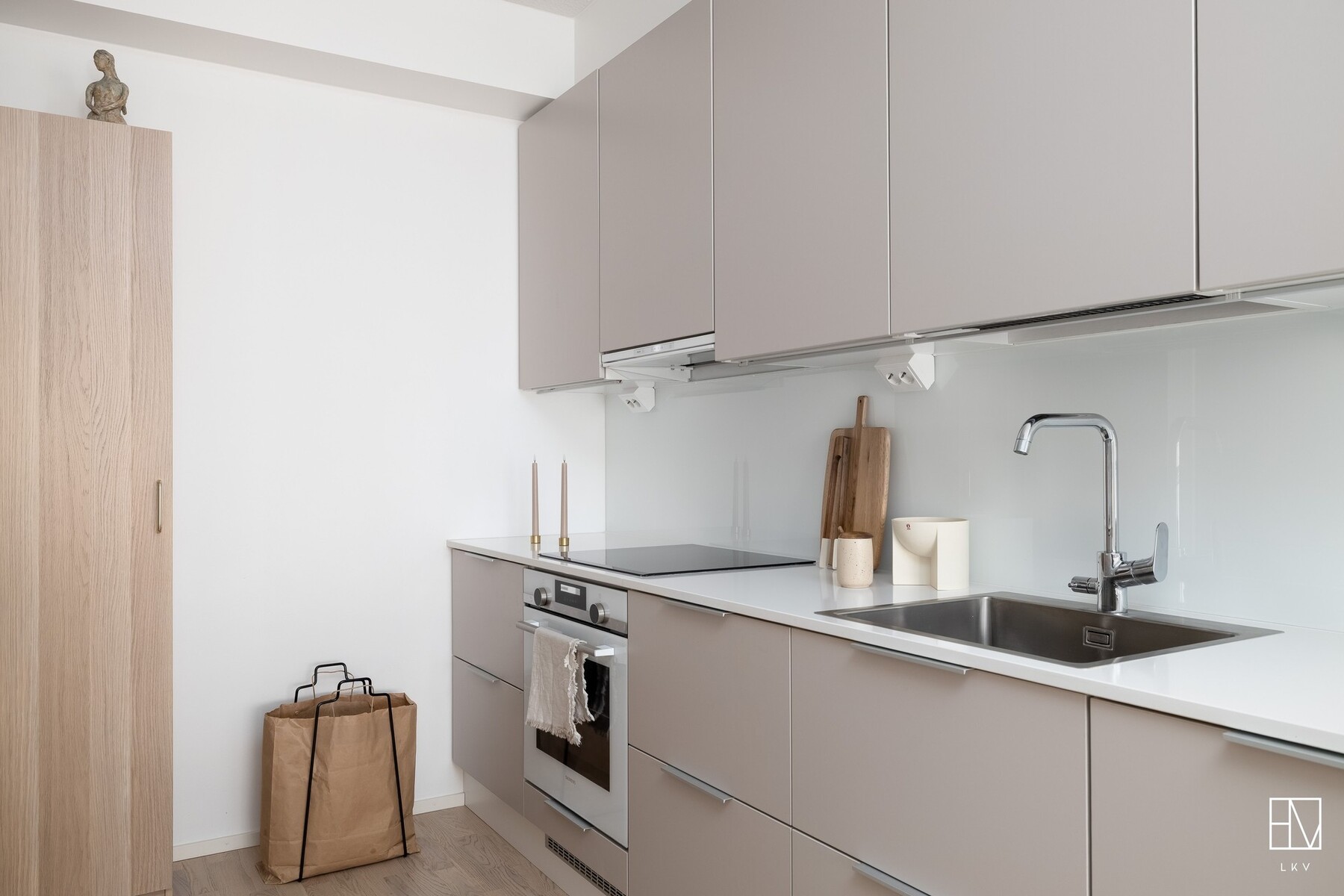 Avara ja selkeä pohjaratkaisu on toimiva ja se tarjoaa mm. keittiön ja olohuoneen muodostamat yhtenäiset oleskelutilat. Tilan tuntua oleskelutiloihin tuo koko huoneiston levyinen lasitettu parveke! Makuuhuone on mukavan väljä ja sen yhteydessä on vaatehuone.