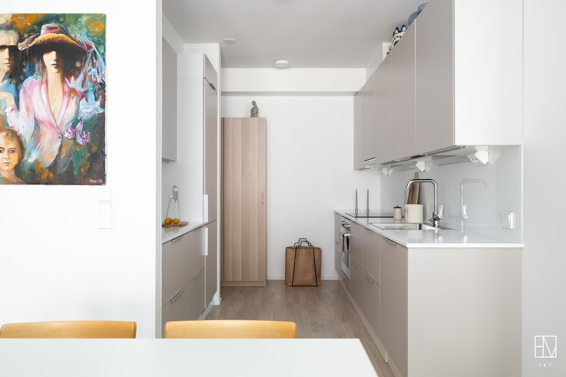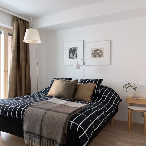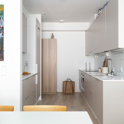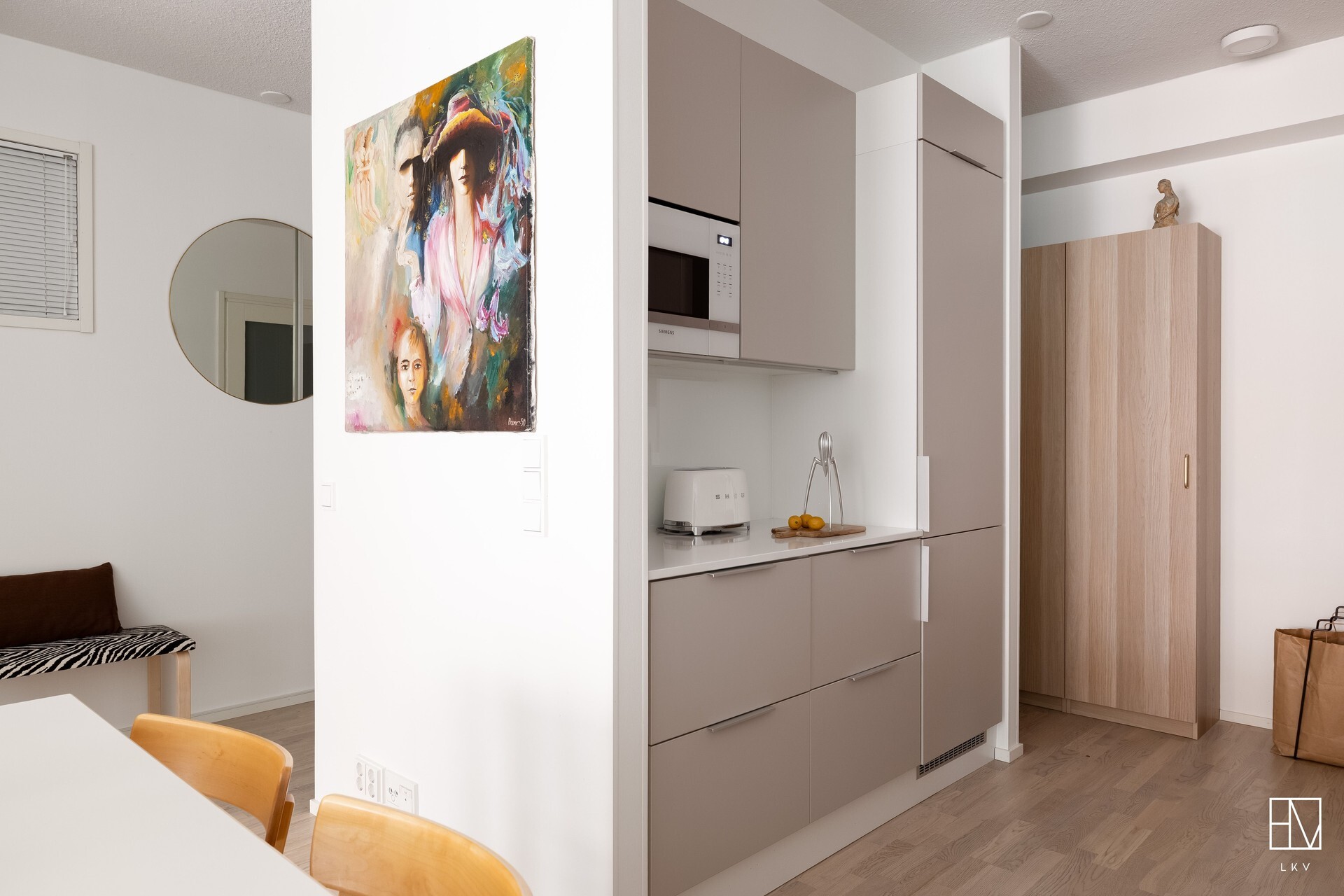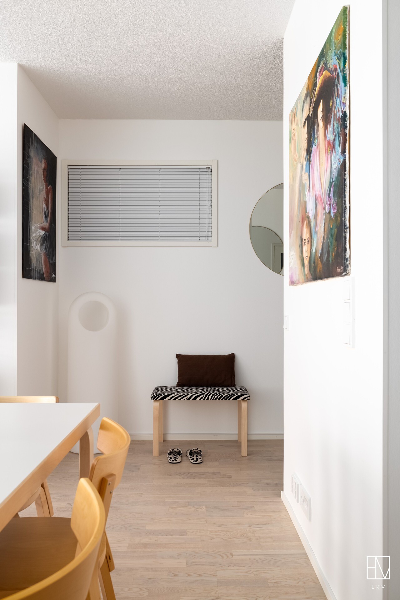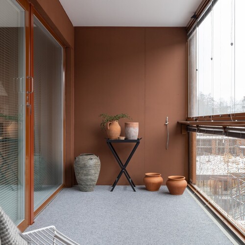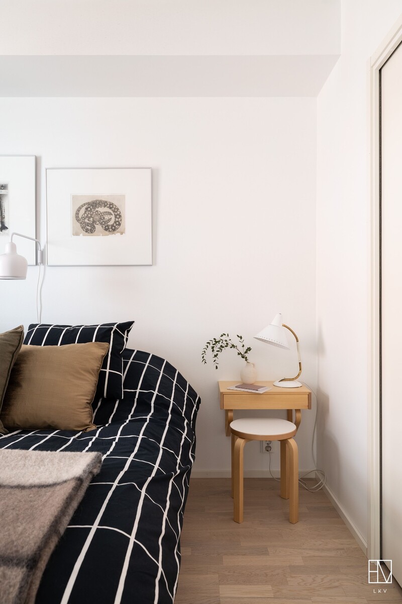 Avara ja selkeä pohjaratkaisu on toimiva ja se tarjoaa mm. keittiön ja olohuoneen muodostamat yhtenäiset oleskelutilat. Tilan tuntua oleskelutiloihin tuo koko huoneiston levyinen lasitettu parveke! Makuuhuone on mukavan väljä ja sen yhteydessä on vaatehuone.