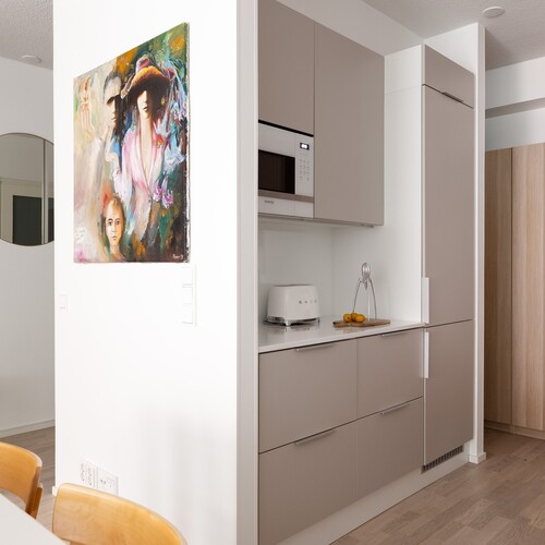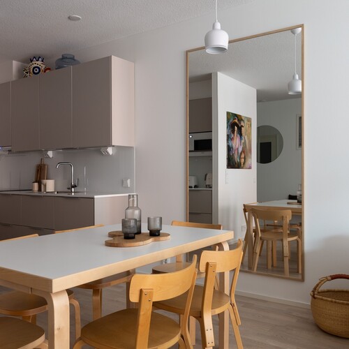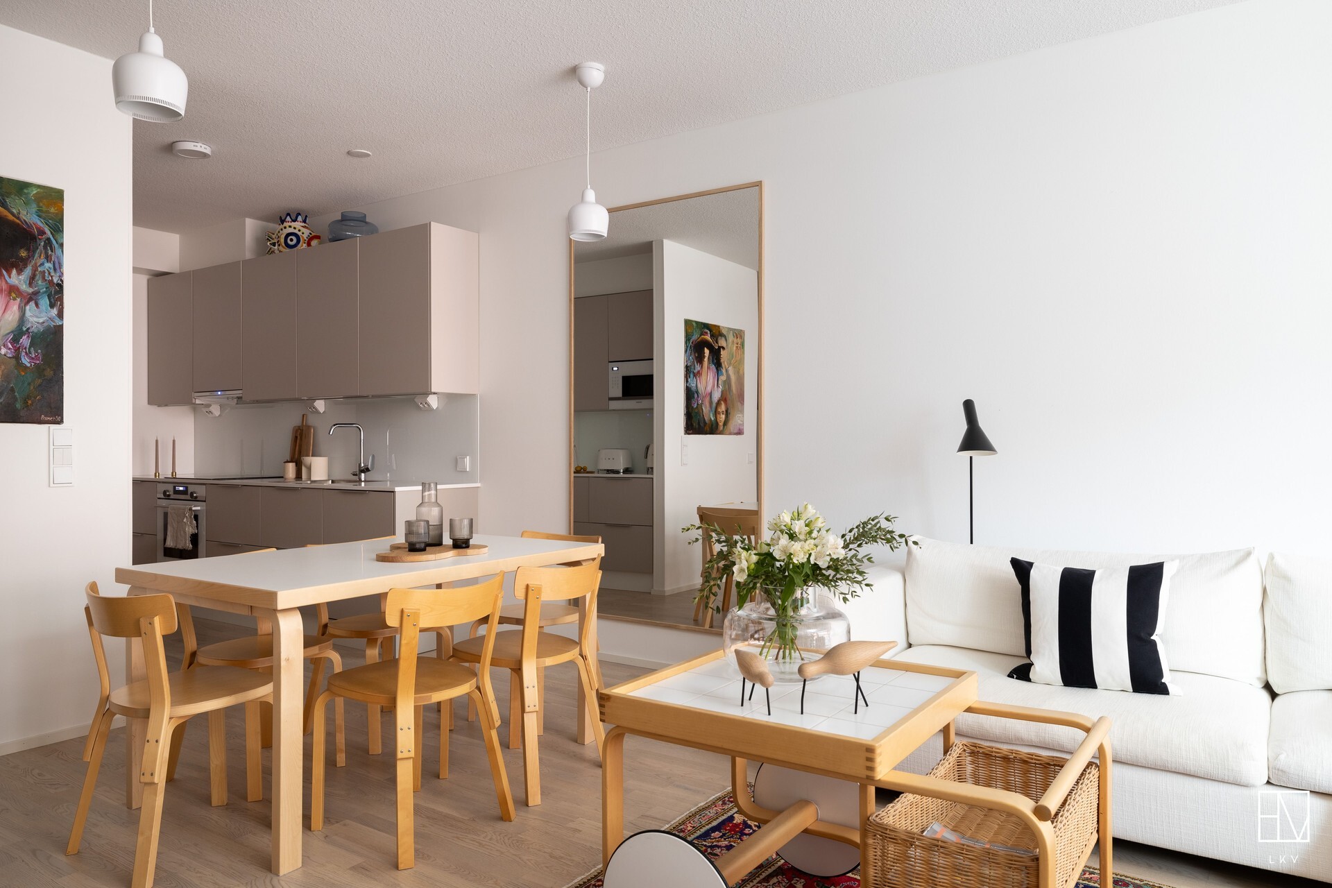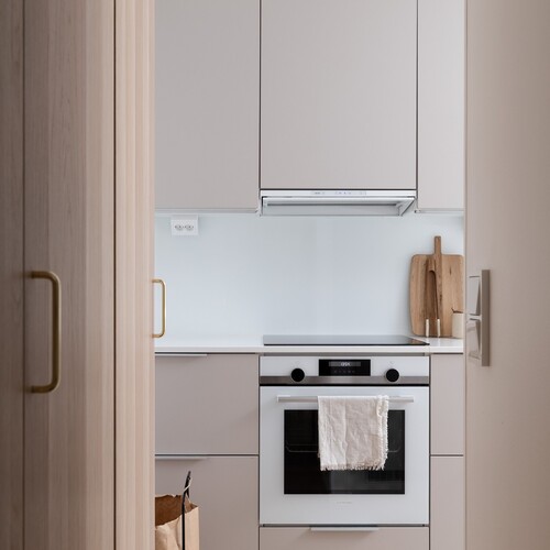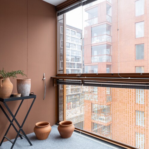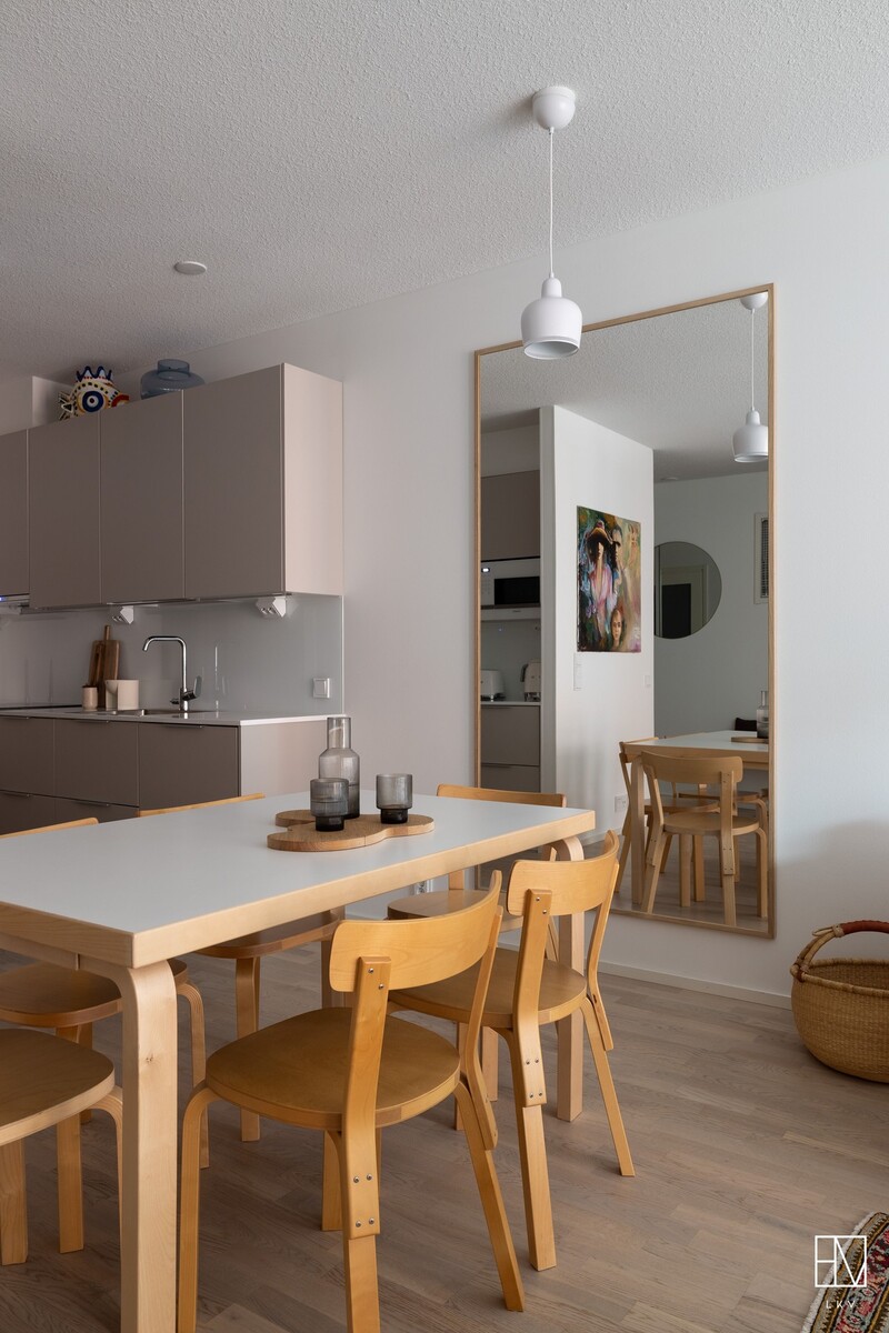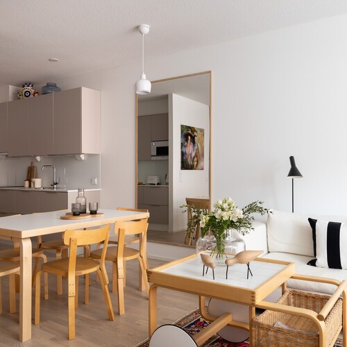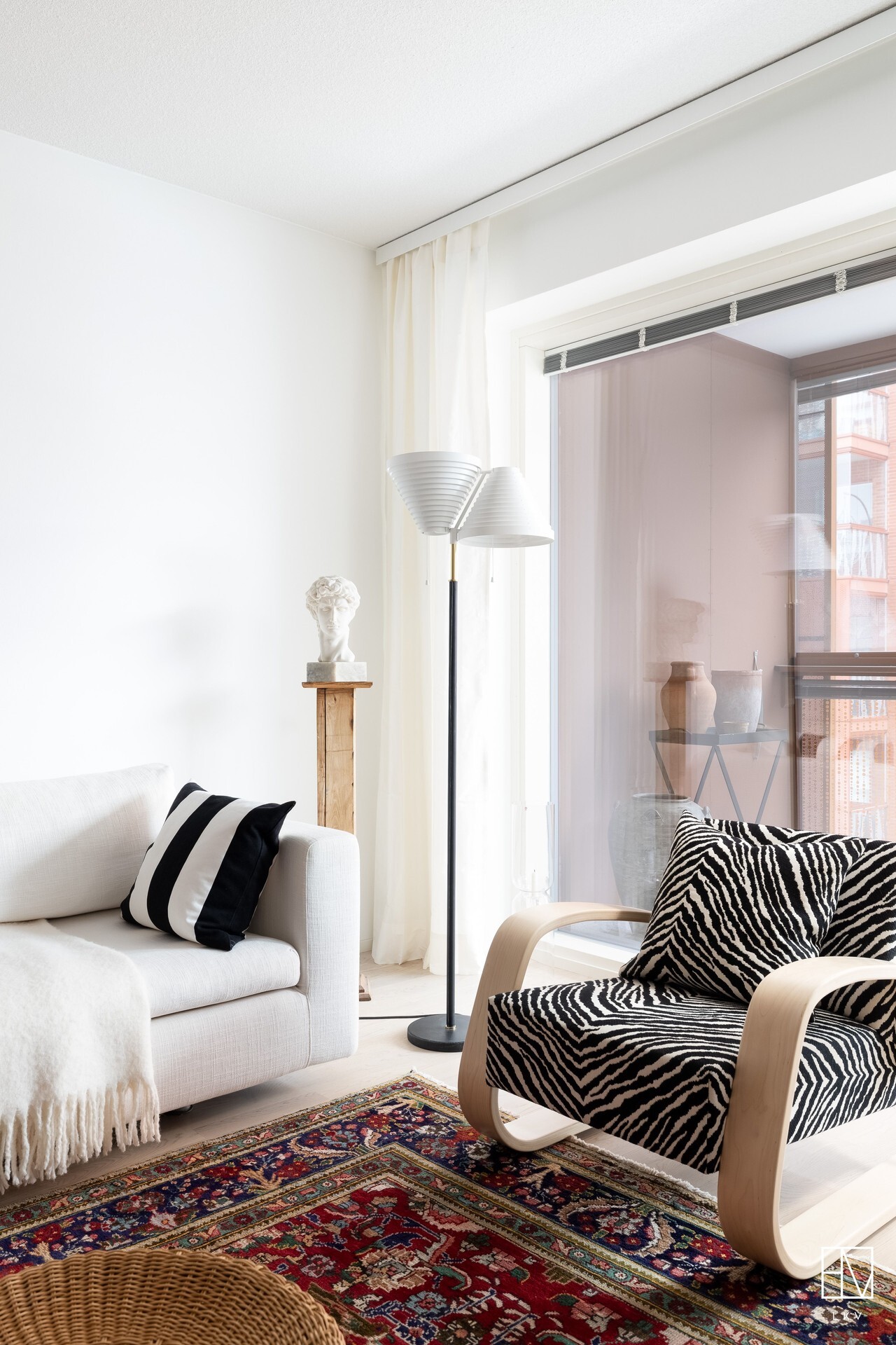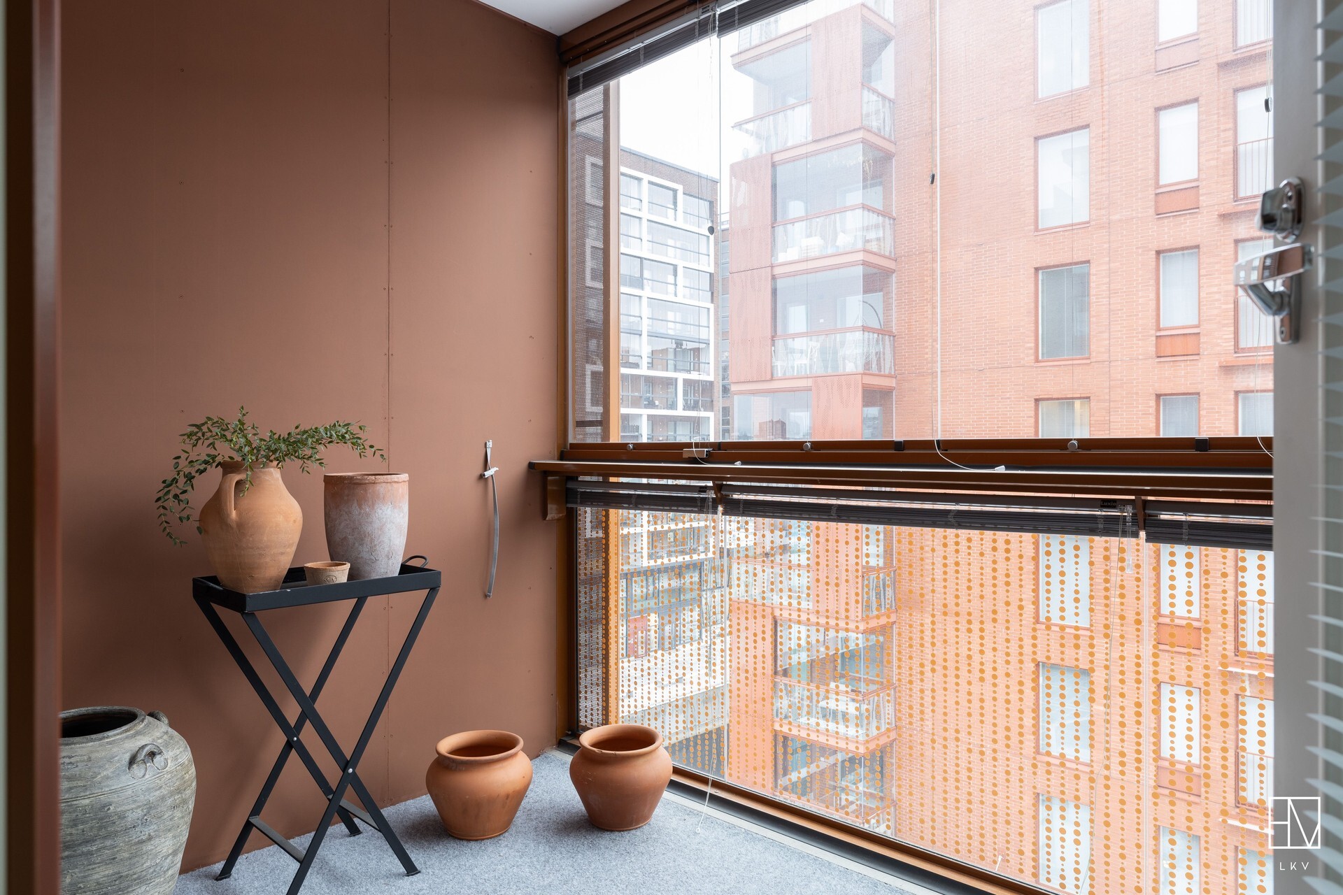 Avara ja selkeä pohjaratkaisu on toimiva ja se tarjoaa mm. keittiön ja olohuoneen muodostamat yhtenäiset oleskelutilat. Tilan tuntua oleskelutiloihin tuo koko huoneiston levyinen lasitettu parveke! Makuuhuone on mukavan väljä ja sen yhteydessä on vaatehuone.