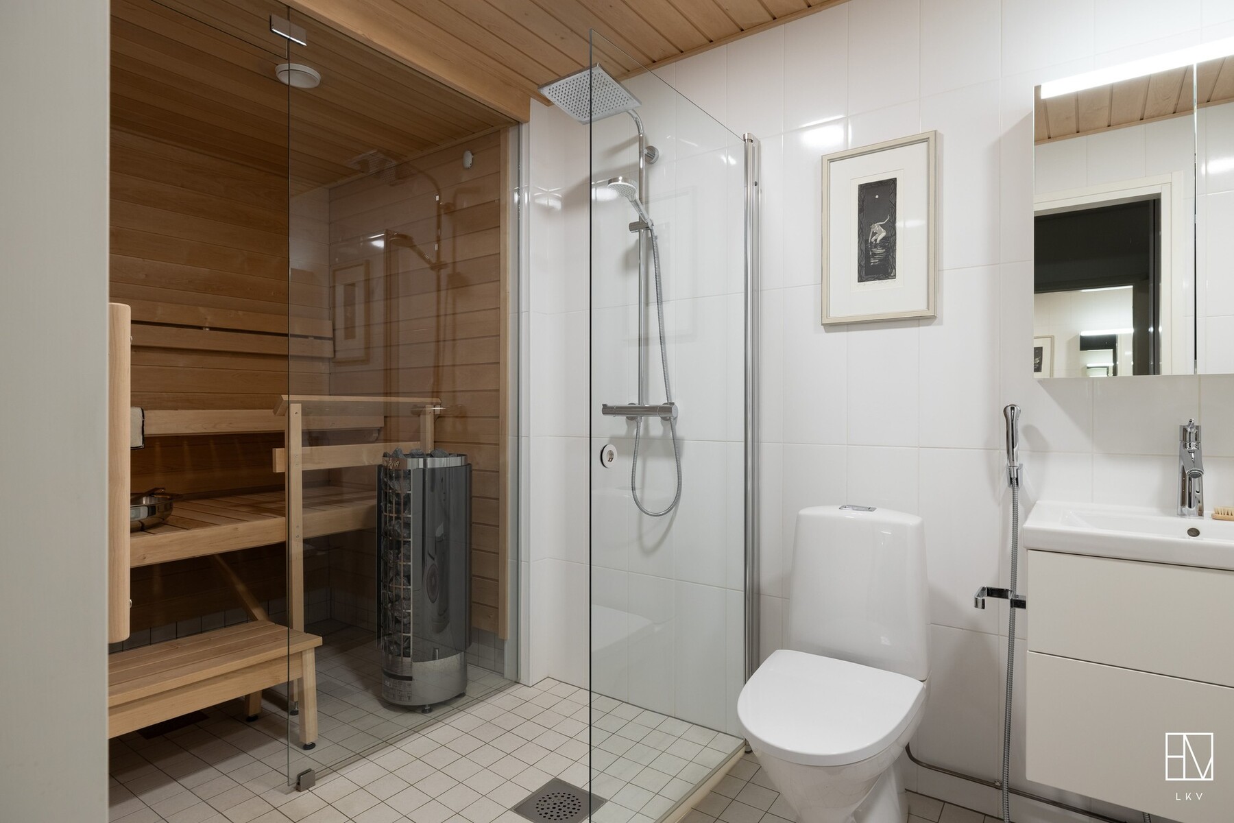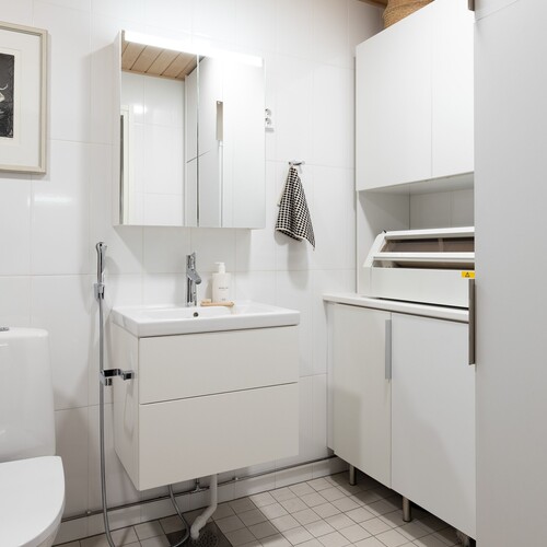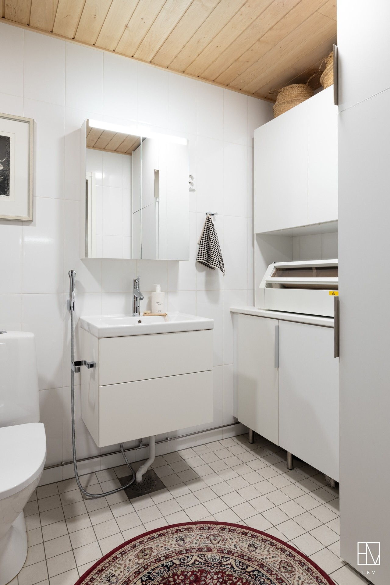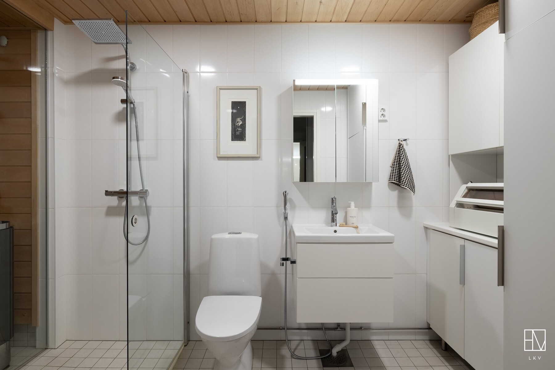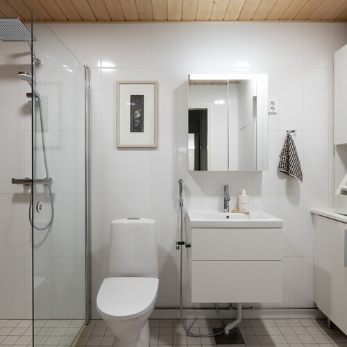 Varusteet: suihkuseinä, pesukoneliitäntä, wc-istuin, suihku, peilikaappi, kiinteät valaisimet, kylpyhuonekaapisto