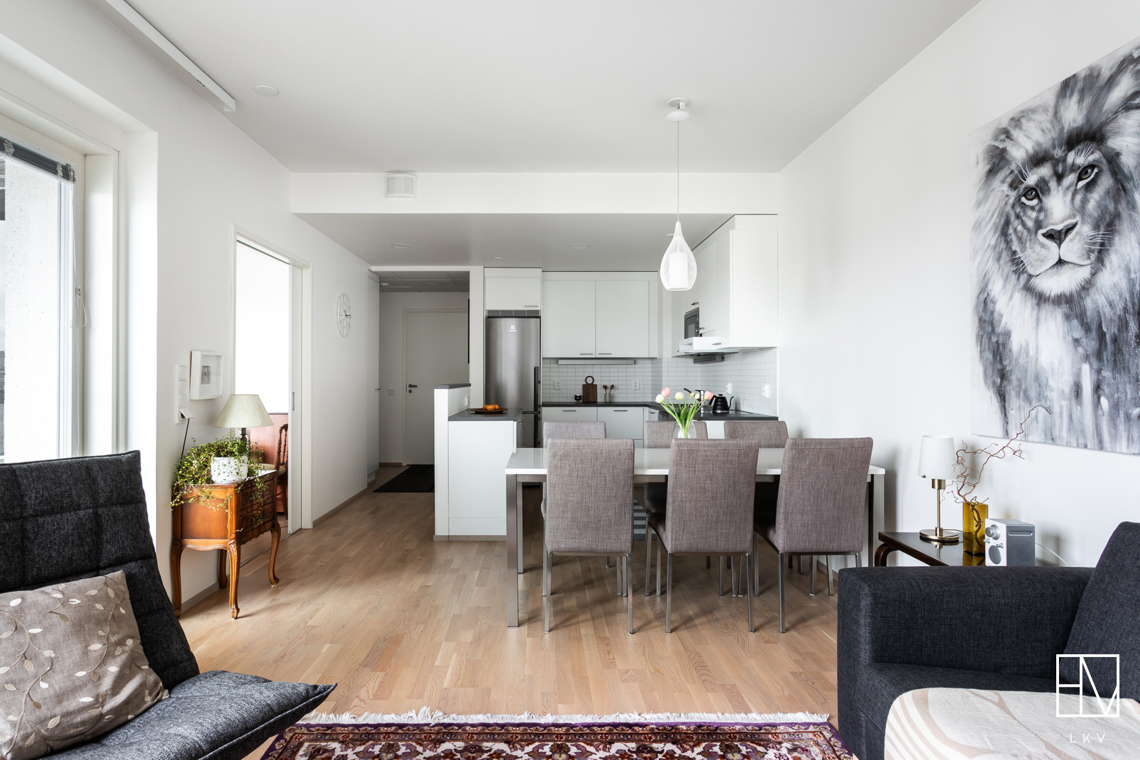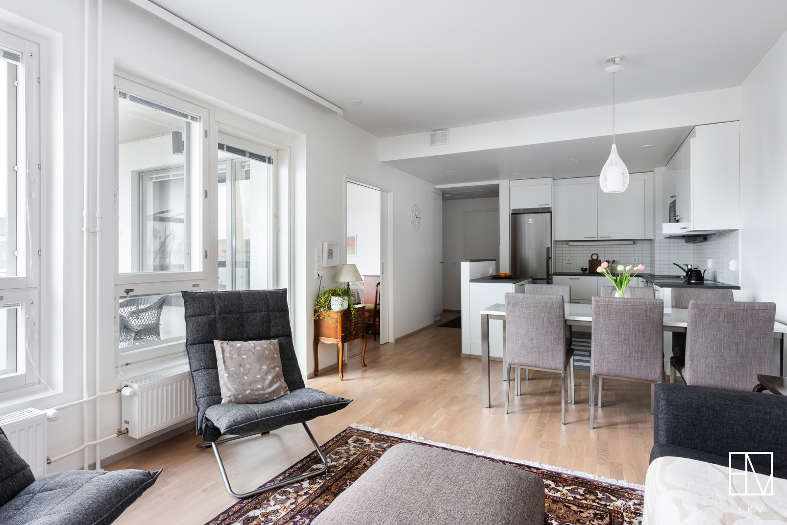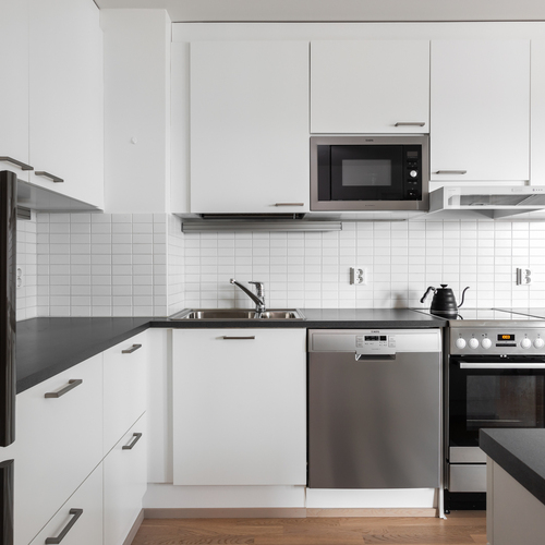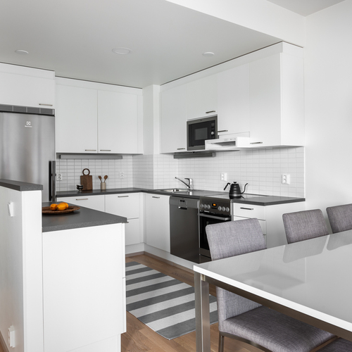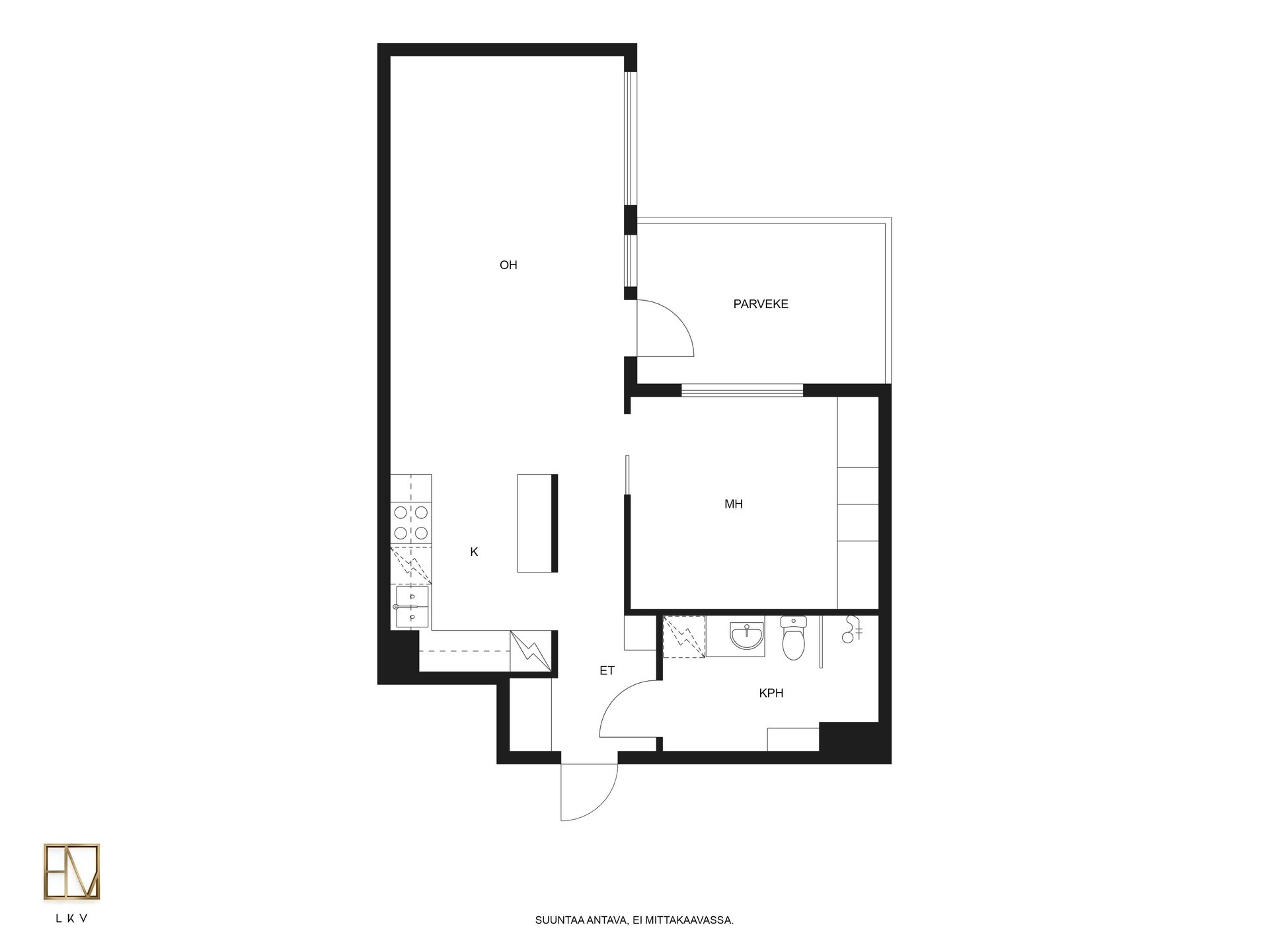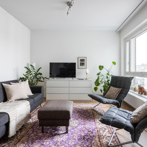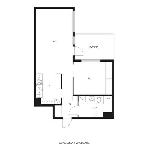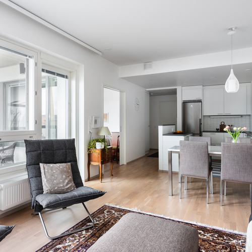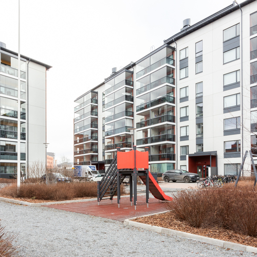 Tilava ja valoissa 6. kerroksen kaksio soveltuu moneen eri elämäntilanteeseen, aina ensiasunnon ostajasta senioriin. Pohjaratkaisussa keittiö ja olohuone ovat yhtenäistä avaraa tilaa. Paikka löytyy niin ruokapöydälle, sohvalle ja tarvittaessa myös työpisteelle. Iso lasitettu parveke toimii lisähuoneena pitkälle syksyyn ja mahdollistaa keväisin varaslähdön kohti kesää. Tämän lisäksi asunnossa on makuuhuone sekä tilava kylpyhuone. Huoneistokohtainen häkkivarasto löytyy yhtiön alakerrasta.