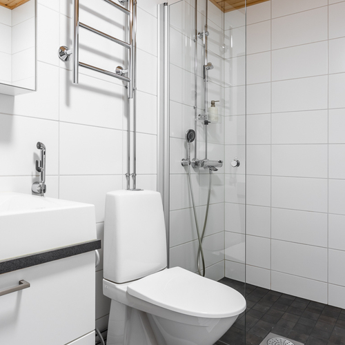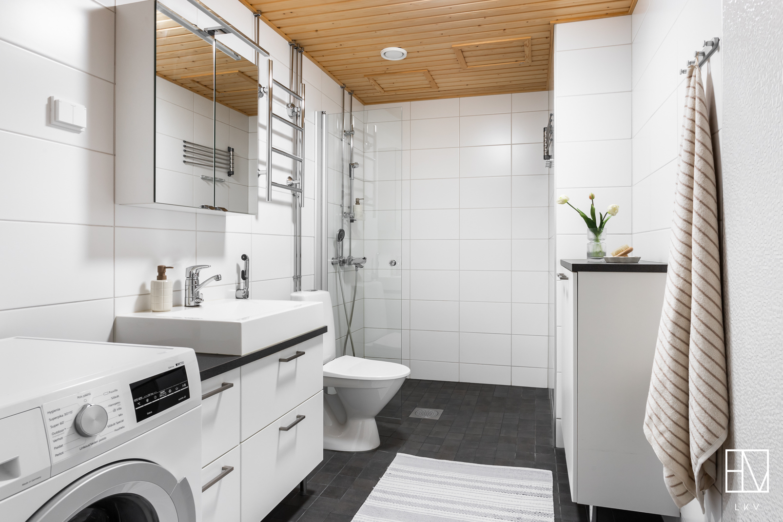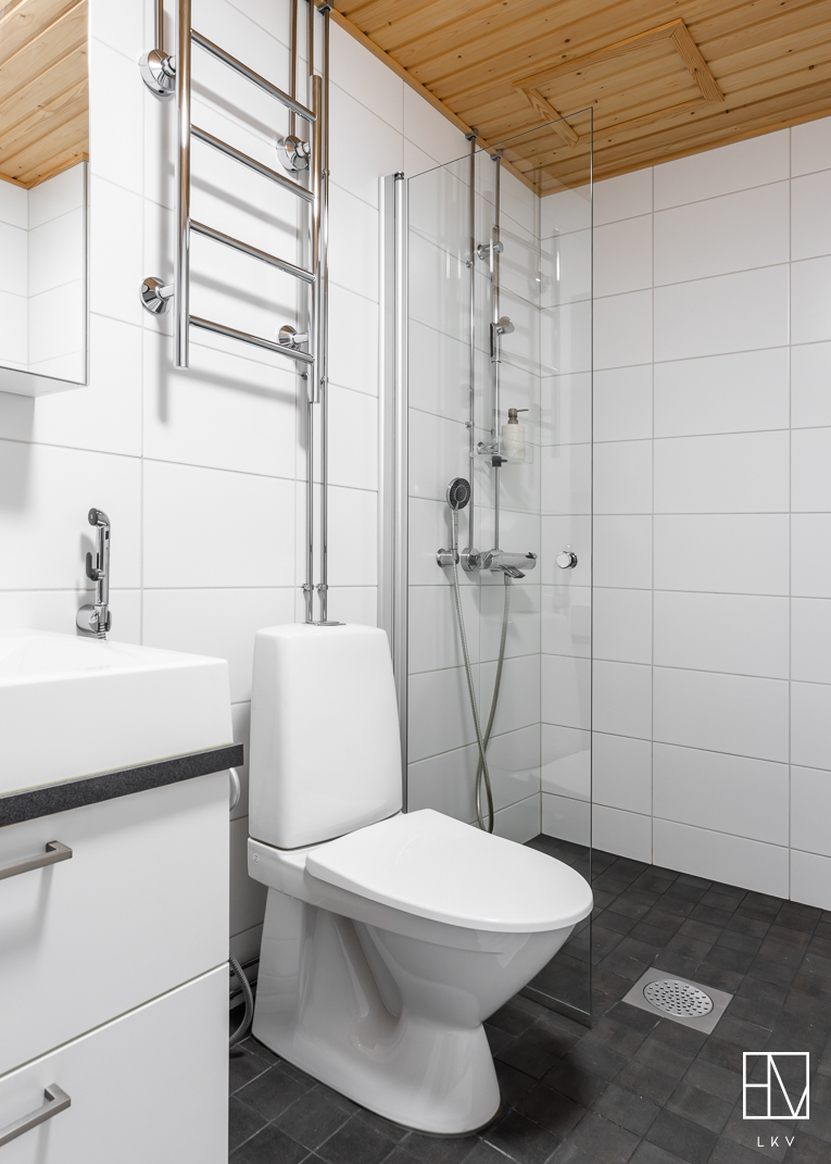 Varusteet: suihkuseinä, pesukoneliitäntä, lattialämmitys, wc-istuin, suihku, kiinteät valaisimet, kylpyhuonekaapisto