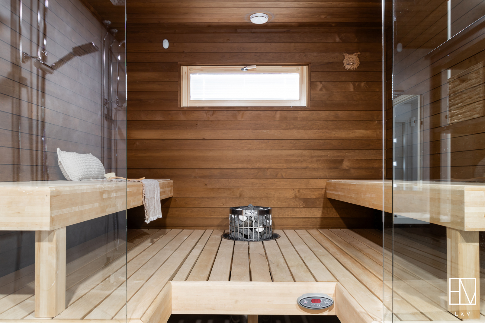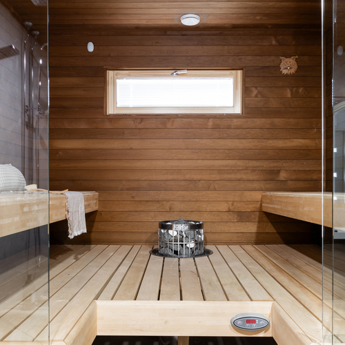 SähkökiuasUpea lasiseinällä varustettu sauna.