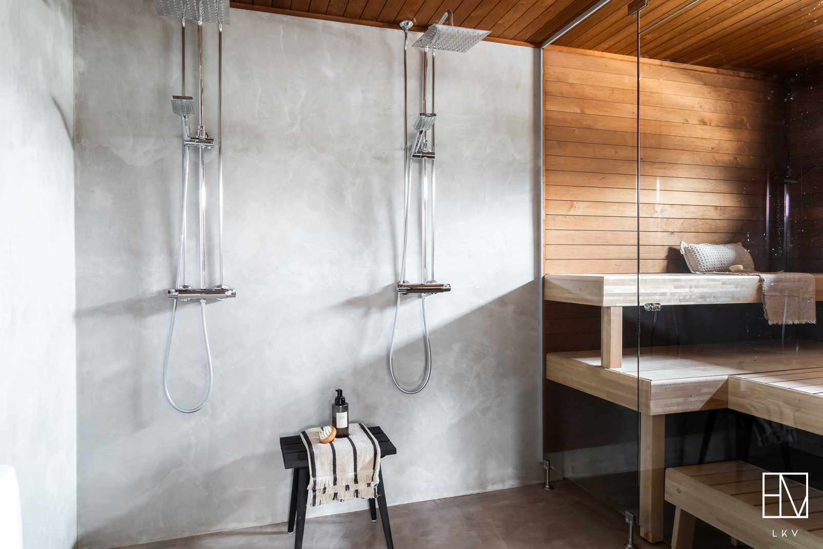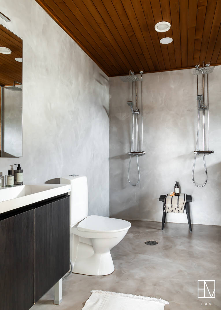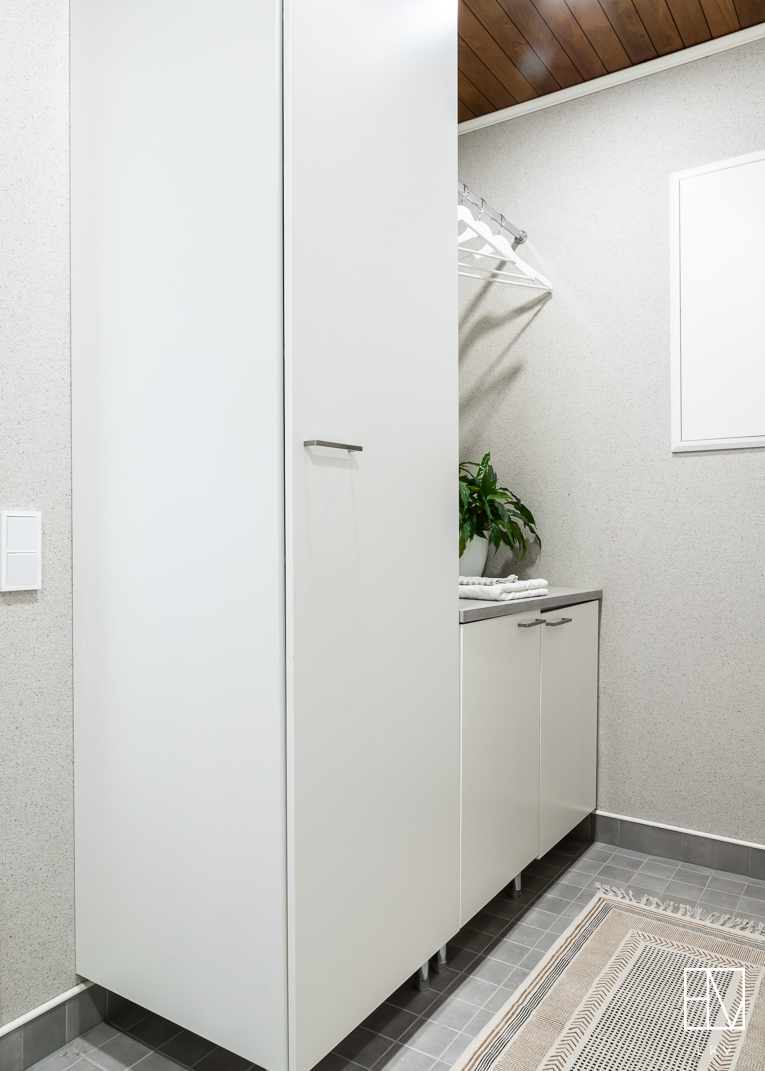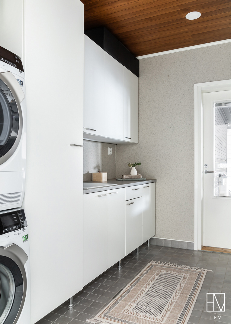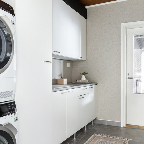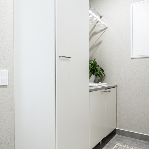 Makuuhuoneita on kolme ja pieninkin niistä on reilun kokoinen, yli 9 m². Kodinhoitohuone on suunniteltu arjen sujuvuutta ajatellen ja sieltä on suora kulku ulos. Kylpyhuoneessa on kaksi suihkua sekä wc-istuin. Sauna viimeistelee kokonaisuuden upealla lasiseinällään. Lisäksi asunnossa on erillinen wc.