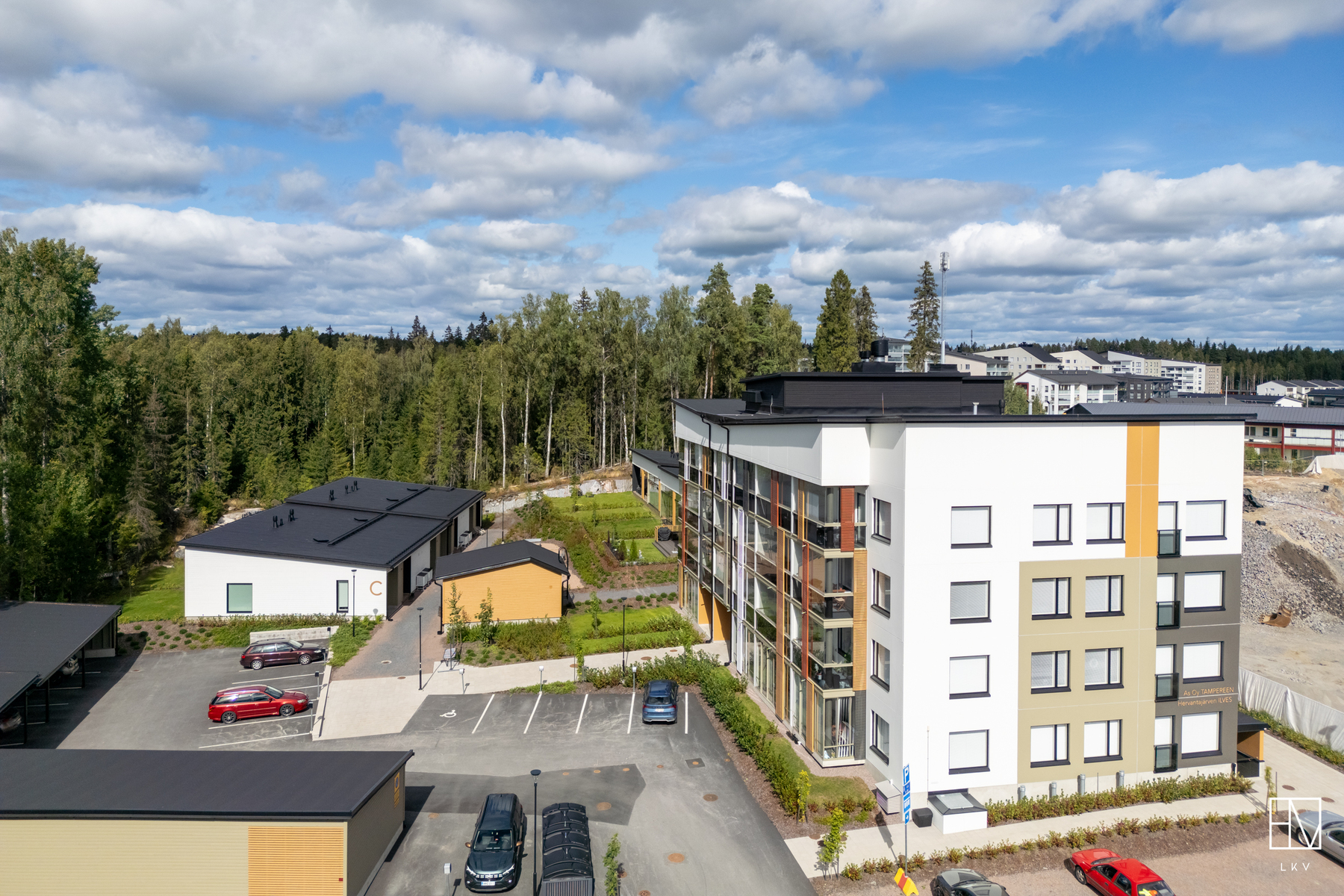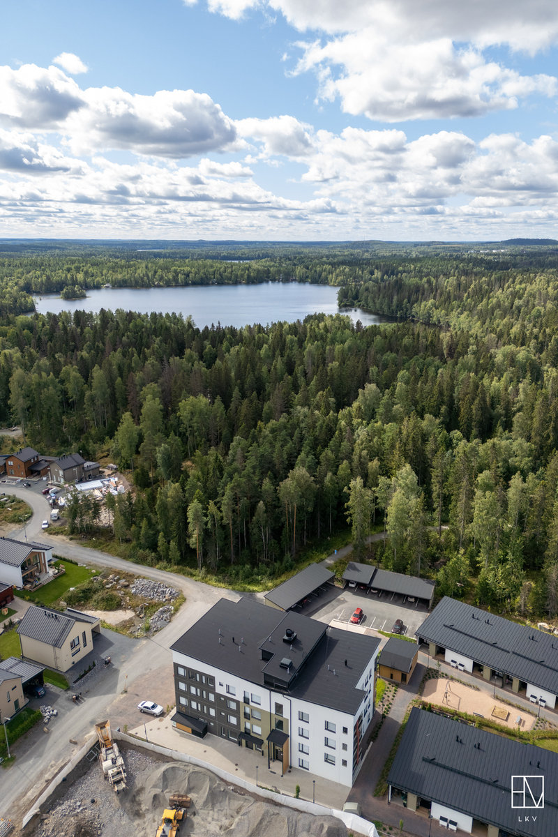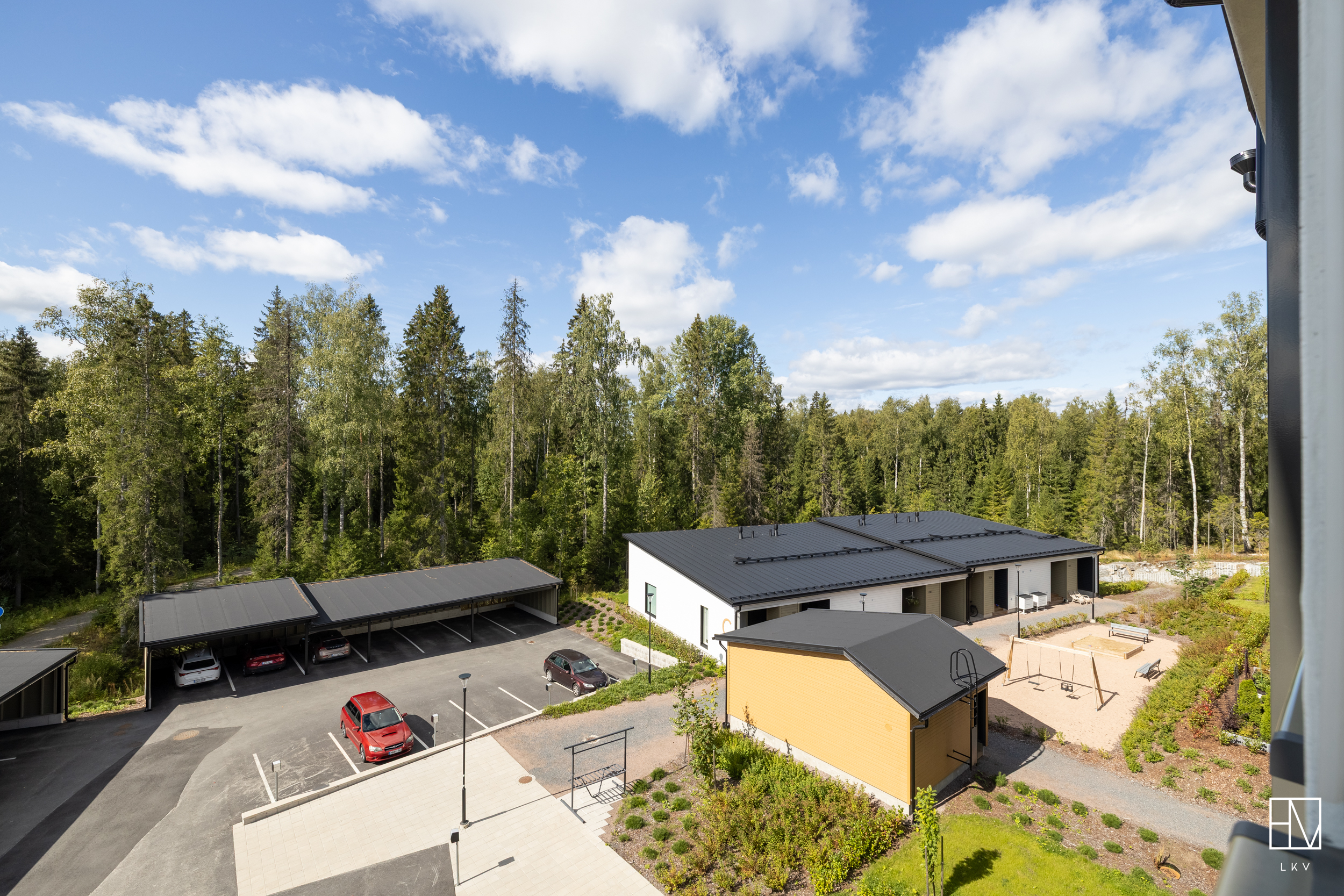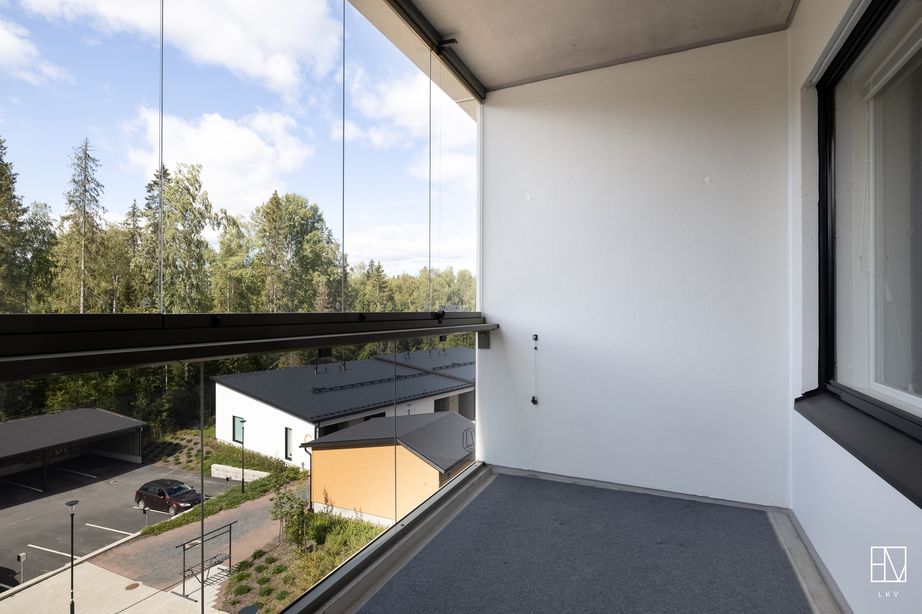 Tummanpuhuvasta kodista löytyy runsaasti säilytystilaa kaapein ja jokaiselle asunnolle kuuluu oma häkkivarasto. Tyylikkään keittiön varusteluun kuuluvat mm. jääkaappipakastin, induktioliesitaso ja erillisuuni, astianpesukone paikka mikrolle sekä liesituuletin. Keittiön edustalle saat mahtumaan ruokapöydän ja tila yhdistyy olohuoneeseen, josta näkymät avautuvat vehreää metsämaisemaa kohti. Makuuhuoneeseen on kaksi ovea sängyn molemmin puolin ja säilytystilaa löytyy kaapein. Hotellimaiseen kylpyhuoneeseen on valittu tummalaatoitus ja ehdotonta lisämukavuutta tuovat sadesuihku sekä lattialämmitys hulppeaa saunaa unohtamatta. Koko asunnon levyinen lasitettu parveke tarjoaa yhden "lisähuoneen" aikaisesta keväästä pitkälle syksyyn ja ihanan rauhoittavat metsämaisemat tasapainottavat arkea. Kaikkinensa asunto on miltei uuden veroinen ja avaa nyt ovensa seuraavan perheen kodiksi.