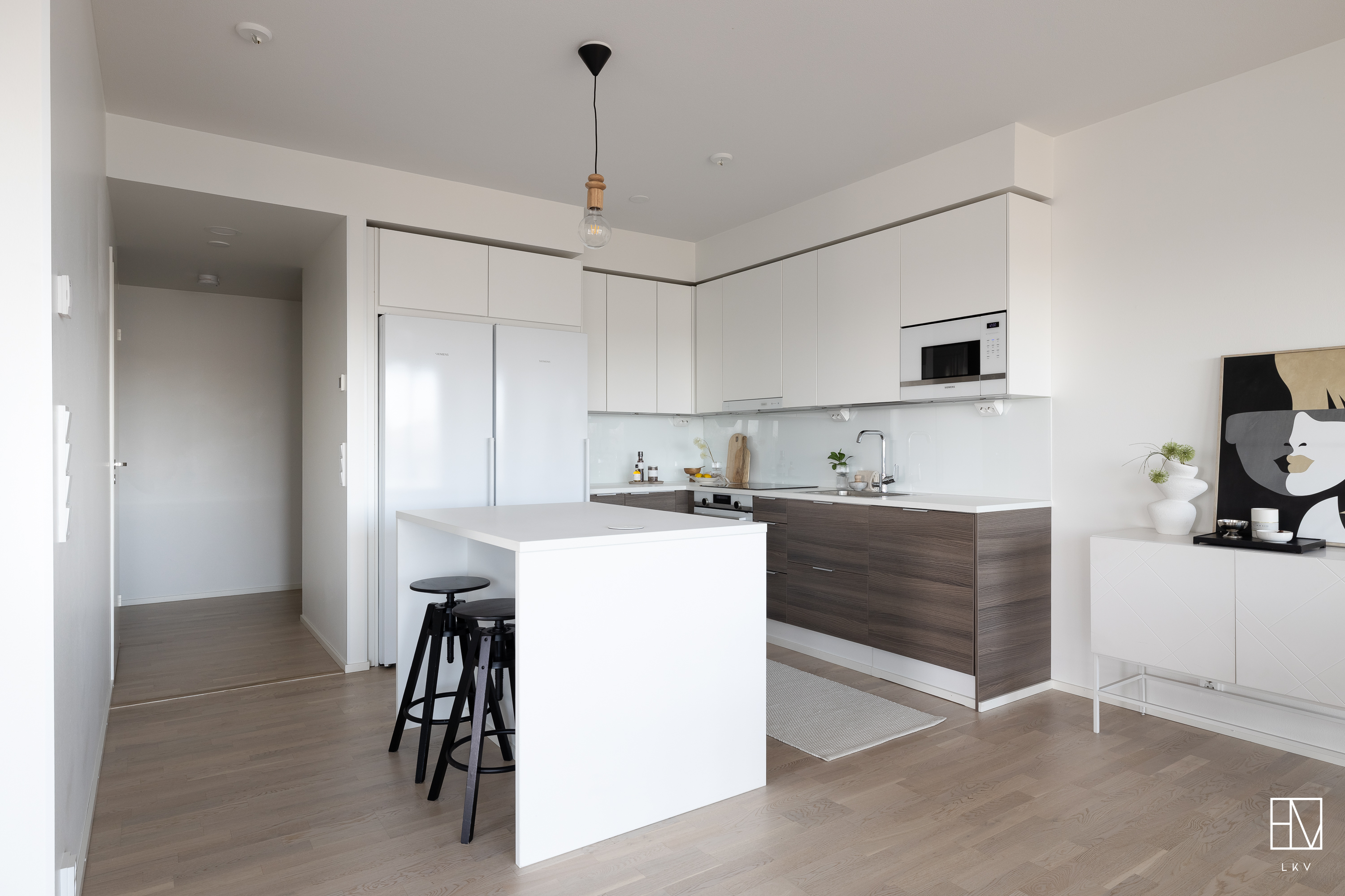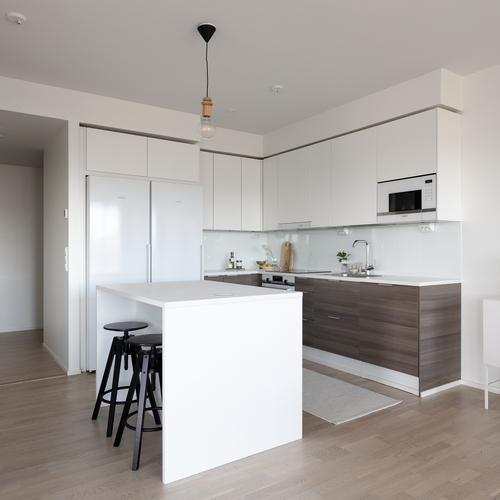 Varustus: induktiotaso, kalusteuuni, iso jääkaappi, iso pakastin, liesikupu, integroitu astianpesukone, mikroaaltouuni, saareke. Valkoiset yläkaapit, tummat alakaapit.