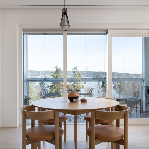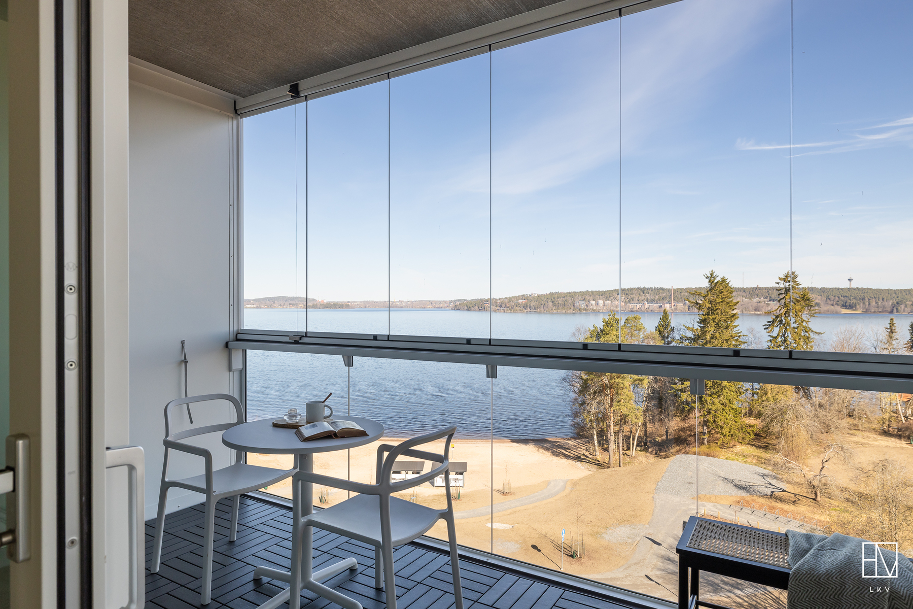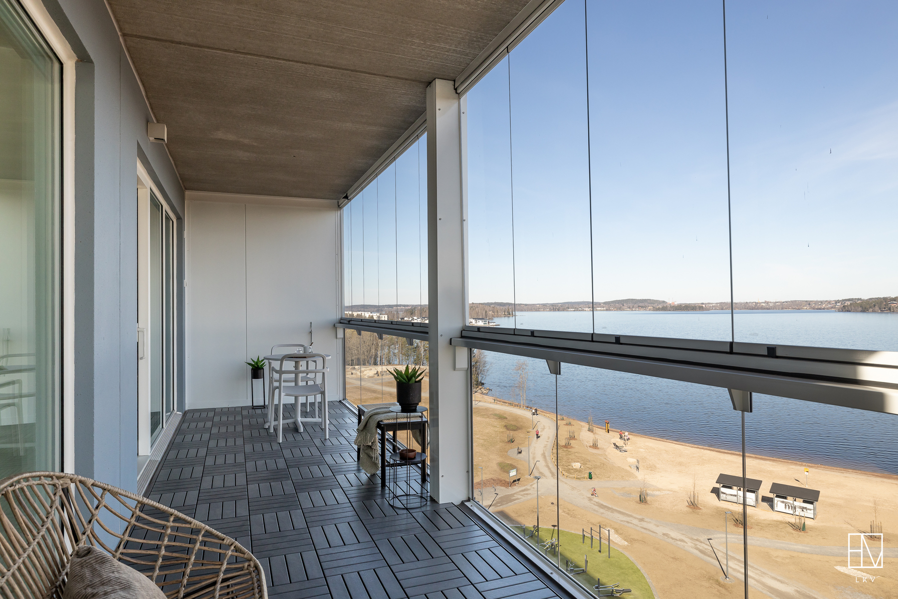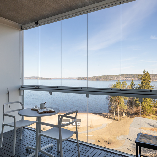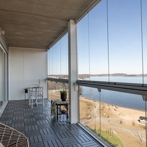 Kodin kruunaa tilava, noin 16,50 m² suuruinen lasitettu parveke, jolta upea järvimaisema. Isolle parvekkeelle mahtuu reilumpikin ruokaryhmä aurinkotuolien lisäksi.