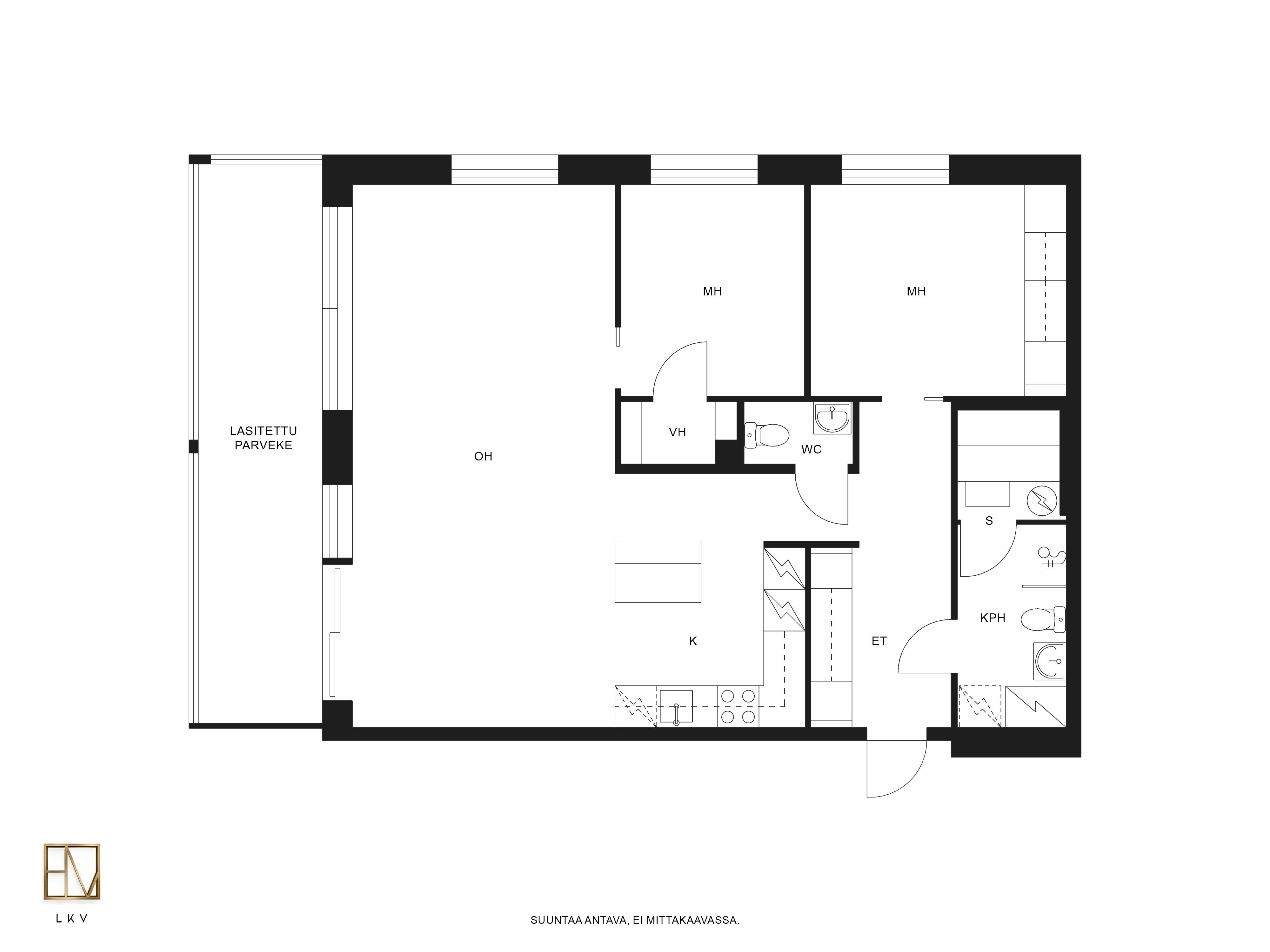 Varustus: suihku, wc, lavuaari, peilikaappi, paikka pesukoneelle.