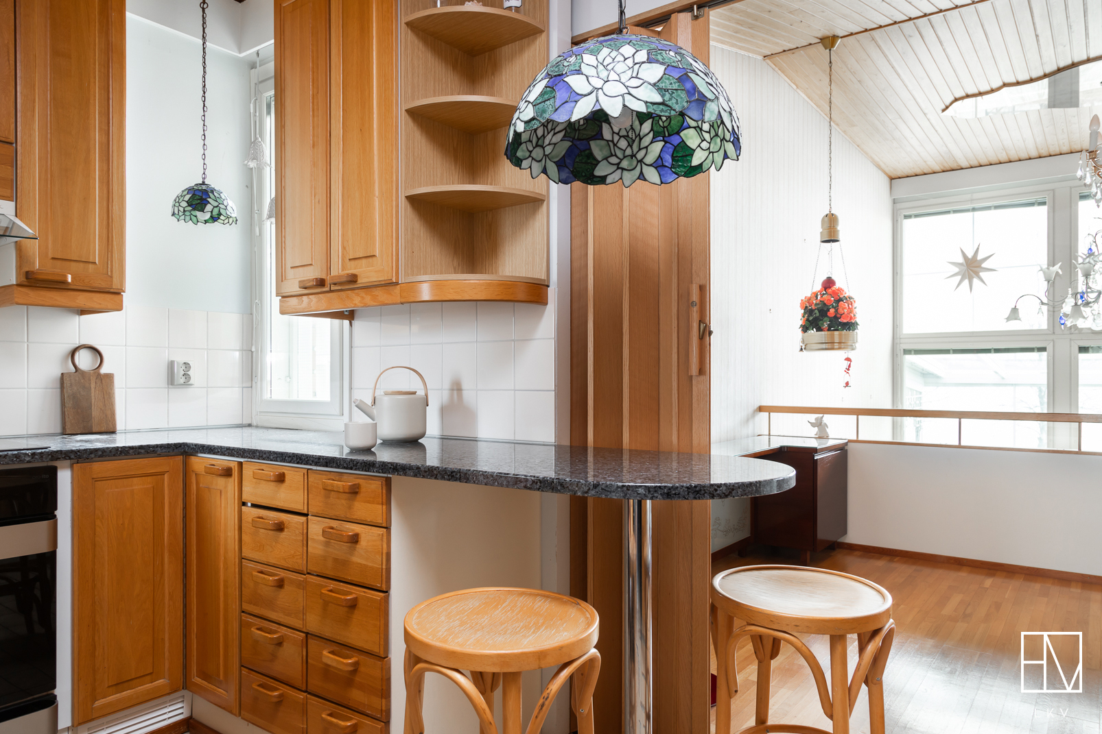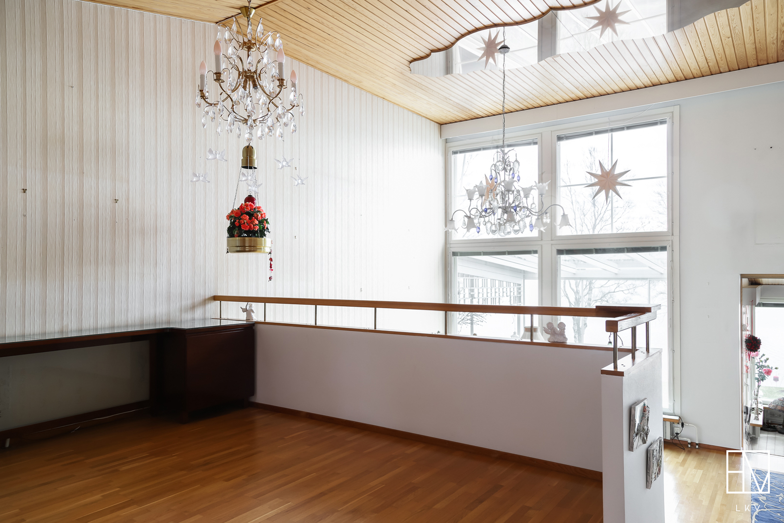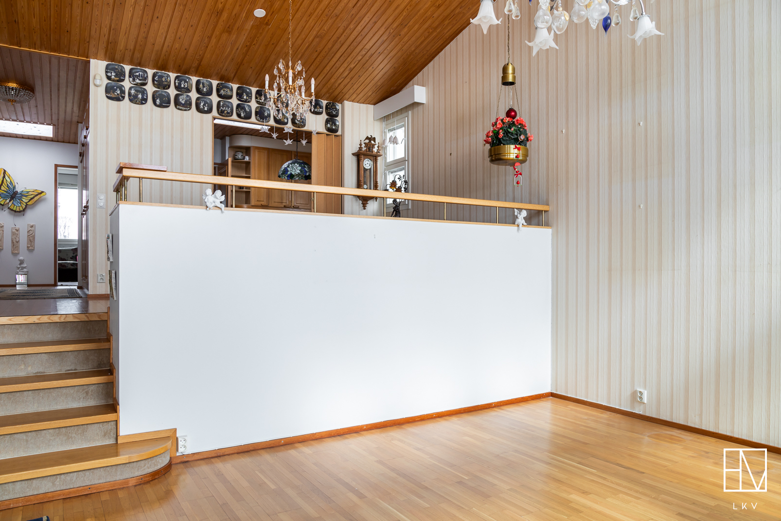 Tämä tilava koti on toteutettu näyttävästi useaan tasoon, mikä luo persoonallisen ja arkkitehtonisesti mielenkiintoisen kokonaisuuden. Suuri huonekorkeus korostaa tilan tuntua ja tuo runsaasti luonnonvaloa sisään.