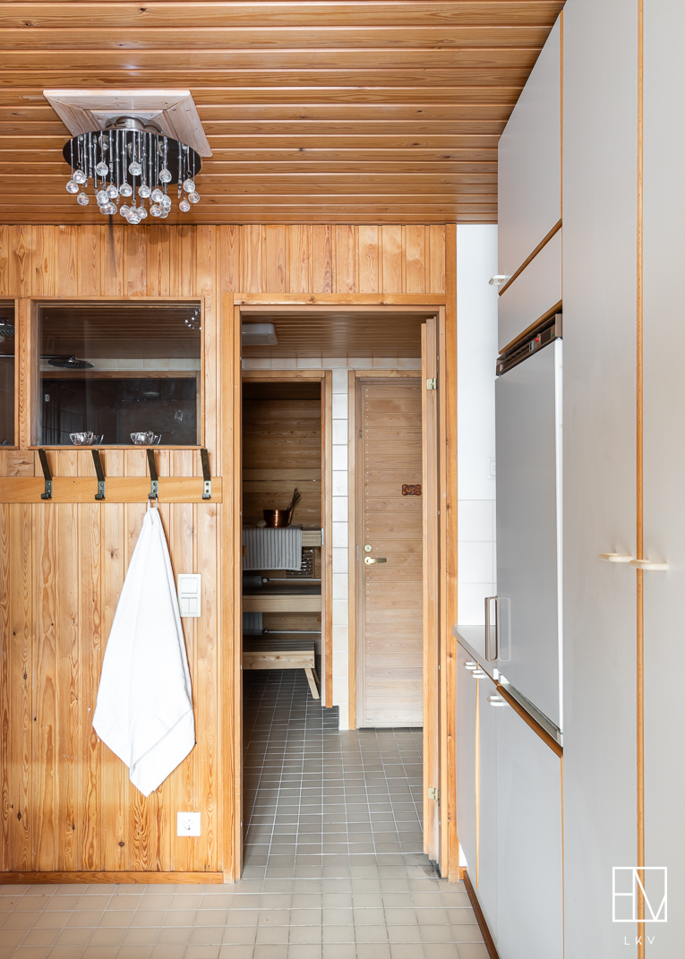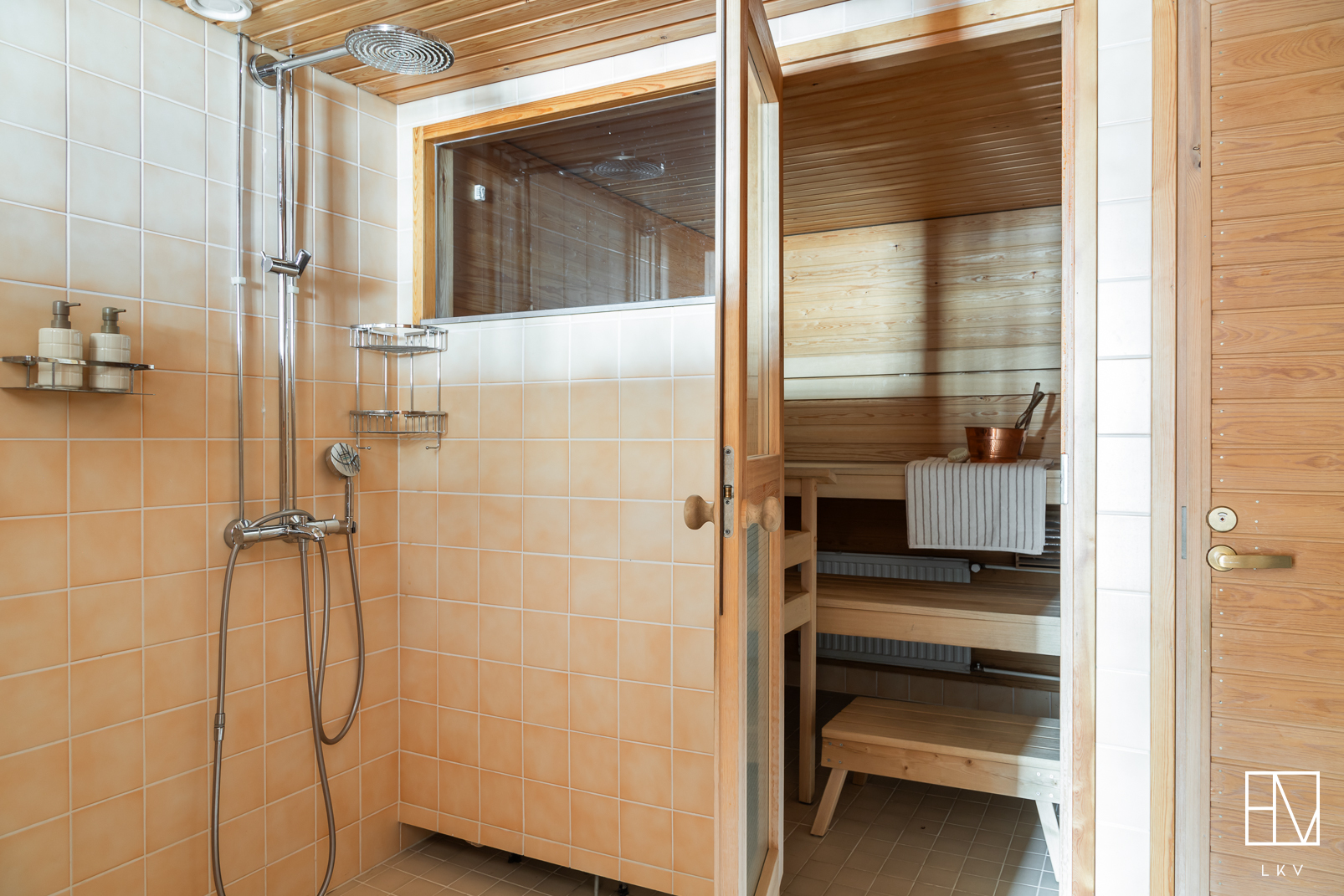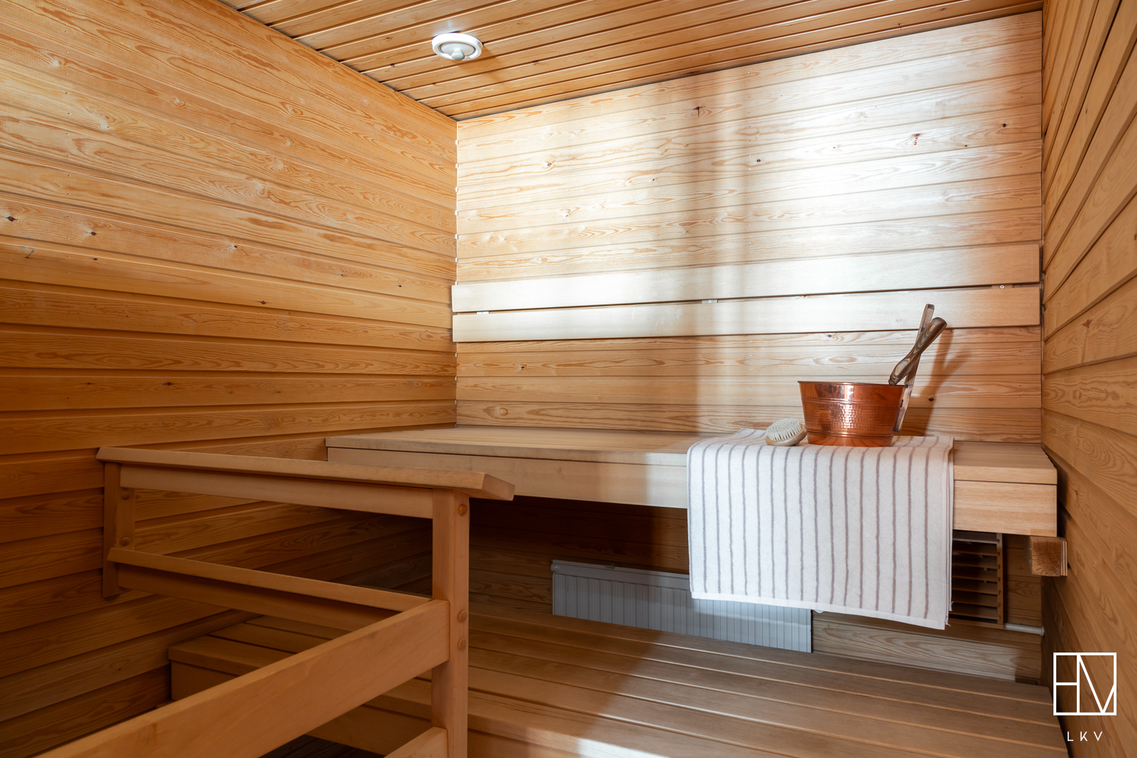 Omassa rauhassaan sijaitseva saunaosasto takkahuoneineen tarjoaa oman rauhallisen tilansa rentoutumiseen. Takkahuoneesta on kulku lasitetulle terassille, josta avautuvat upeat näkymät Pyhäjärvelle – täydellinen paikka nauttia auringonlaskuista ja järvimaiseman rauhasta pitkälle syksyyn. Asunnossa on runsaasti kaappitilaa sekä kaksi vaatehuonetta. Lisäksi kokonaisuuteen kuuluu autotalli sekä erillinen varastotila.