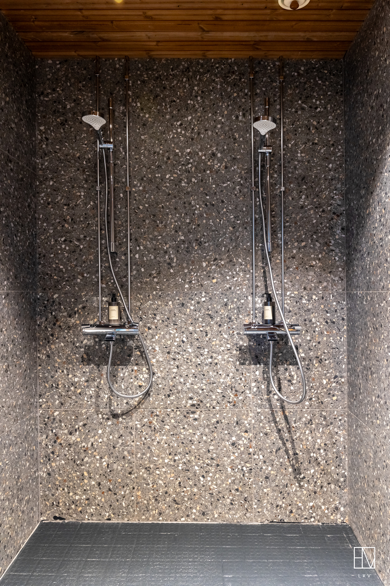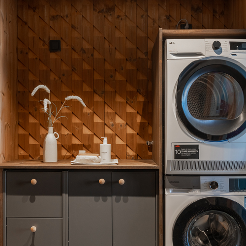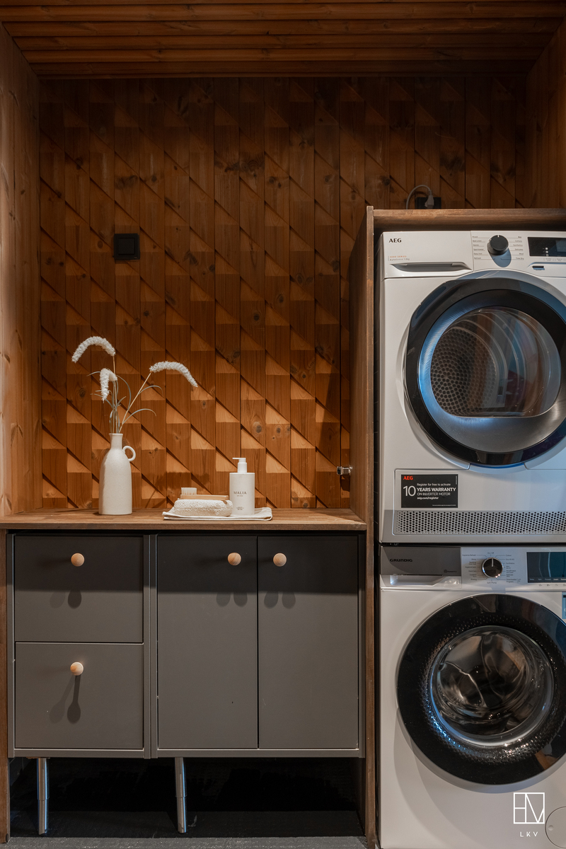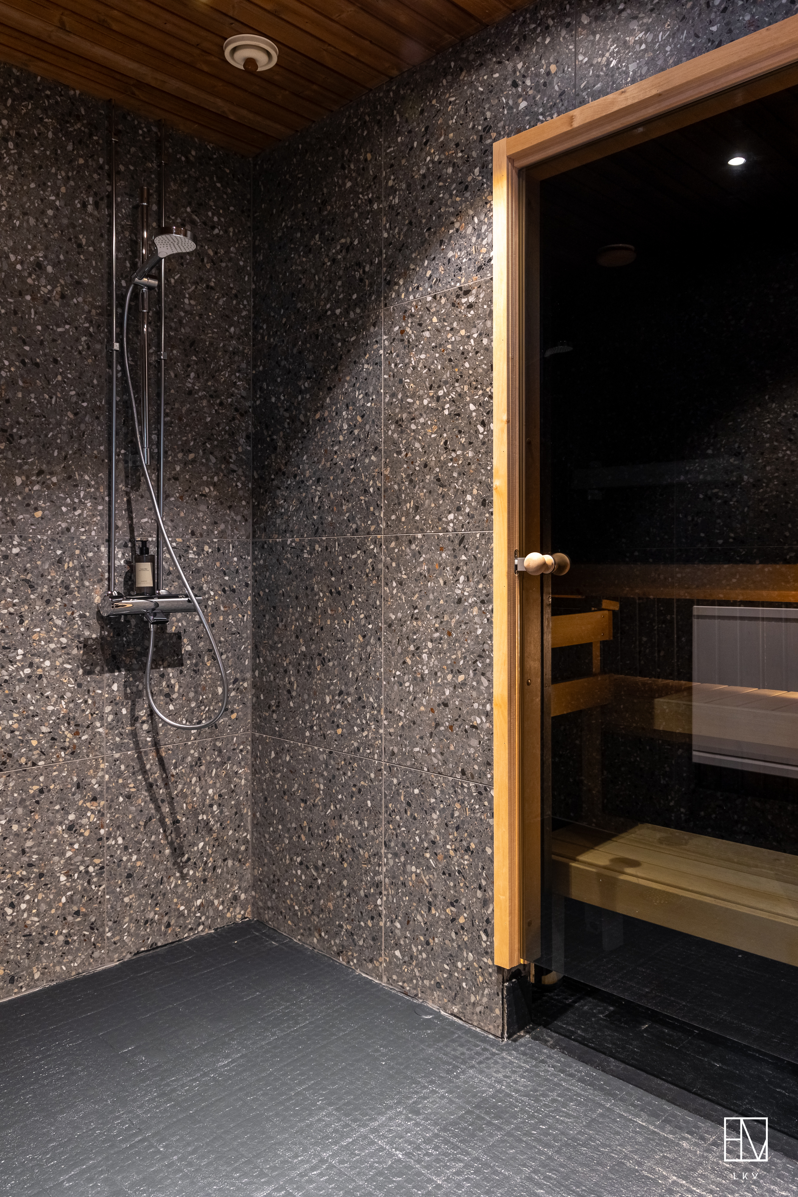 Kylpyhuoneessa myös paikka pesutornille ja kaappi- ja laskutilaa.