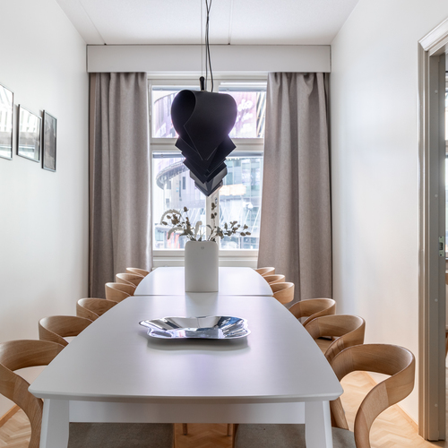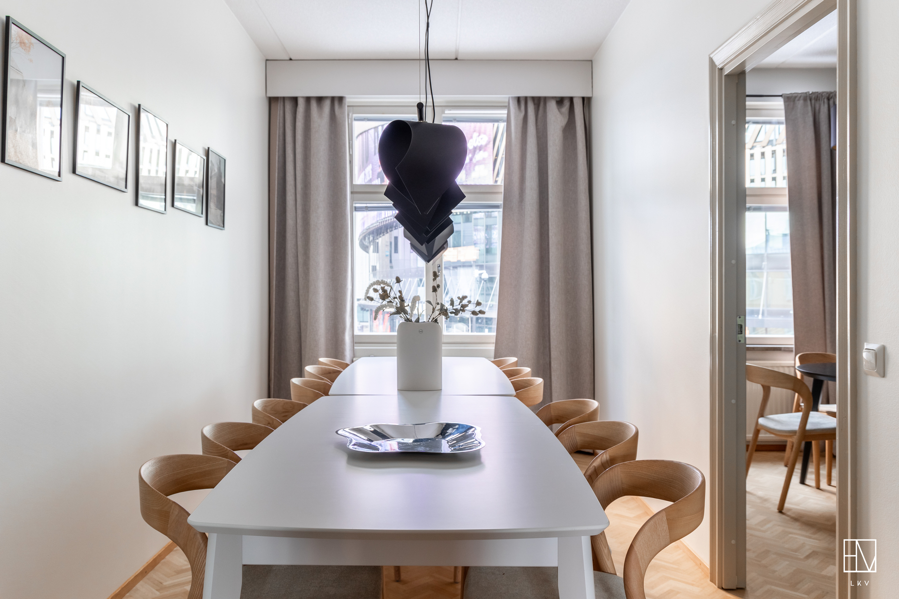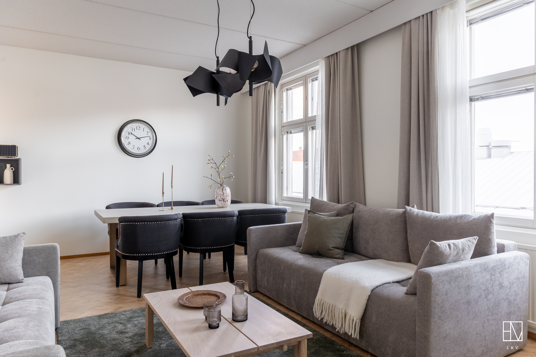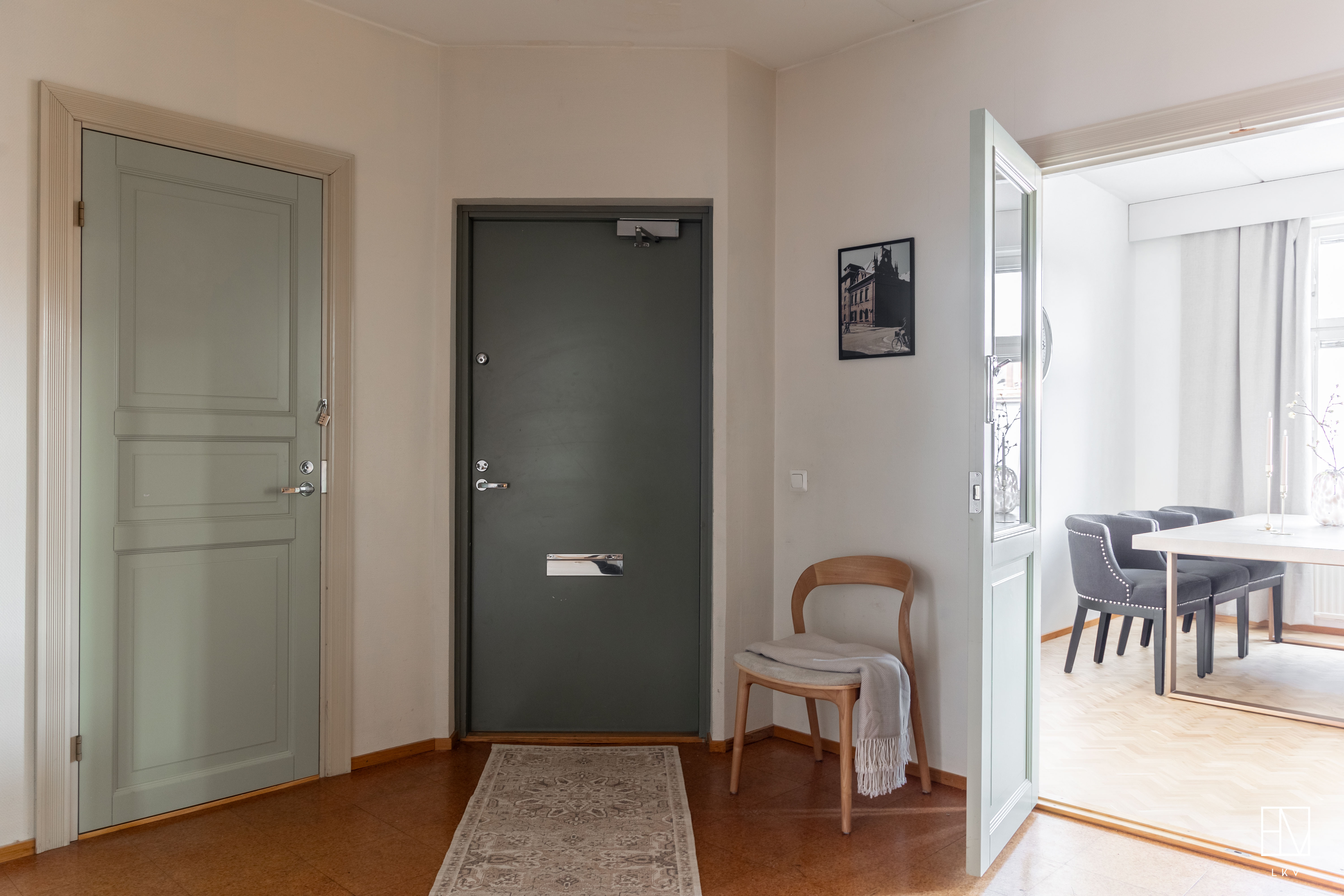 Asuminen tässä osoitteessa on rauhallista, sillä tämä asunto on rappukäytävän ainoa asuinhuoneisto. Asunto on kolmannessa kerroksessa ja siinä on neljä makuuhuonetta, kaksi vaatehuonetta, kaksi wc:tä, kylpyhuone, sauna sekä erillinen keittiö ja suuri olohuone. Sisäpihan puolella olevista ikkunoista on suora näkymä naapurissa olevaan Nokia Areenaan ja kadunpuoleisista on näkymä kohti naapuritaloja ja Ratinaa.