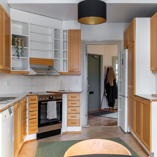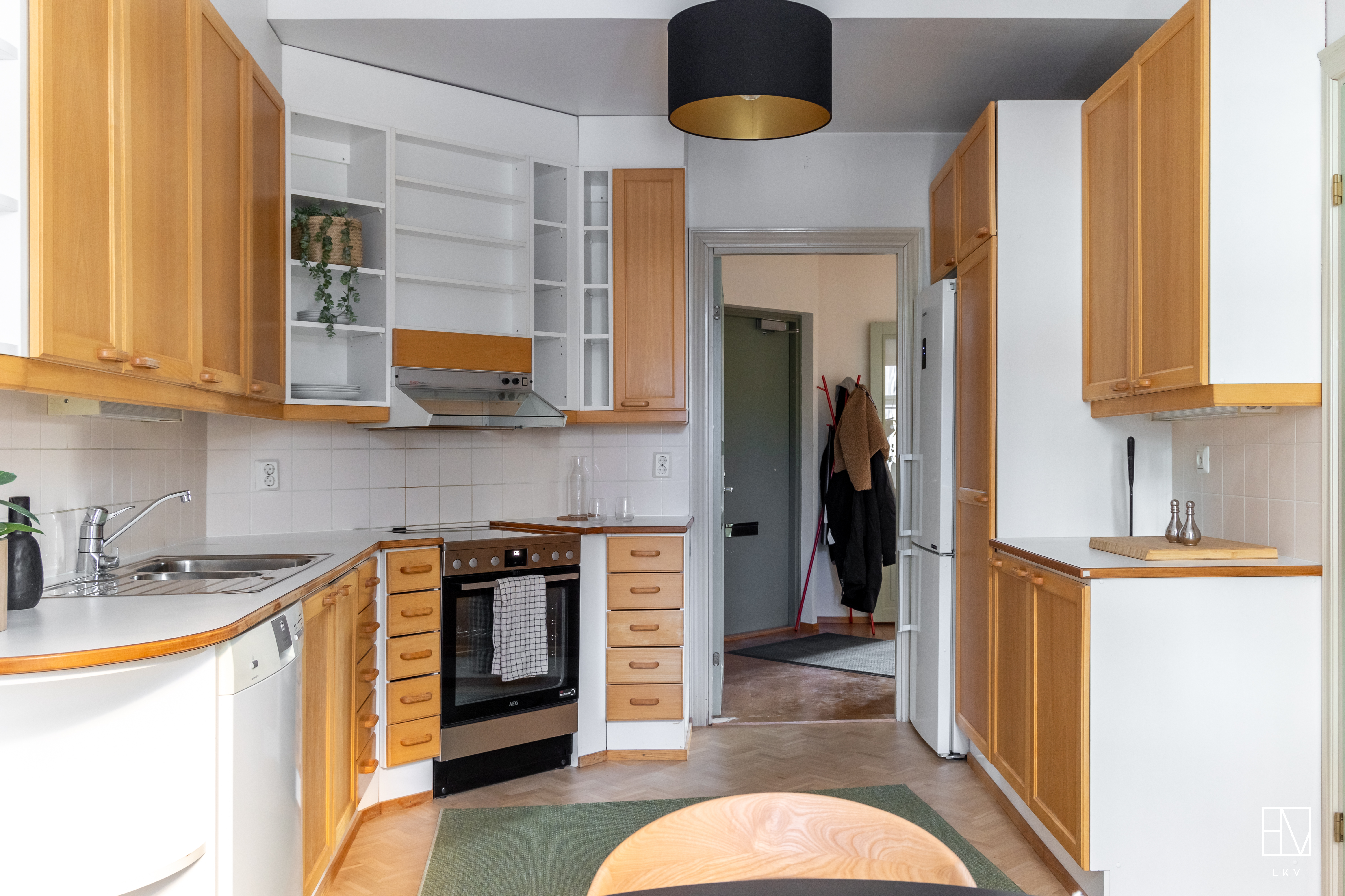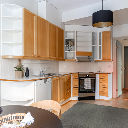 Liesituuletin, uuni/liesi, jääkaappipakastin ja astianepesukone.