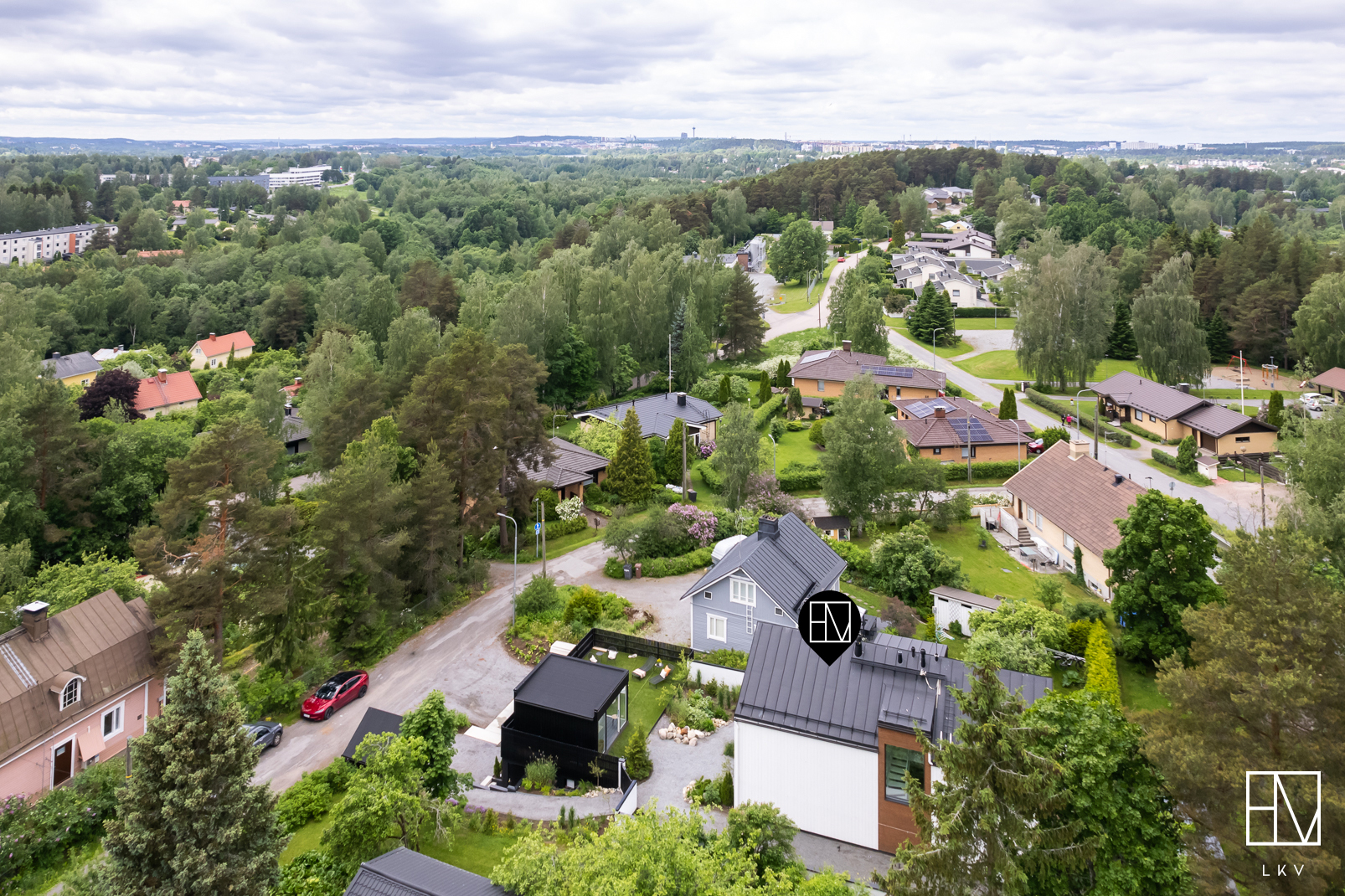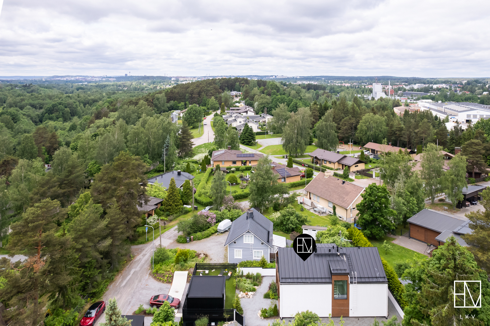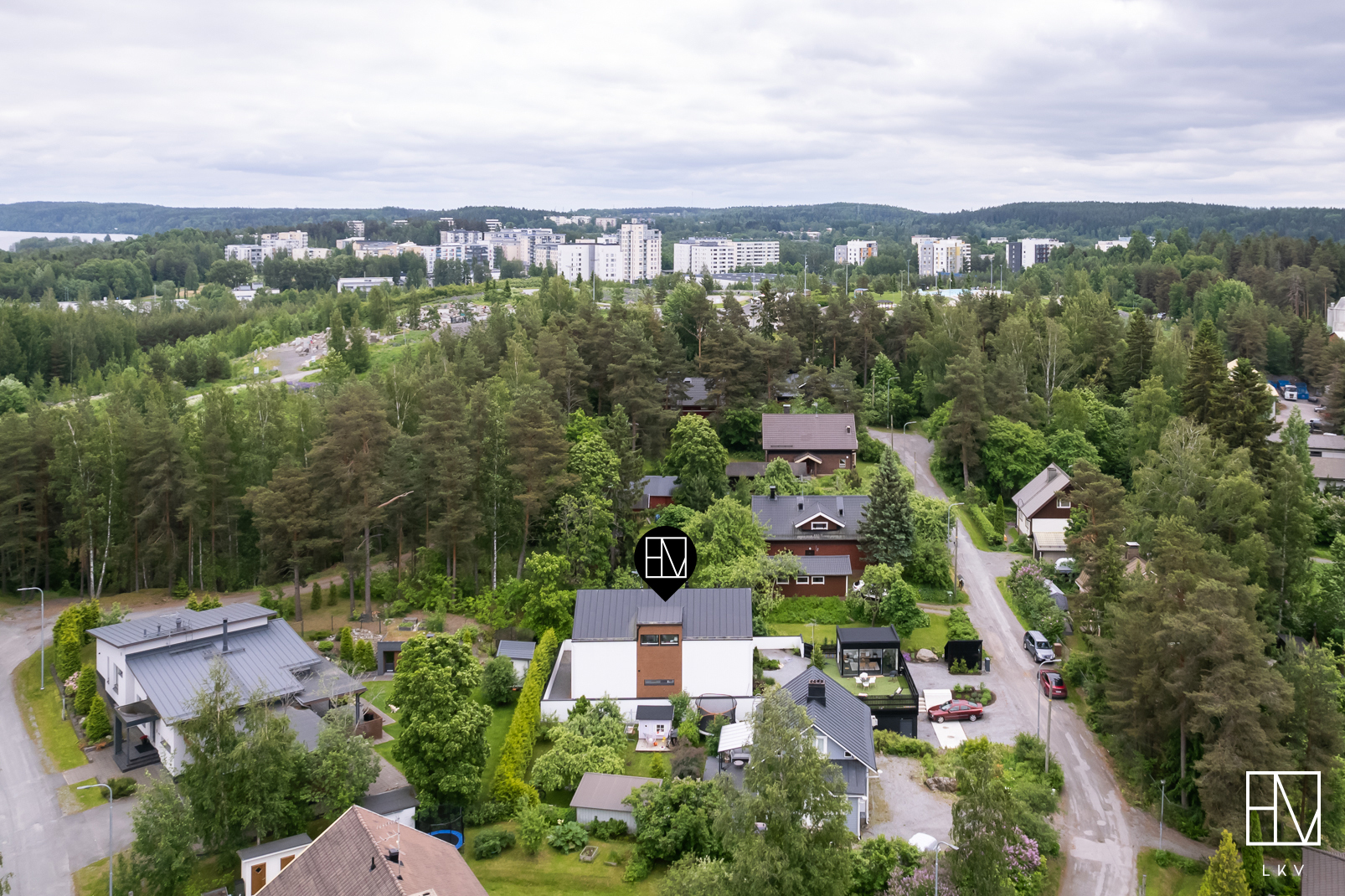Sijainti on rauhallinen mutta käytännöllinen. Arjen palvelut ja liikenneyhteydet löytyvät läheltä, mutta koti tarjoaa silti oman suojaisan pihapiirin.