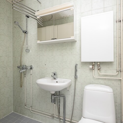 Varusteet: pesukoneliitäntä, wc-istuin, suihku, peilikaappi, kiinteät valaisimet