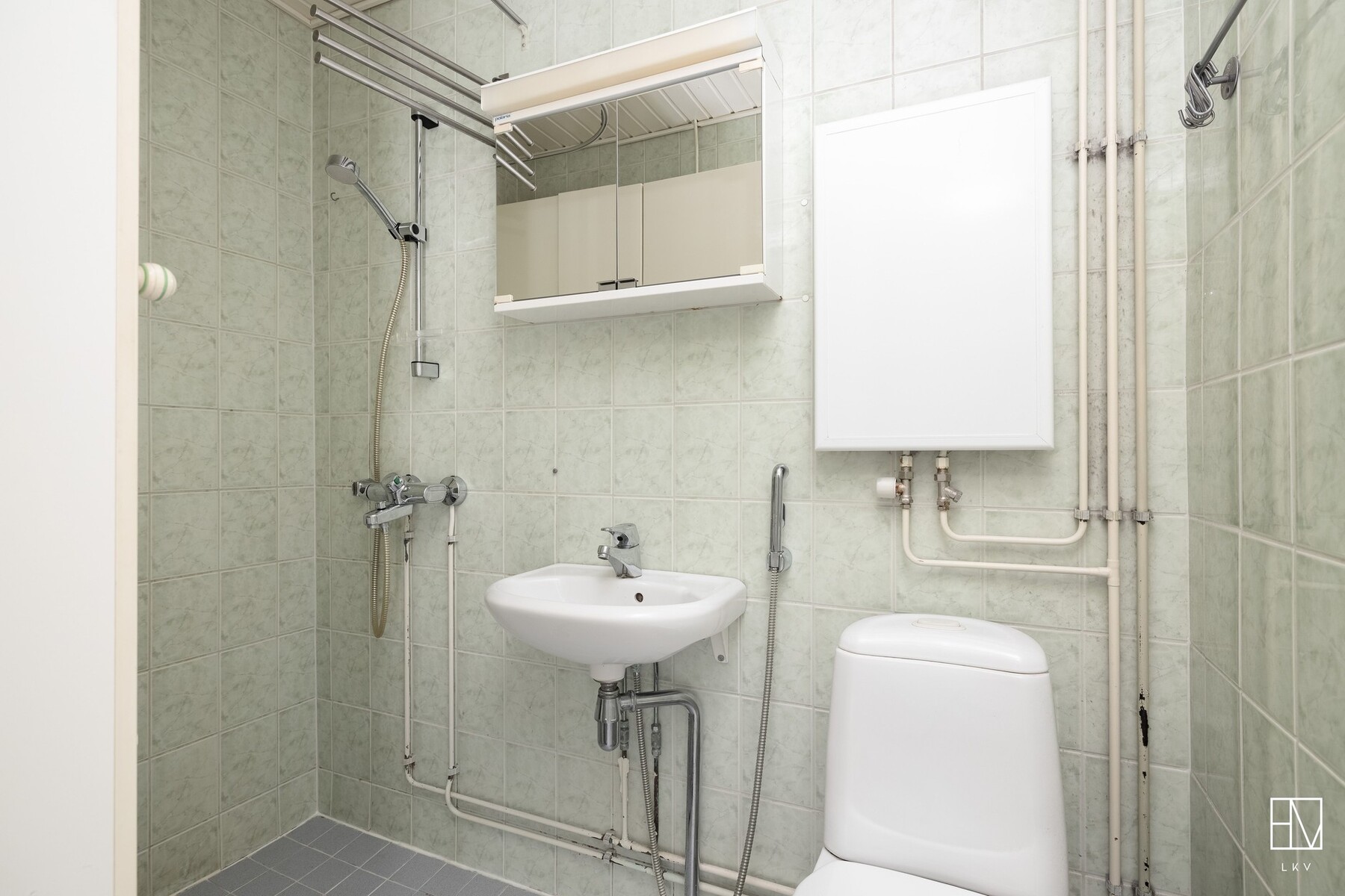 SIsälle asuntoon astuessasi saavut vaaleaan eteiseen, johon saa mukavasti säilytystilaa ulkovaatteille. Eteistä vastapäätä on asunnon tehokas kylpyhuone, johon mahtuu kaikki tarvittava – wc-istuin, suihku, peili ja allas, sekä pesukoneliitäntä. Kylpyhuone on uusittu yhtiön linjasaneerauksen yhteydessä vuonna 1999.