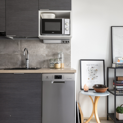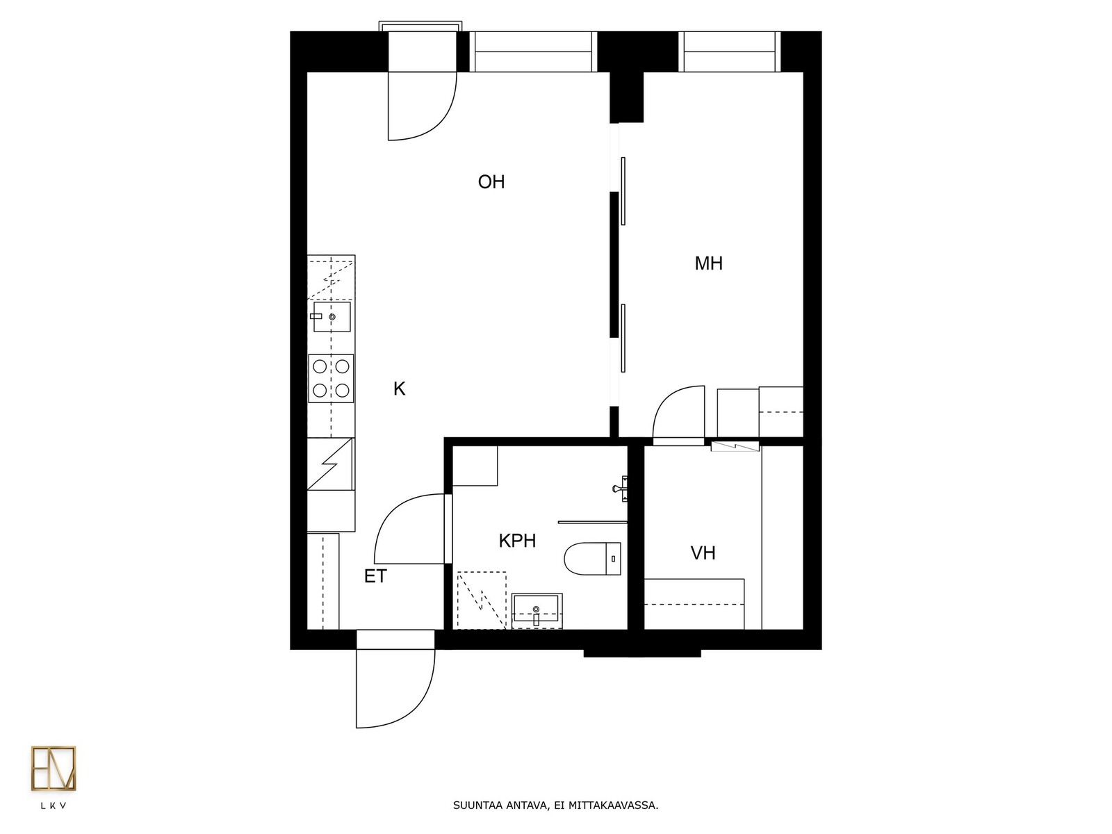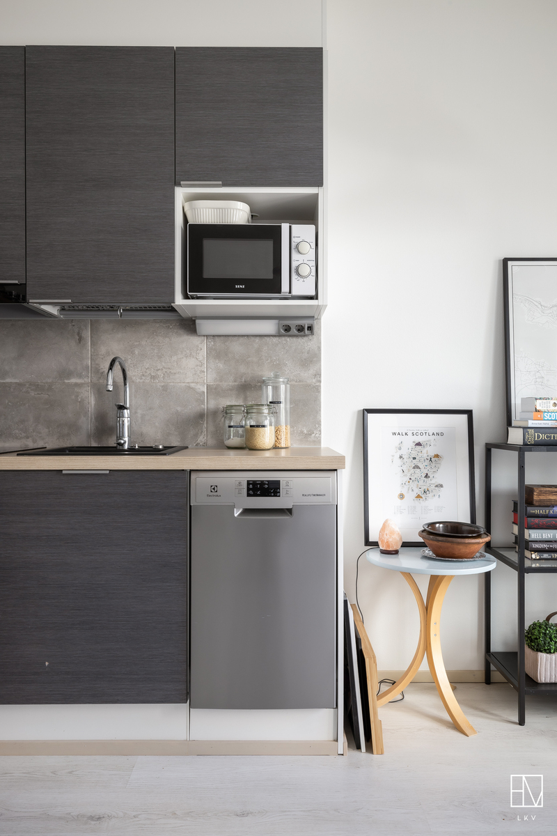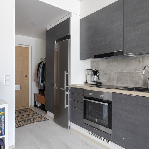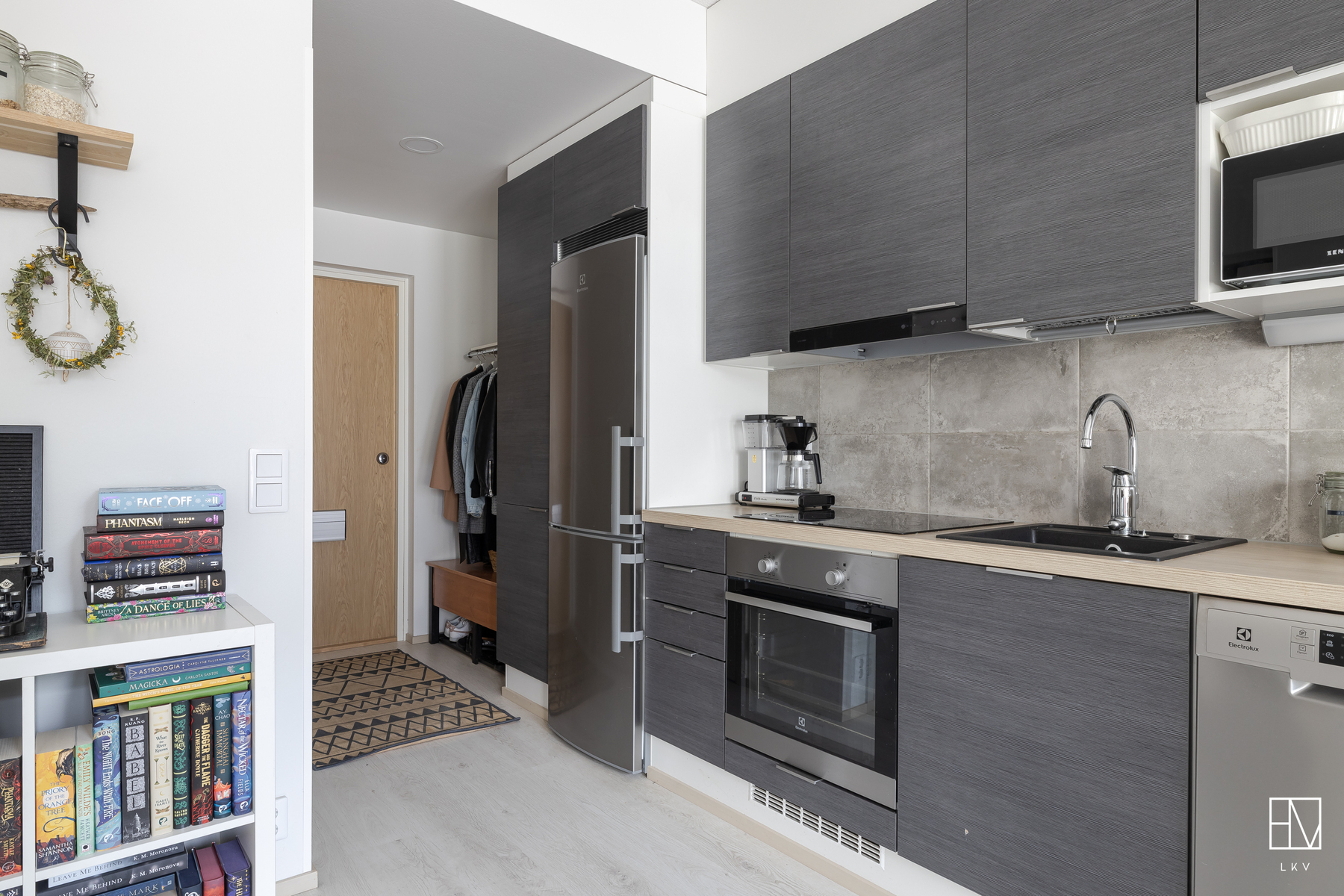 Tumman sävyinen avokeittiö yhdistyy olohuoneeseen. Makuuhuoneeseen mahtuu hyvin parisänky ja makuuhuoneen vieressä on todella hyvänkokoinen vaatehuone.