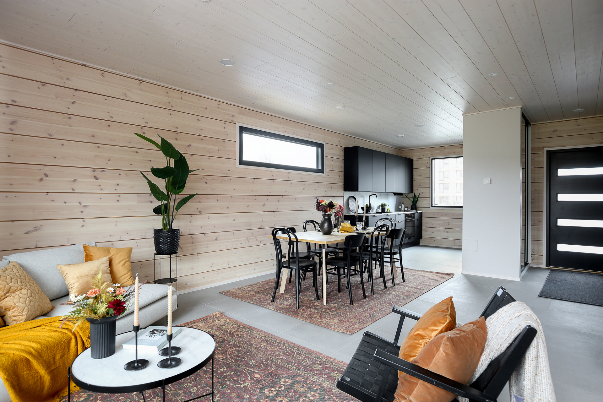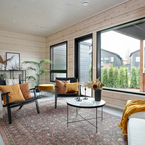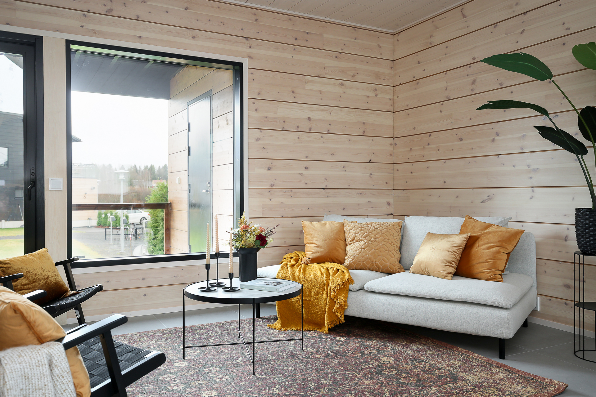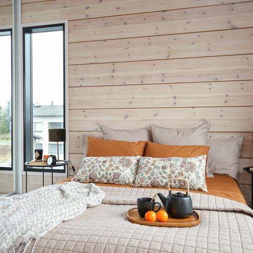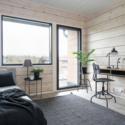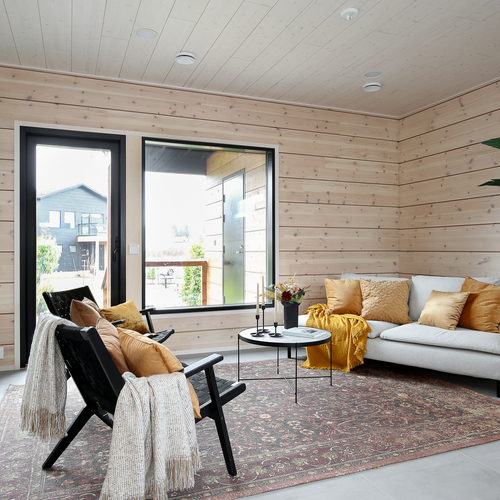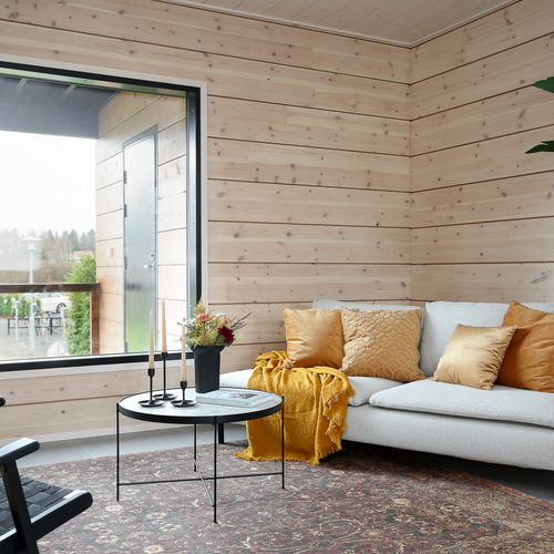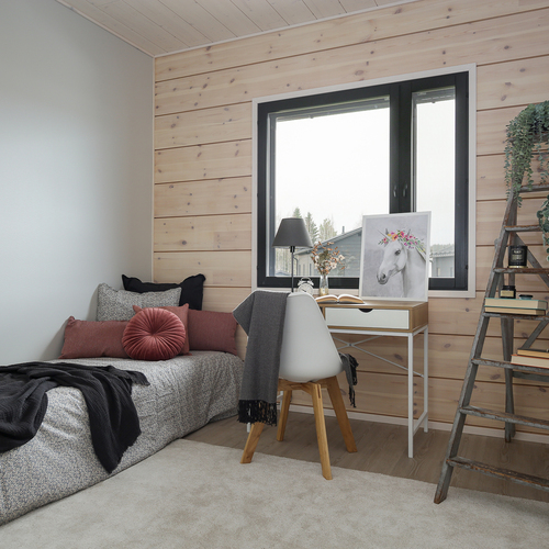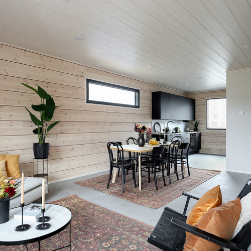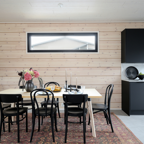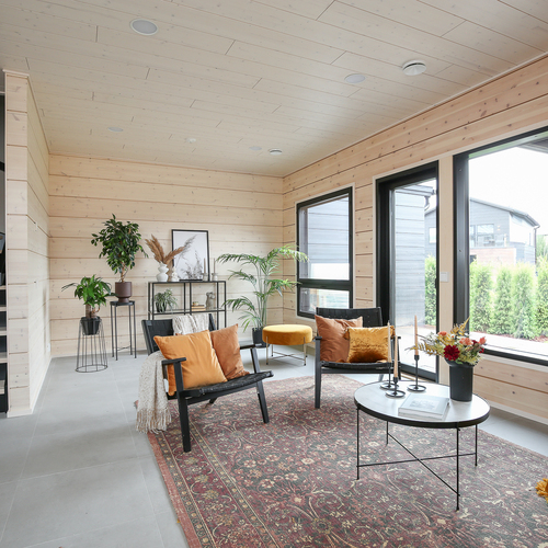 Seinät: Hirsiseinä/puupaneeli