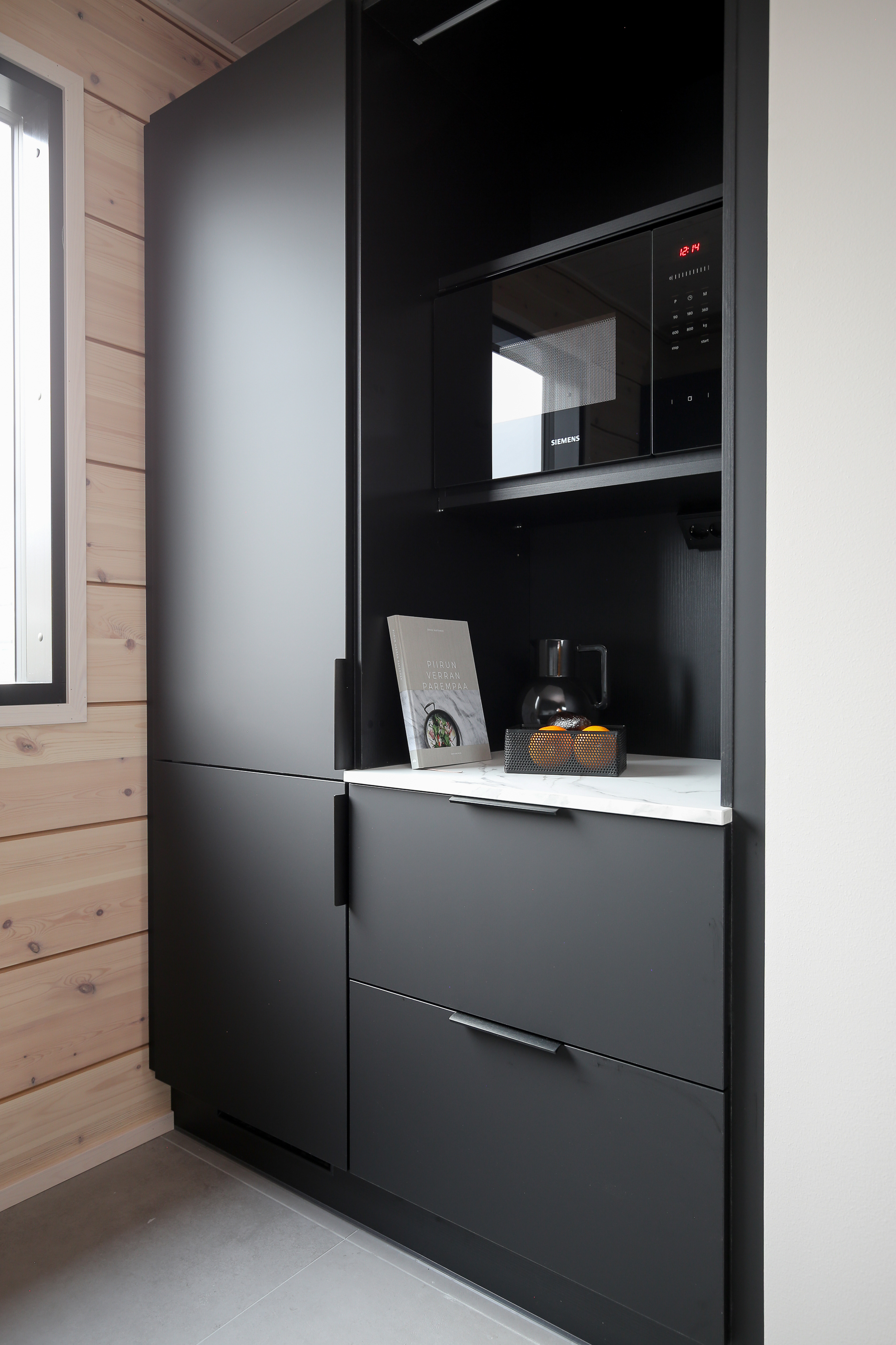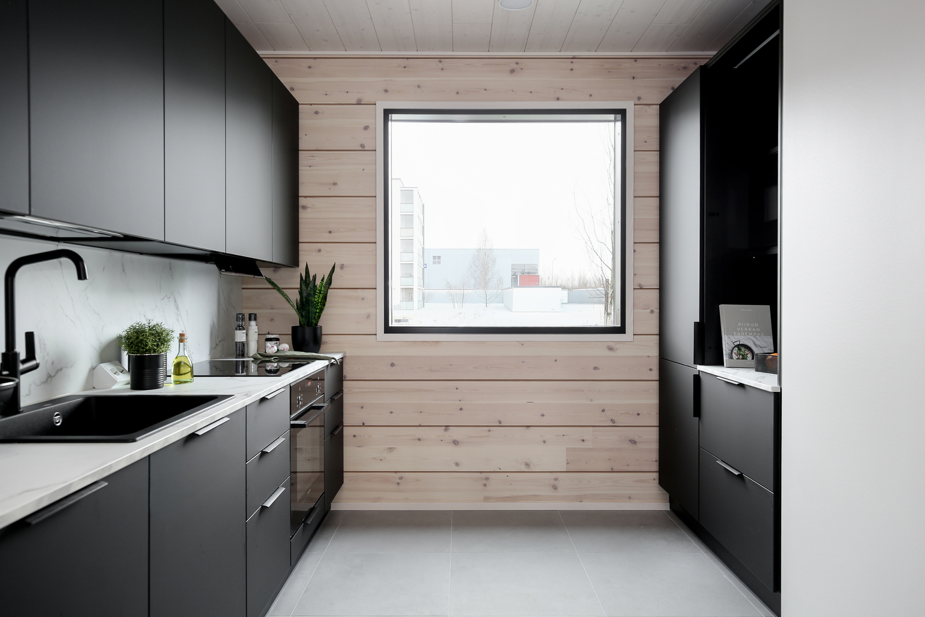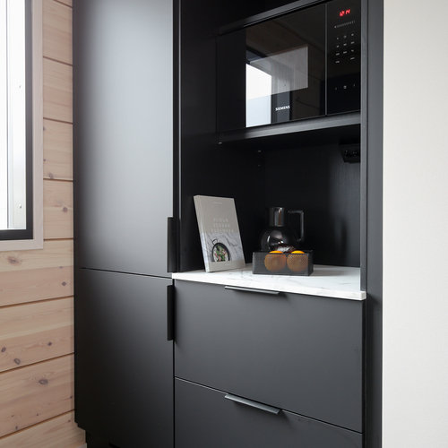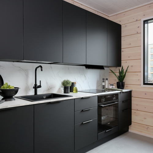 Tyylikäs avokeittiö on Puustelli-keittiöiden laadukasta tuotantoa. Laadukkaat kodinkoneet.