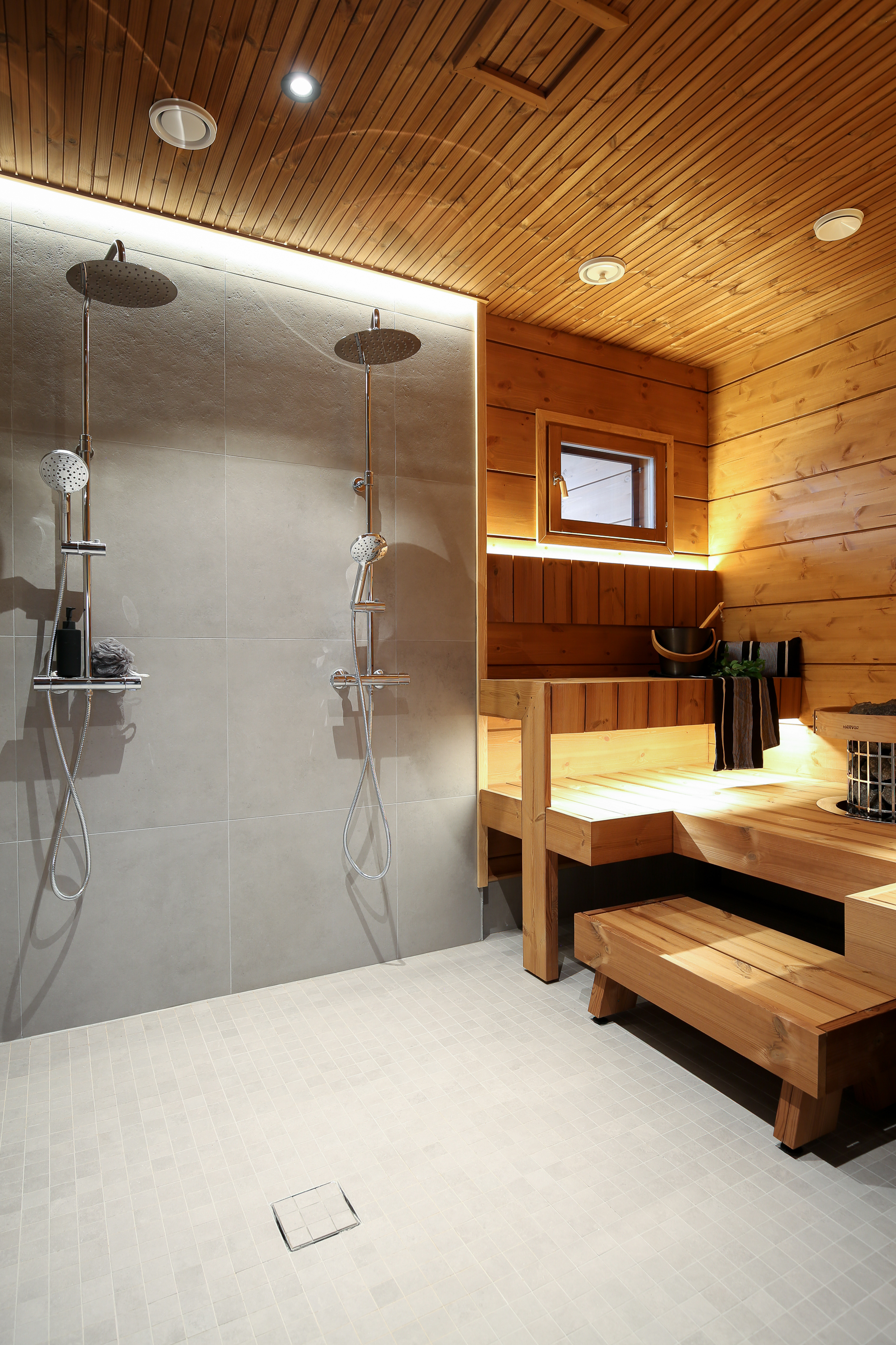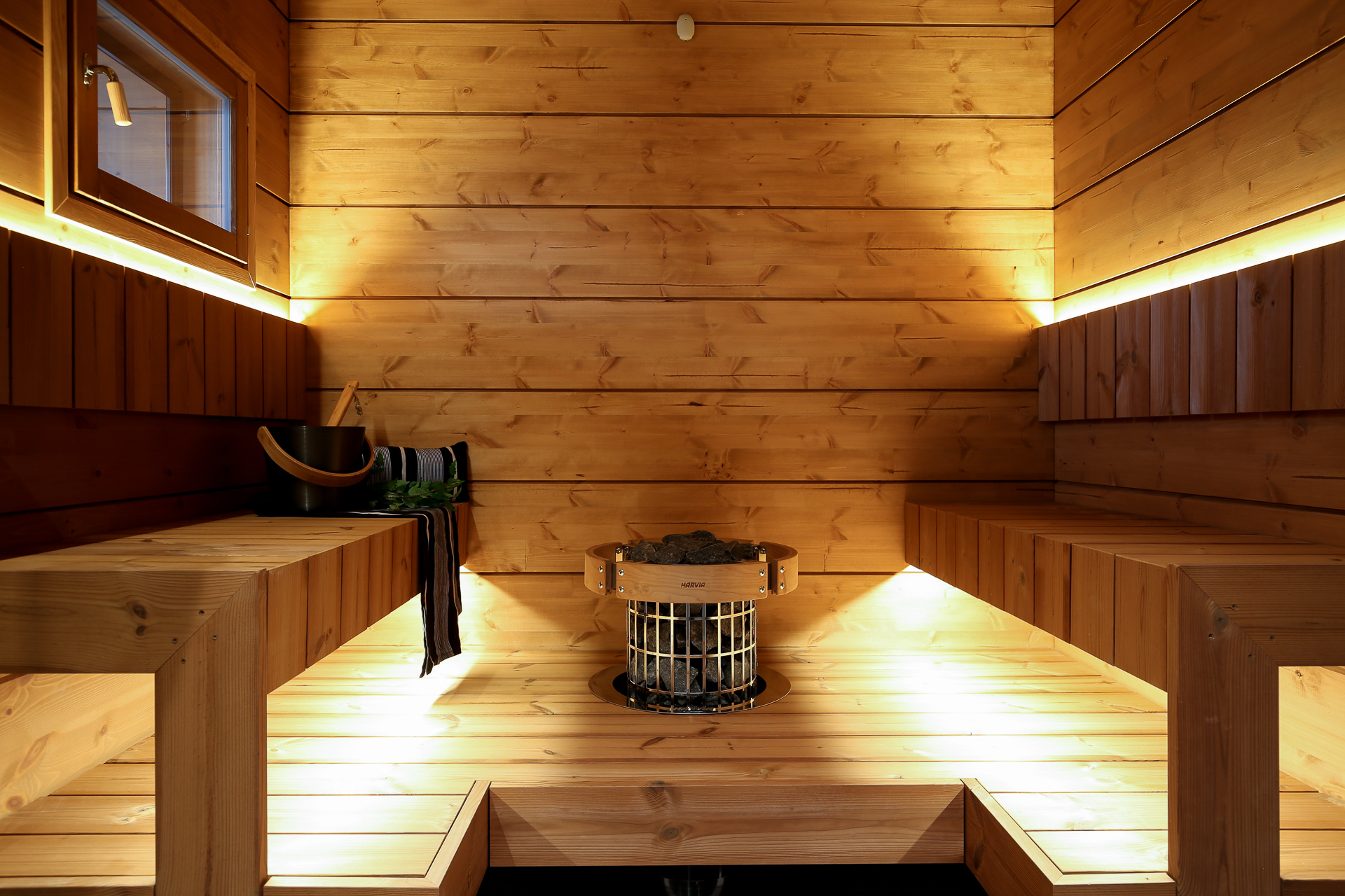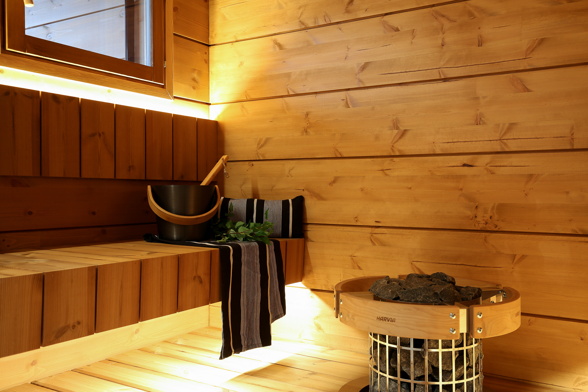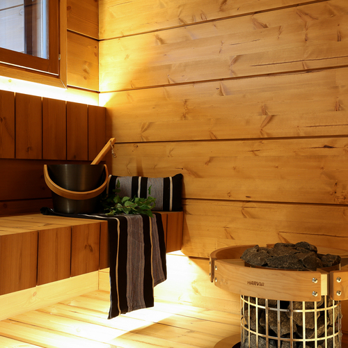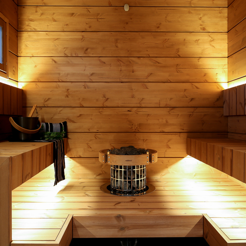 SähkökiuasTunnelmallinen sauna, jossa Harvian kiuas.