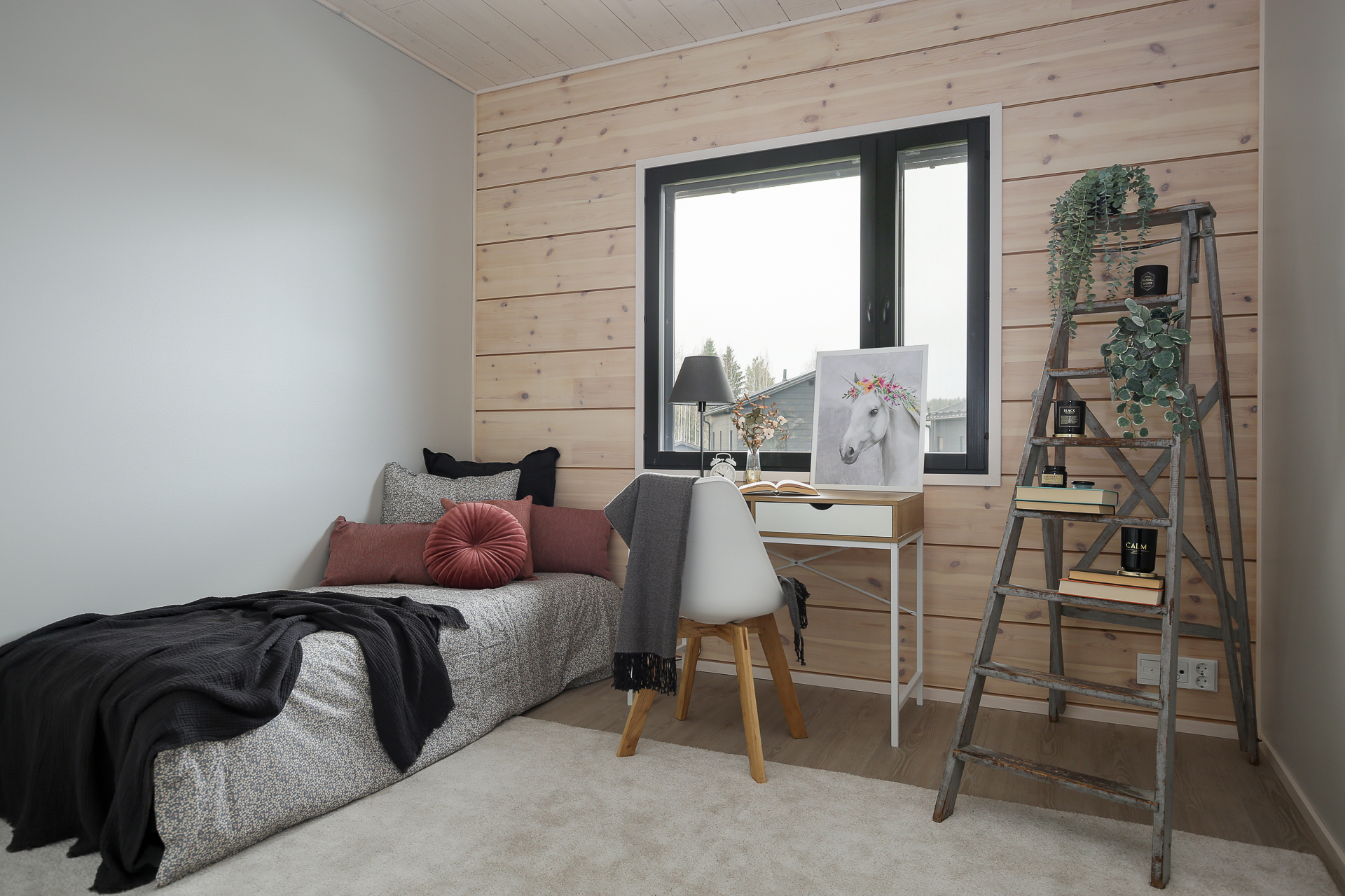Yläkerrassa 3 makuuhuonetta. Seinät maalattu/hirsivaha. Lattia on Vinyyli Tarkett iD Inspiration Click Oak Medium Beige.