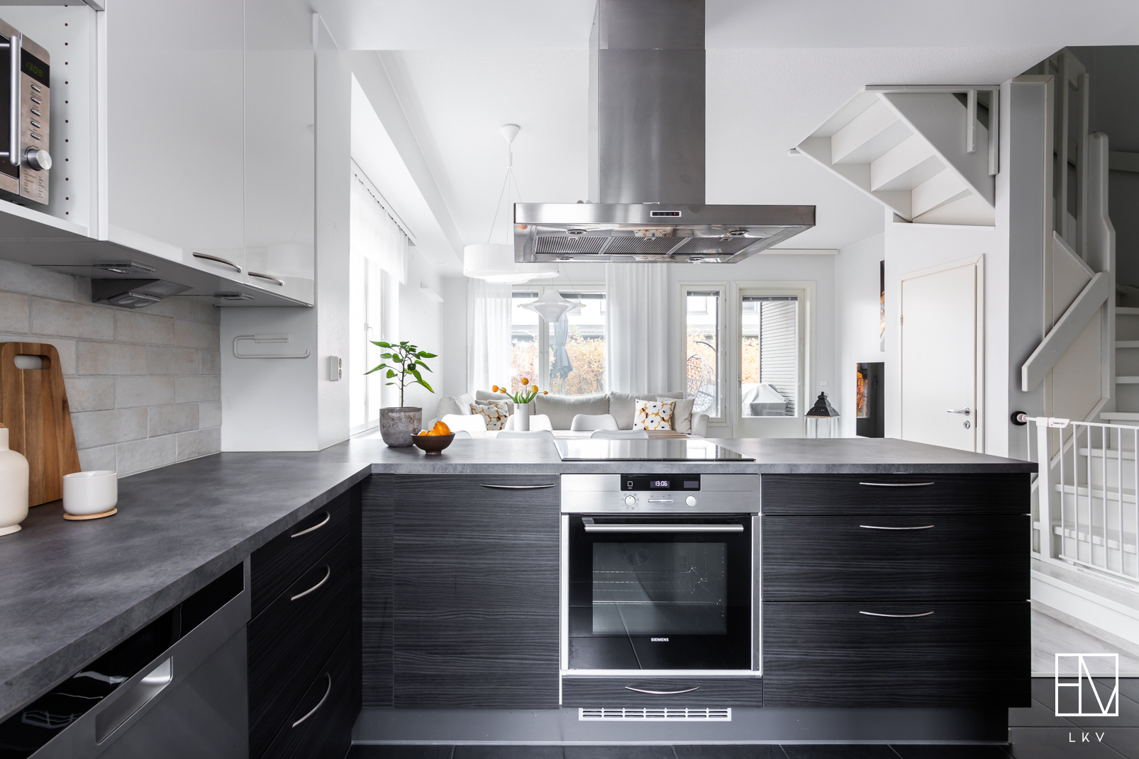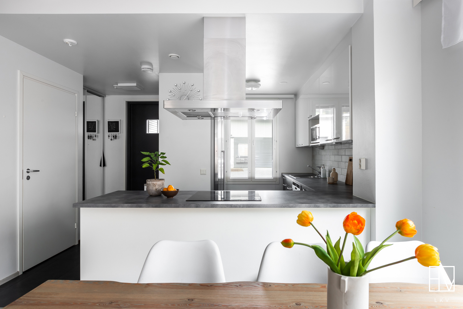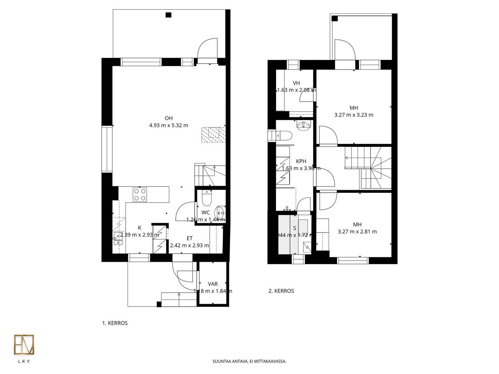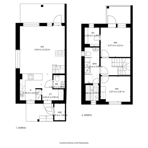 Huoneiston asuintilat sijoittuvat kahteen kerrokseen. Alakerrassa keittiö ja olohuone muodostavat yhtenäisen ja avaran oleskelutilan. Keittiössä on runsaasti kaappi- ja työskentelytilaa. Olohuoneesta on käynti suojaisalle takapihan terassille, joka tarjoaa mukavan ulkotilan kesäkauden käyttöön. Lisäksi alakerrasta löytyy erillinen wc.