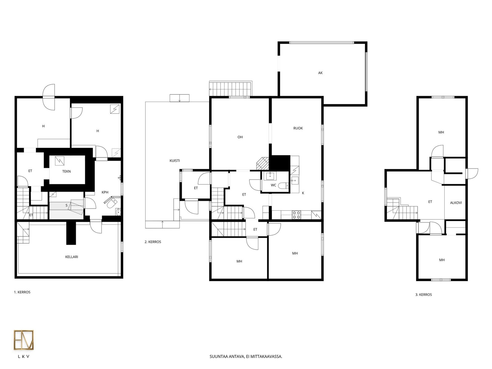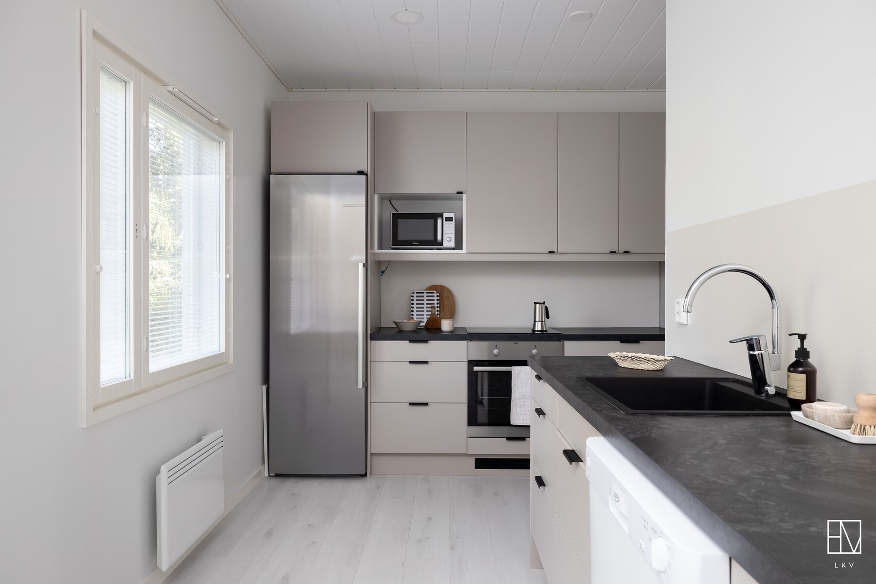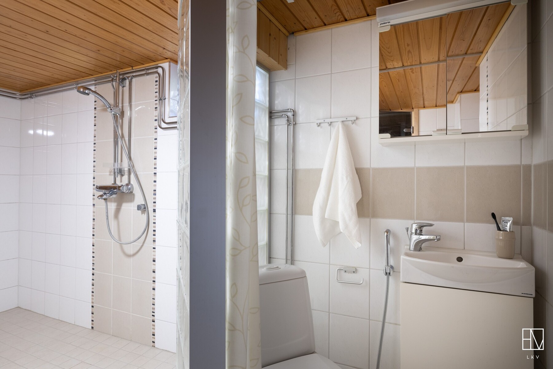 Asuintilat jakautuvat kolmeen kerrokseen. Alakerrassa on valoisa keittiö joka on uusittu 2025, kodikas olohuone joka yhdistyy tilavaan ruokailutilaan, sekä kaksi makuuhuonetta ja uusittu wc.