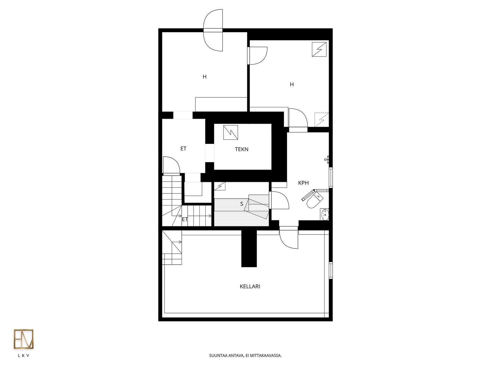 Kellarissa on pukuhuone, kylpyhuone, sauna sekä wc. Lisäksi kaksi huonetta joista saa tehtyä omien tarpeiden mukaiseen käyttöön soveltuvat tilat, esim, khh ja askarteluhuone.