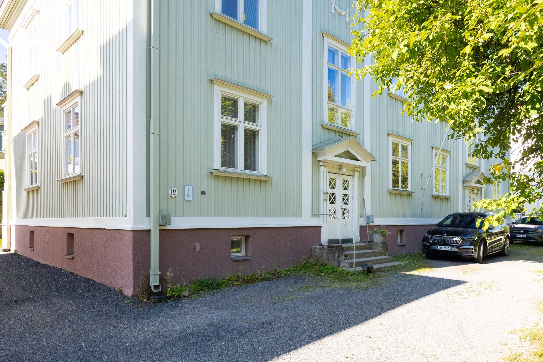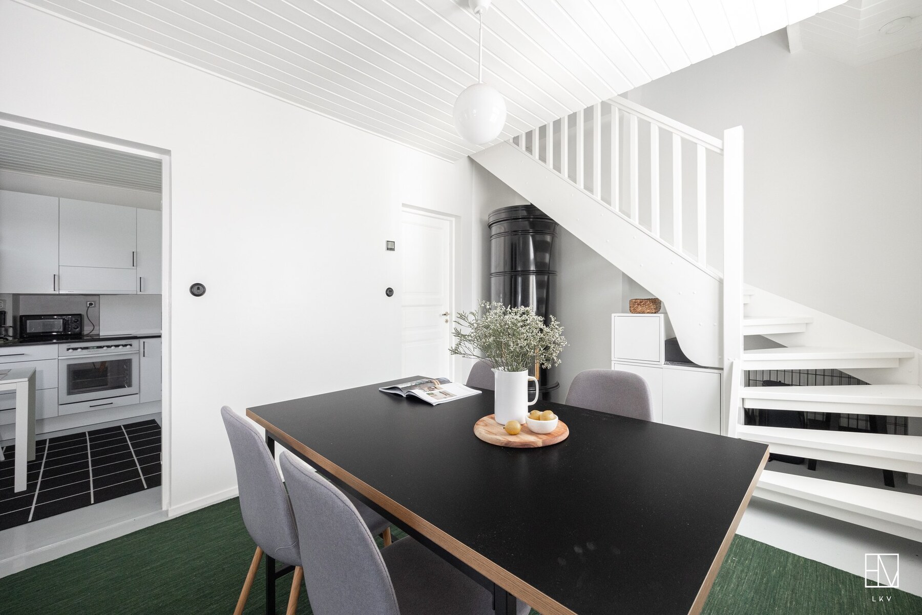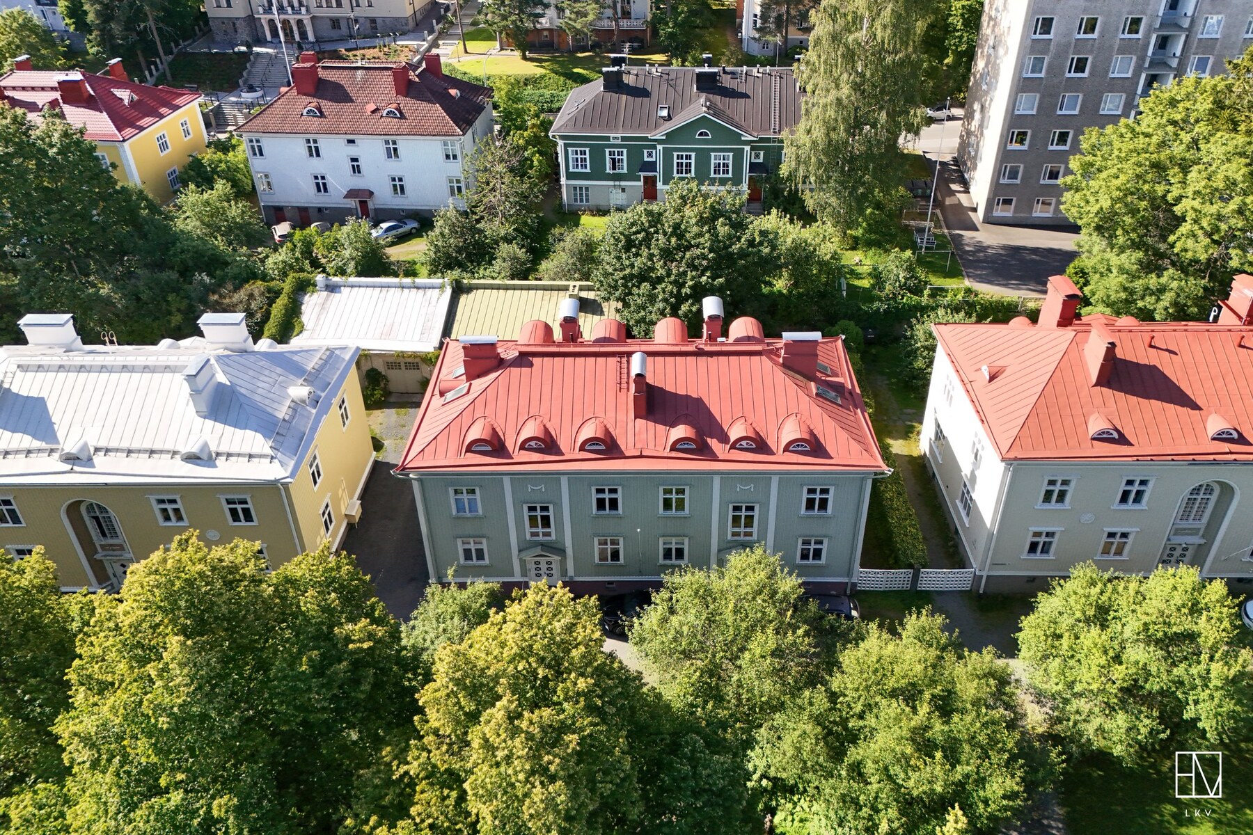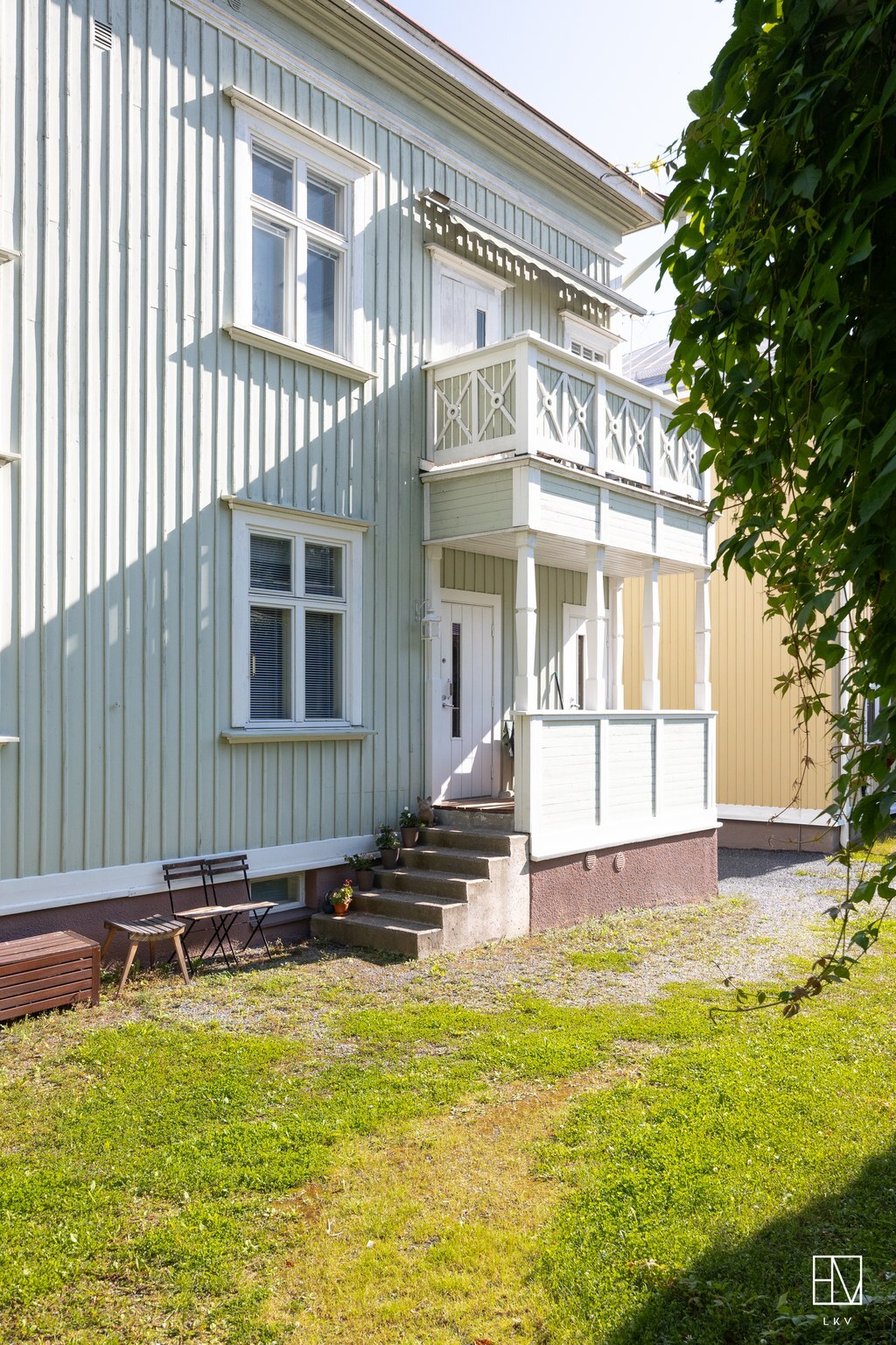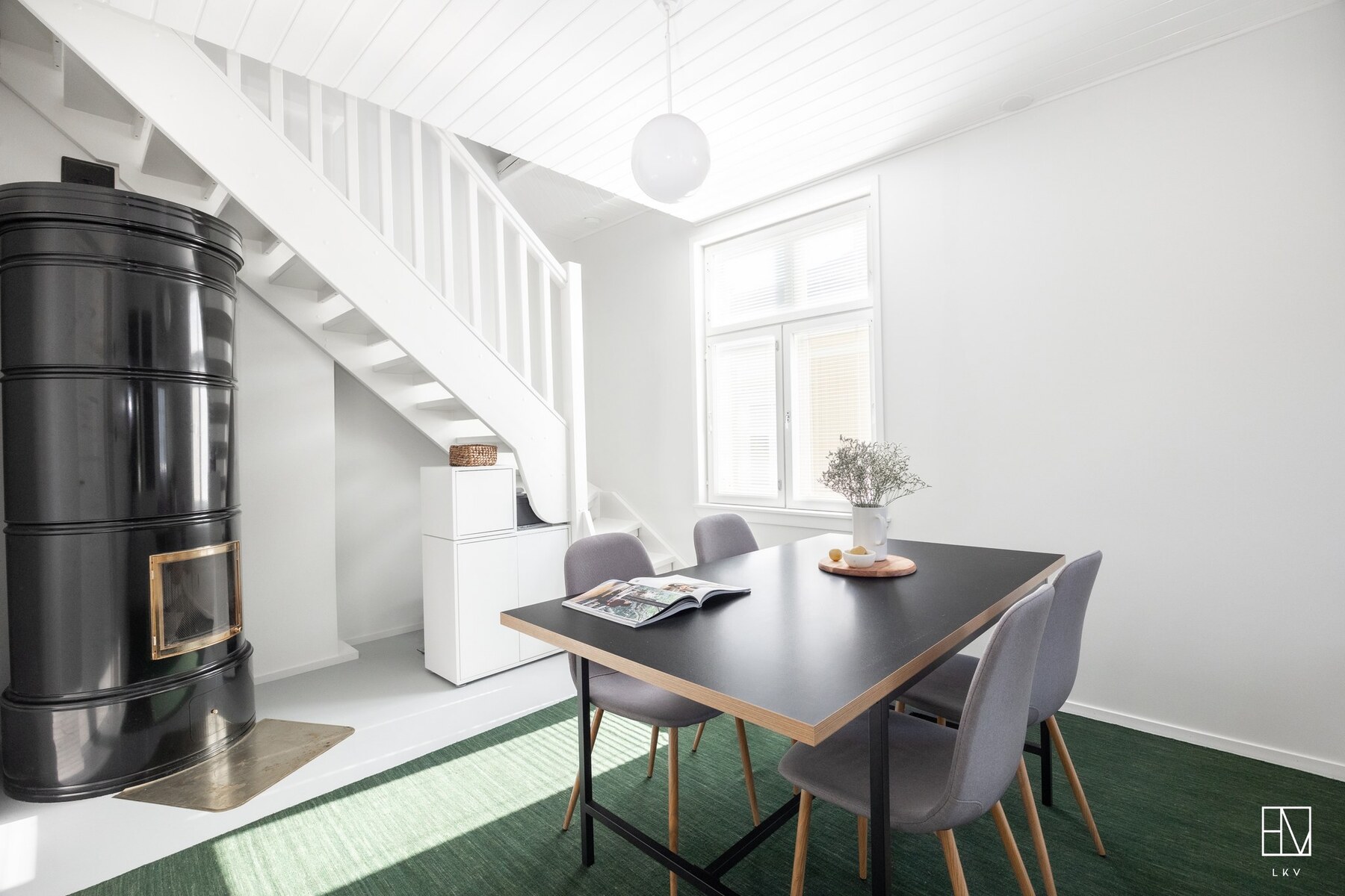 Kaksikerroksinen huoneisto yhdistää vanhan ajan arvokkuuden ja modernin asumismukavuuden. Alakerrassa on valoisa olohuone kakluuneineen, erillinen ruokailuhuone pönttöuunilla sekä laadukkaasti vuonna 2017 remontoitu keittiö.
