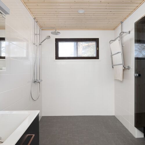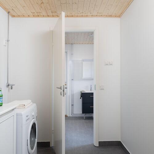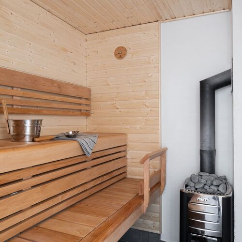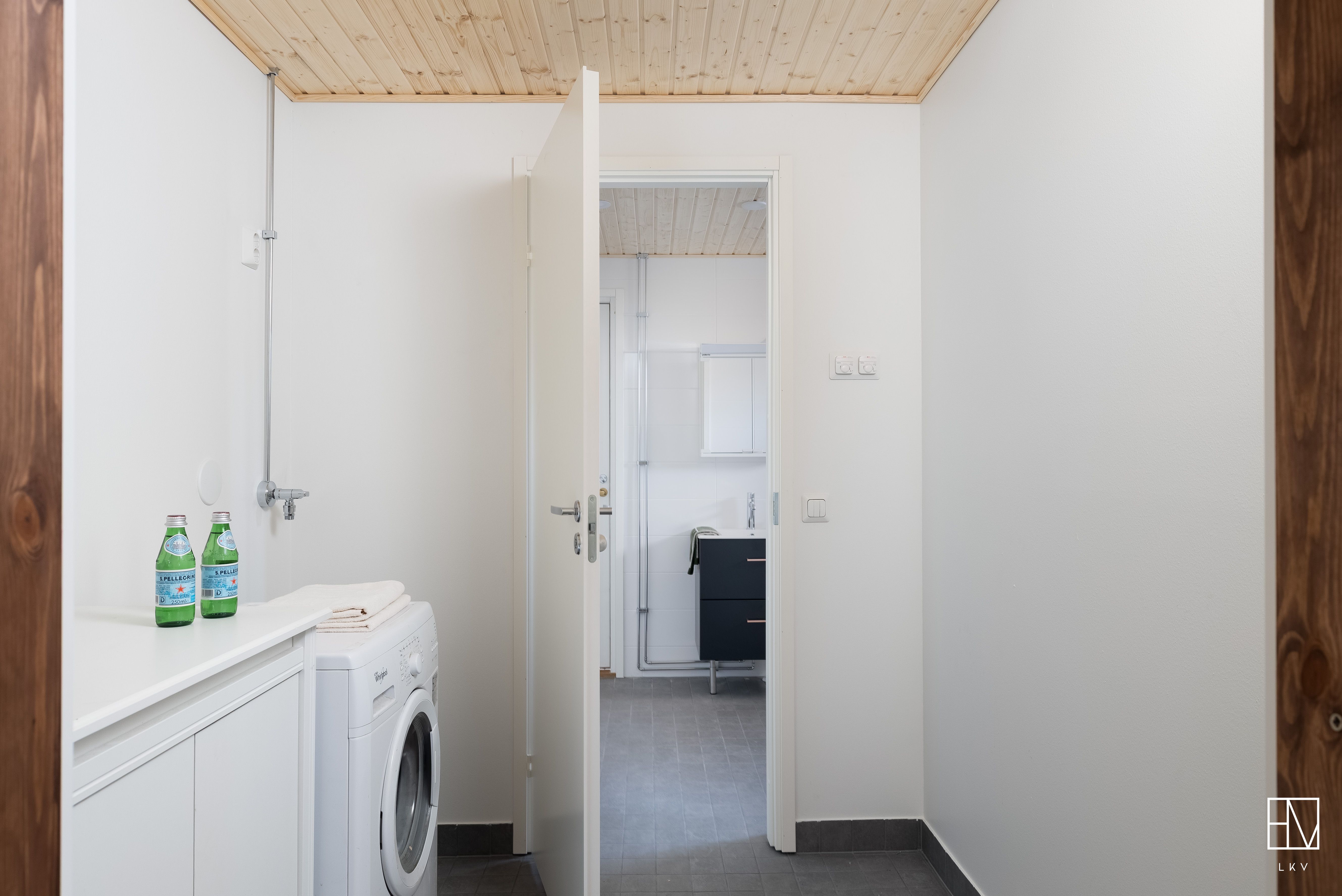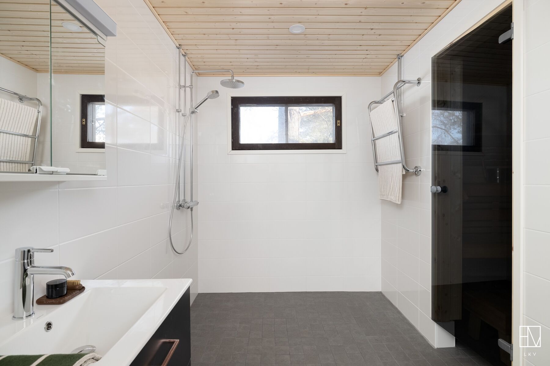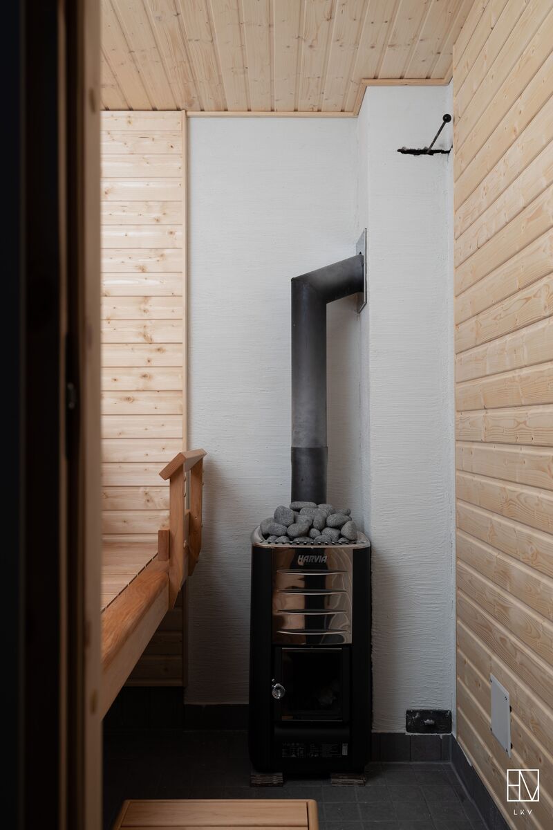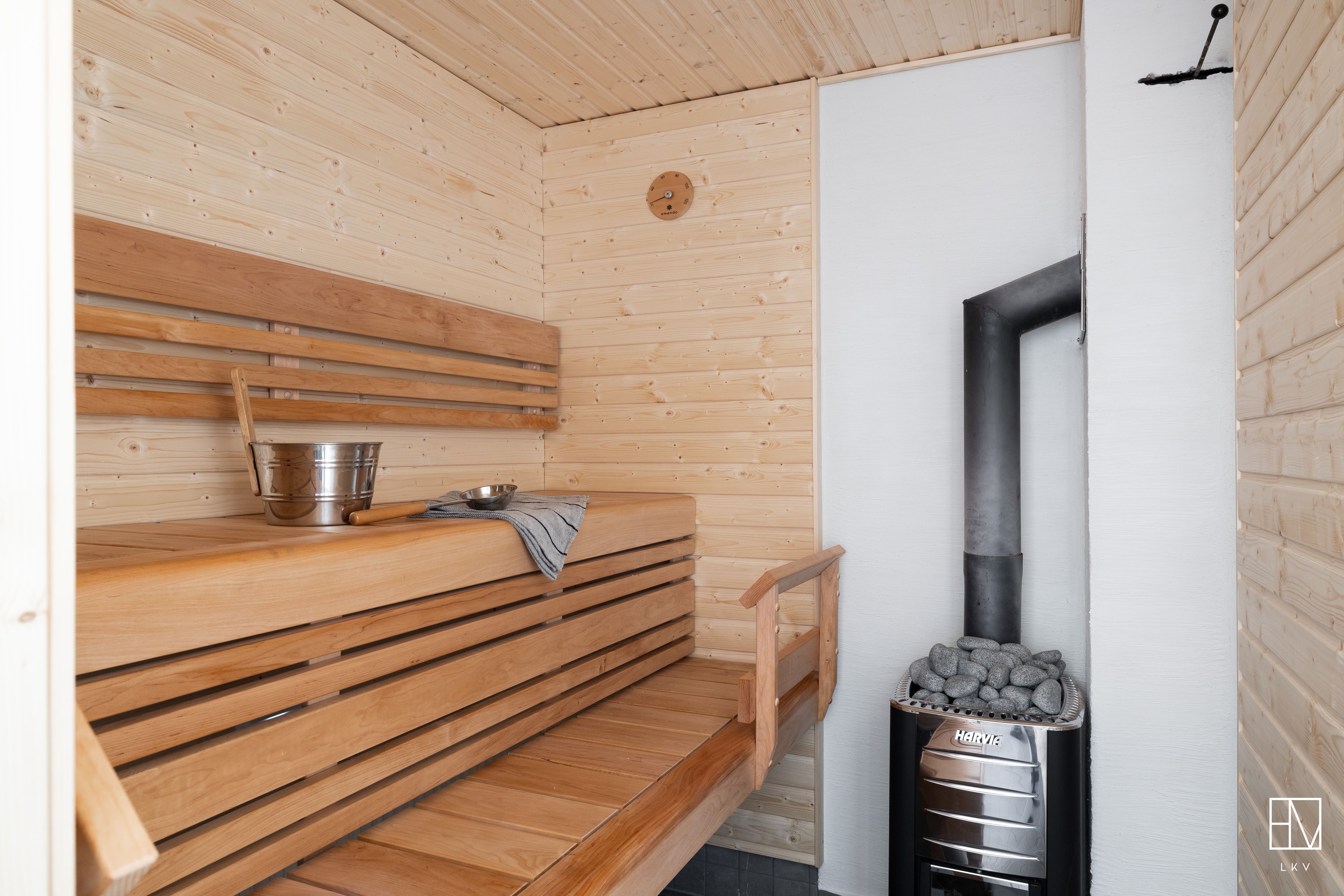 Sauna, kylpyhuone ja kodinhoitotila on uusittu kokonaisuudessaan loppuvuodesta 2025. Ajattoman tyylikäs ja hyvin suunniteltu saunaosasto kutsuu rentoutumaan puukiukaan pehmeisiin löylyihin. Kylpyhuoneesta on kätevä kulku takapihan katetulle terassille. Erillinen kodinhoitotila helpottaa pyykinhuoltoa ja muita arjen askareita.
