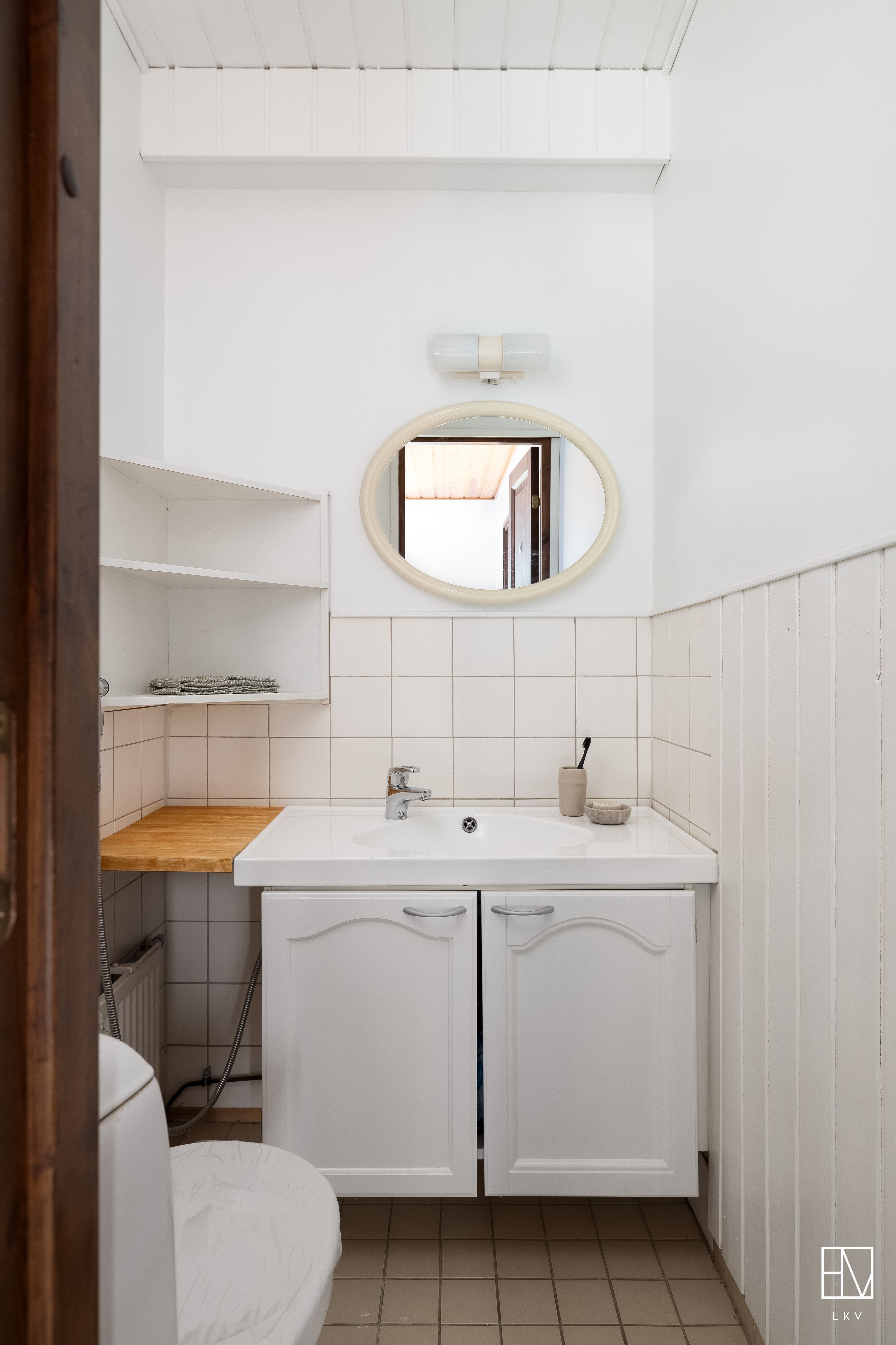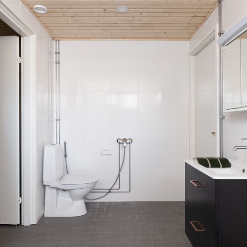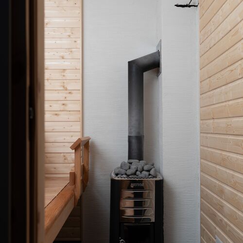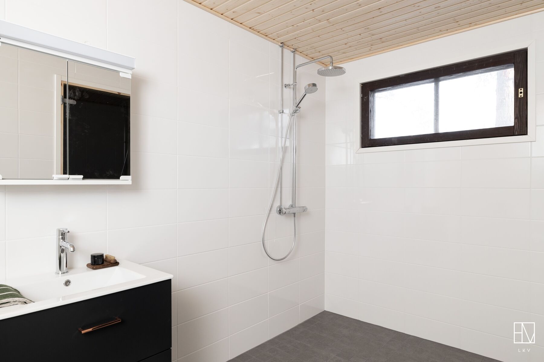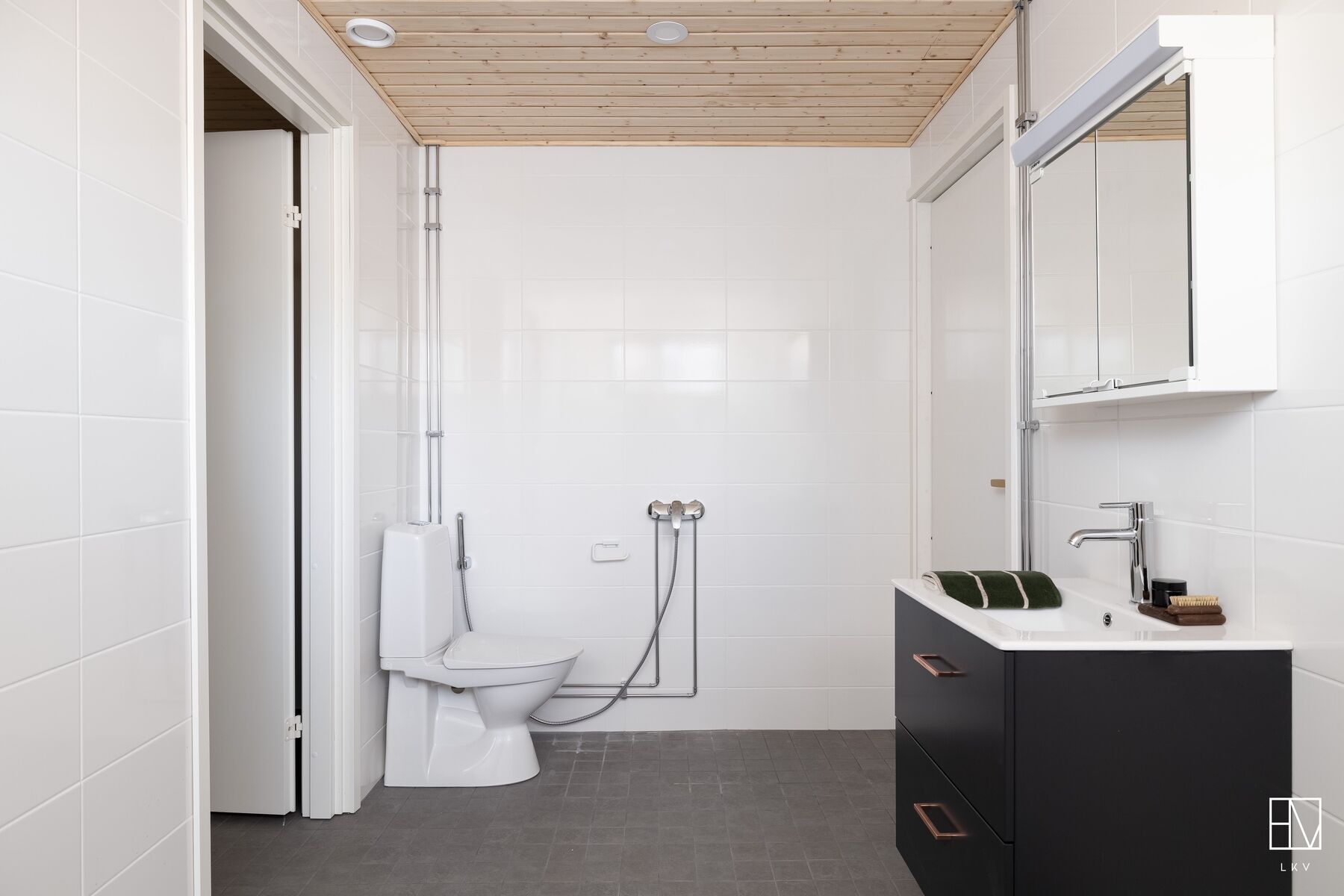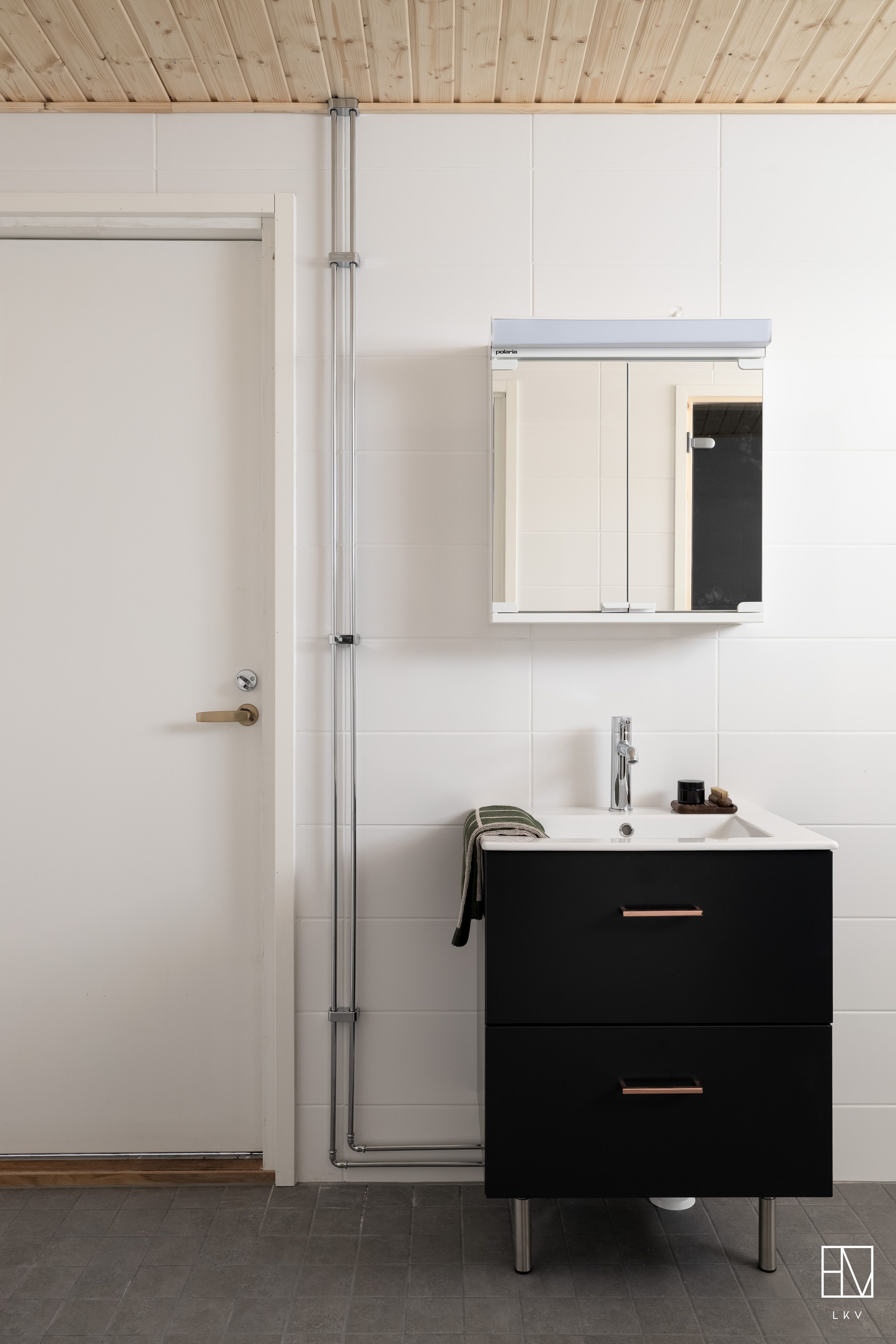 Sauna, kylpyhuone ja kodinhoitotila on uusittu kokonaisuudessaan loppuvuodesta 2025. Ajattoman tyylikäs ja hyvin suunniteltu saunaosasto kutsuu rentoutumaan puukiukaan pehmeisiin löylyihin. Kylpyhuoneesta on kätevä kulku takapihan katetulle terassille. Erillinen kodinhoitotila helpottaa pyykinhuoltoa ja muita arjen askareita.