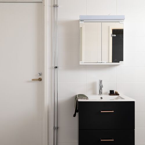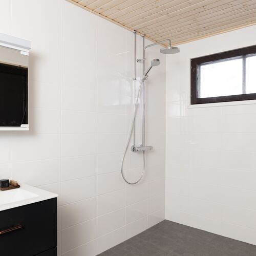 Allaskaappi, peilikaappi, kuivauspatteri, sadesuihku, wc-istuin, lattialämmitys.