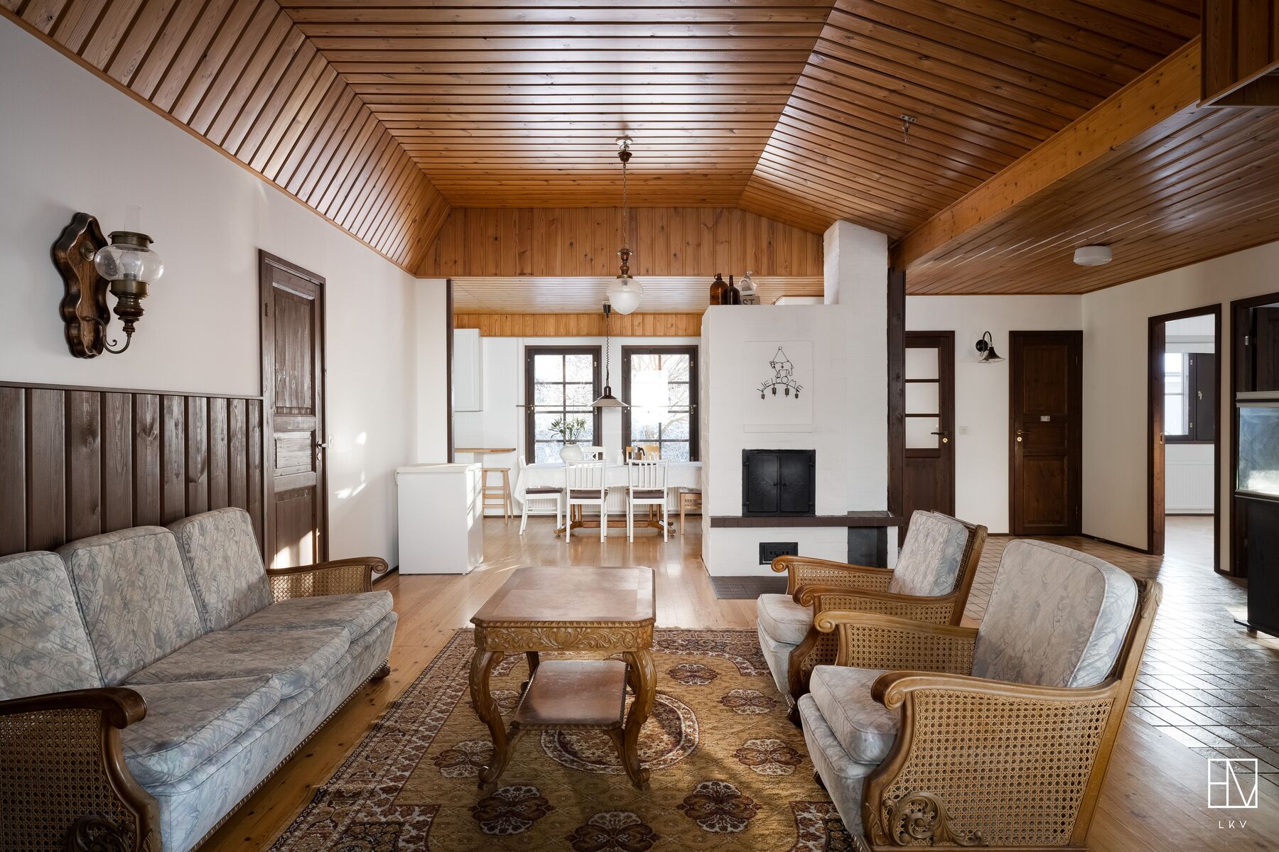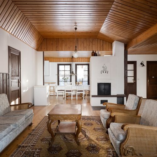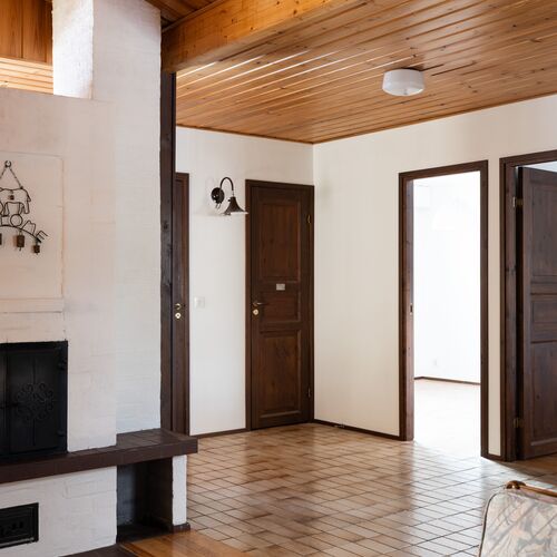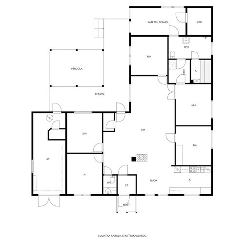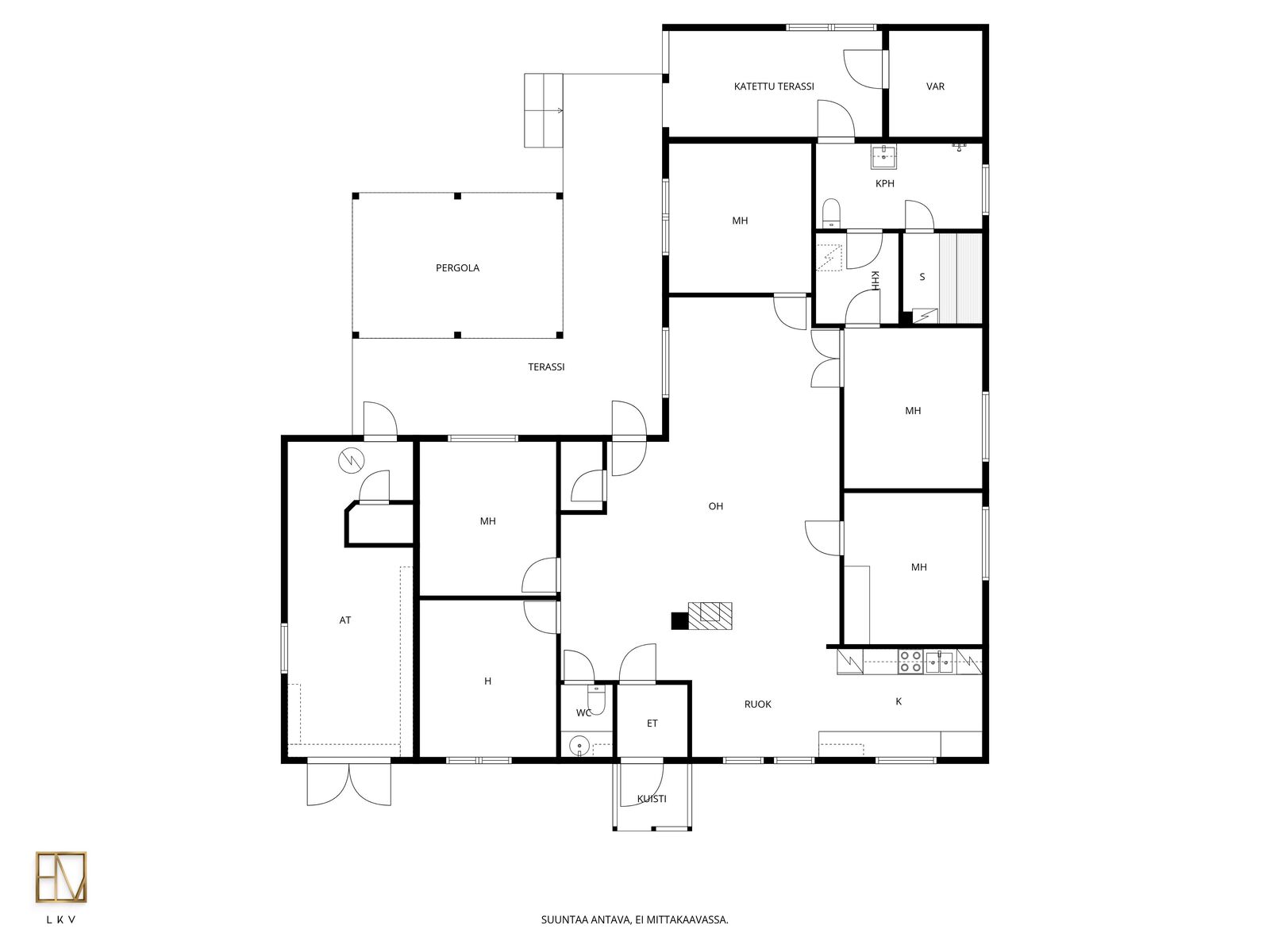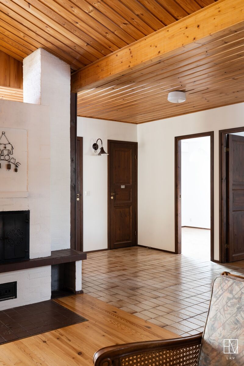 Tässä kodissa on erinomaiset tilaratkaisut. Yhteen tasoon rakennettu koti on toiminnallisesti suunniteltu. Heti sisään astuttaessa tuulikaapin jälkeen avautuu tilava aula, jonka yhteydessä on myös erillinen wc. Aulatila yhdistyy luontevasti reilun kokoiseen olohuoneeseen, ruokailutilaan ja keittiöön. Tämä suuri oleskelutila tarjoaa loistavat puitteet yhdessäoloon isommallakin porukalla. Tilan keskiössä on varaava takka, joka luo kotoisaa tunnelmaa ja lämmittää taloa tehokkaasti. Olohuoneen tavanomaista korkeampi huonekorkeus ja upea kattopanelointi tuovat tilaan persoonallisuutta. Olohuoneesta on kulku myös kodin suojaisalle takapihan terassille sekä pergolaan.