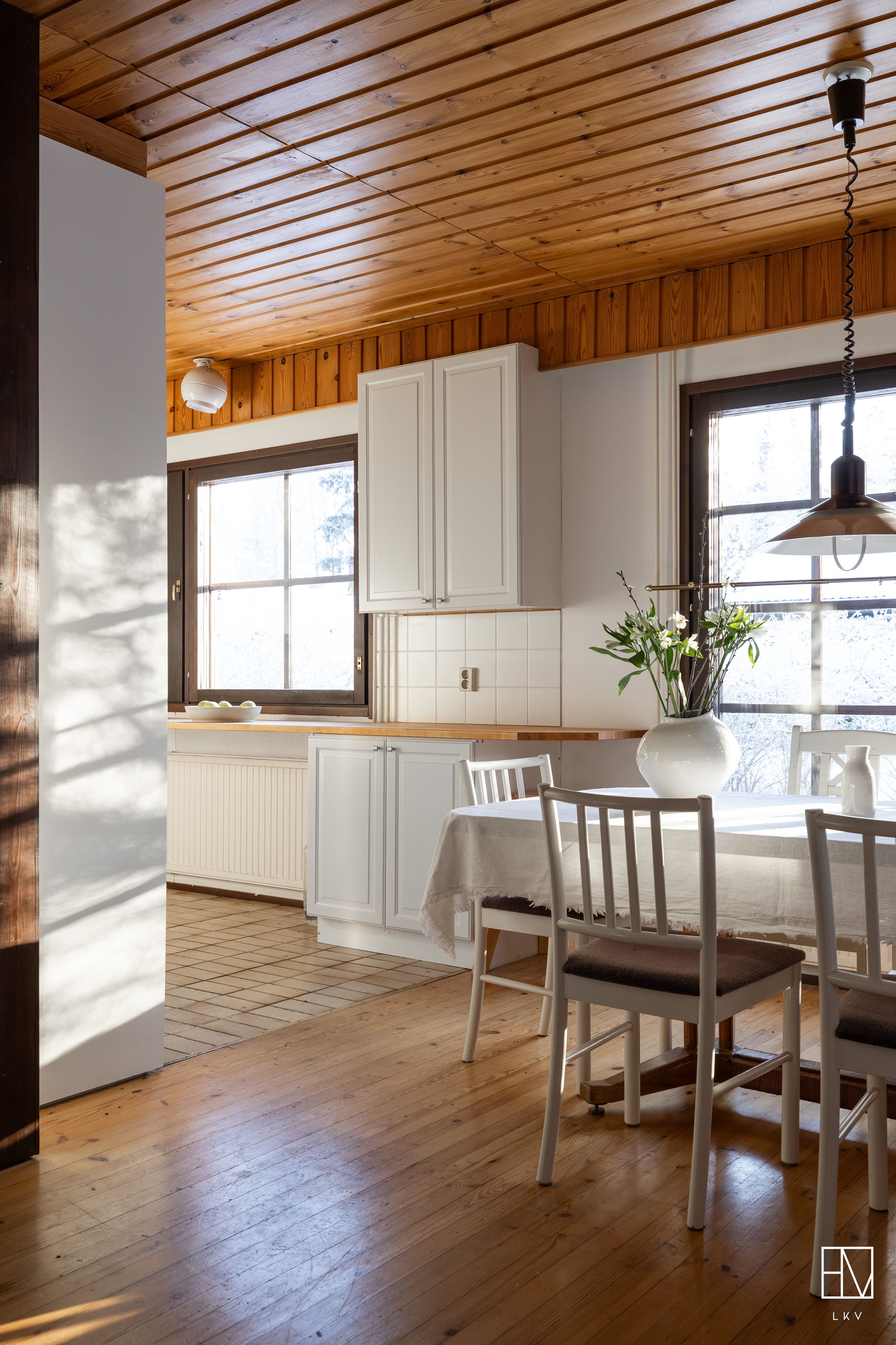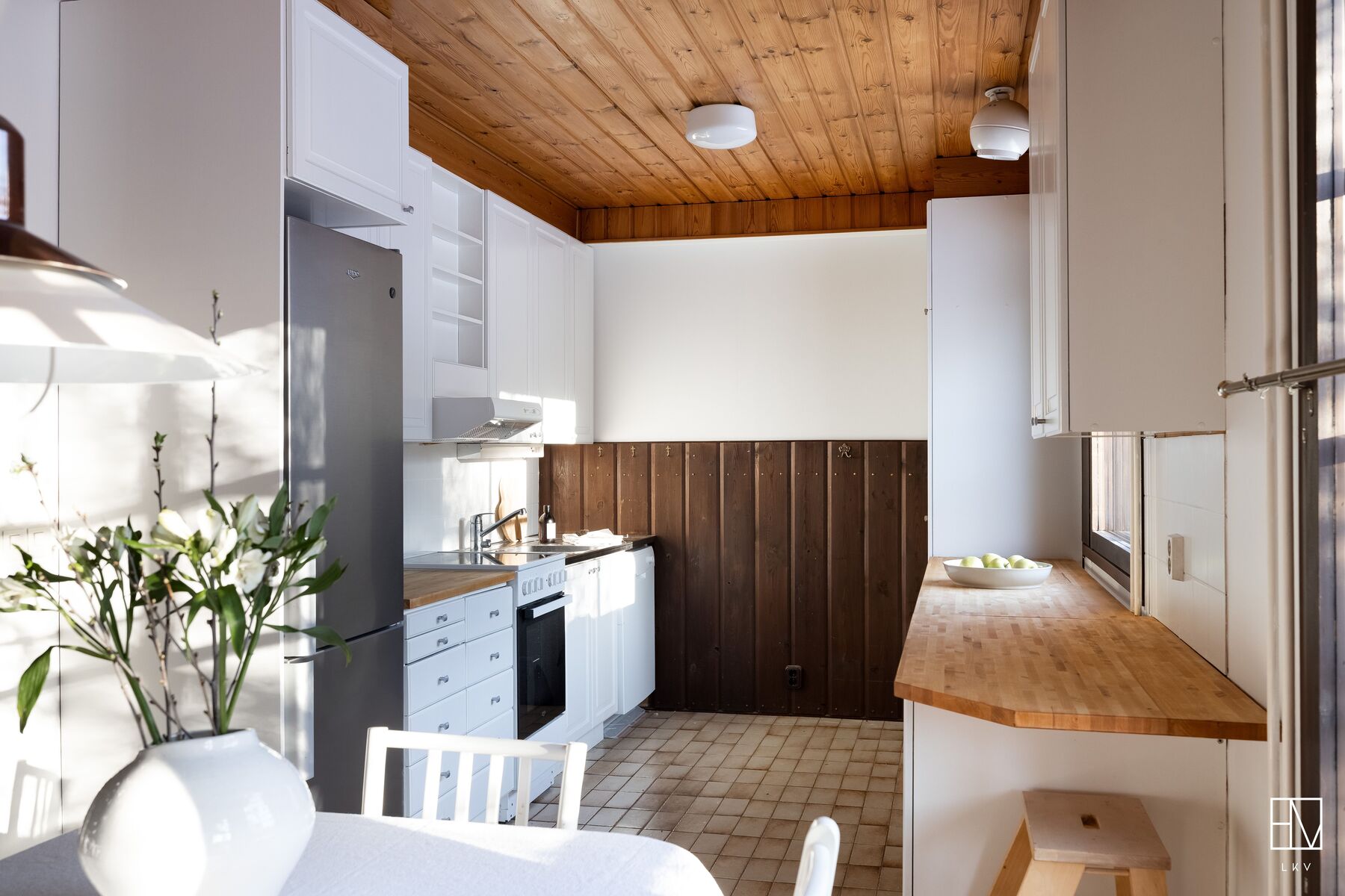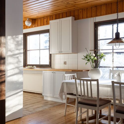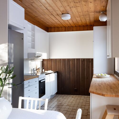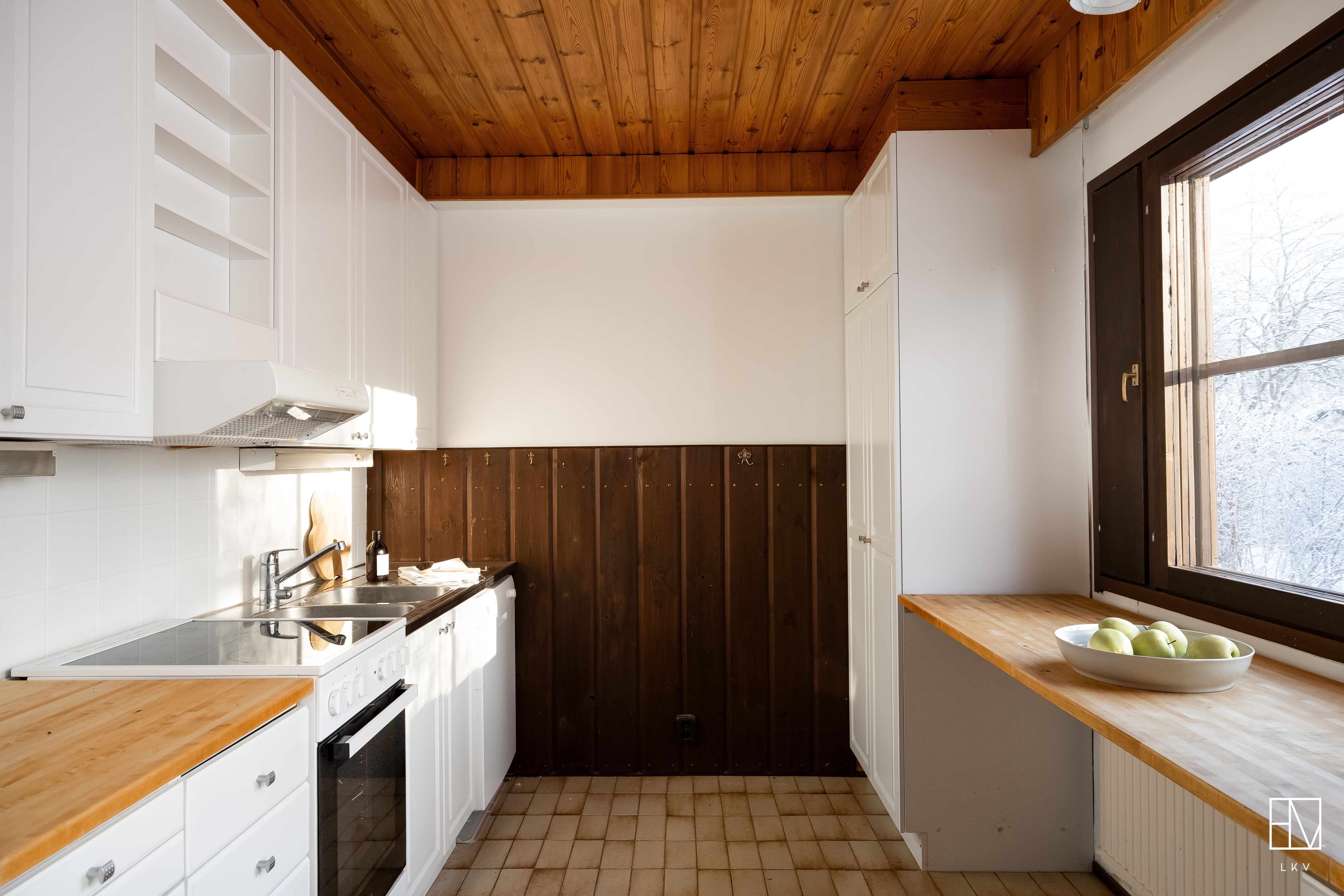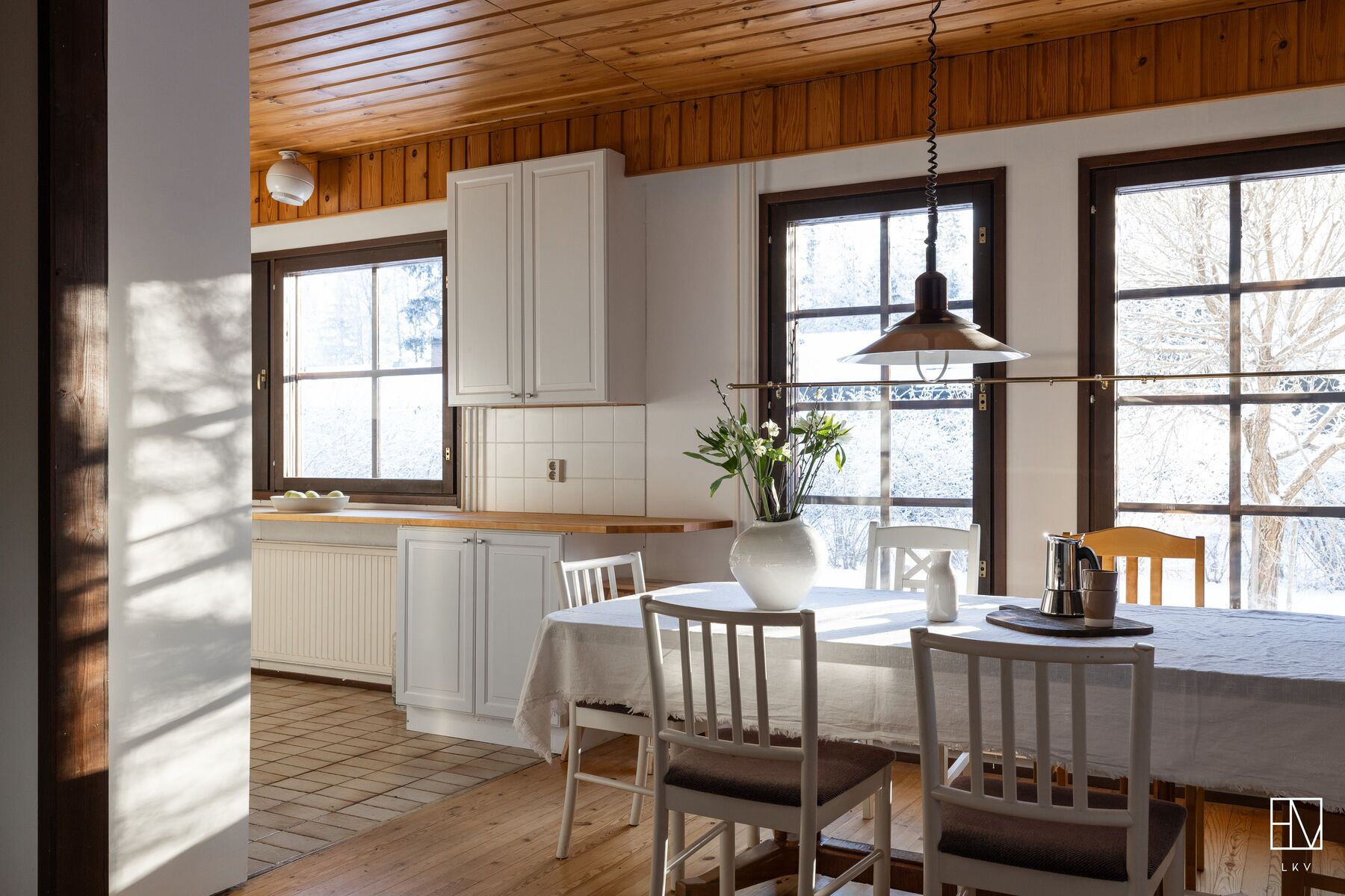 Keittiössä on runsaasti kaappi- ja laskutilaa, ja ruokailutilaan mahtuu hyvin reilunkokoinen ruokailuryhmä. Harmonisen sävyisen keittiön puiset kaapinovet ja työtasot on käsitelty vastikään. Viisi tilavaa makuuhuonetta on sijoiteltu käytännöllisesti oleskelutilojen reunoille.