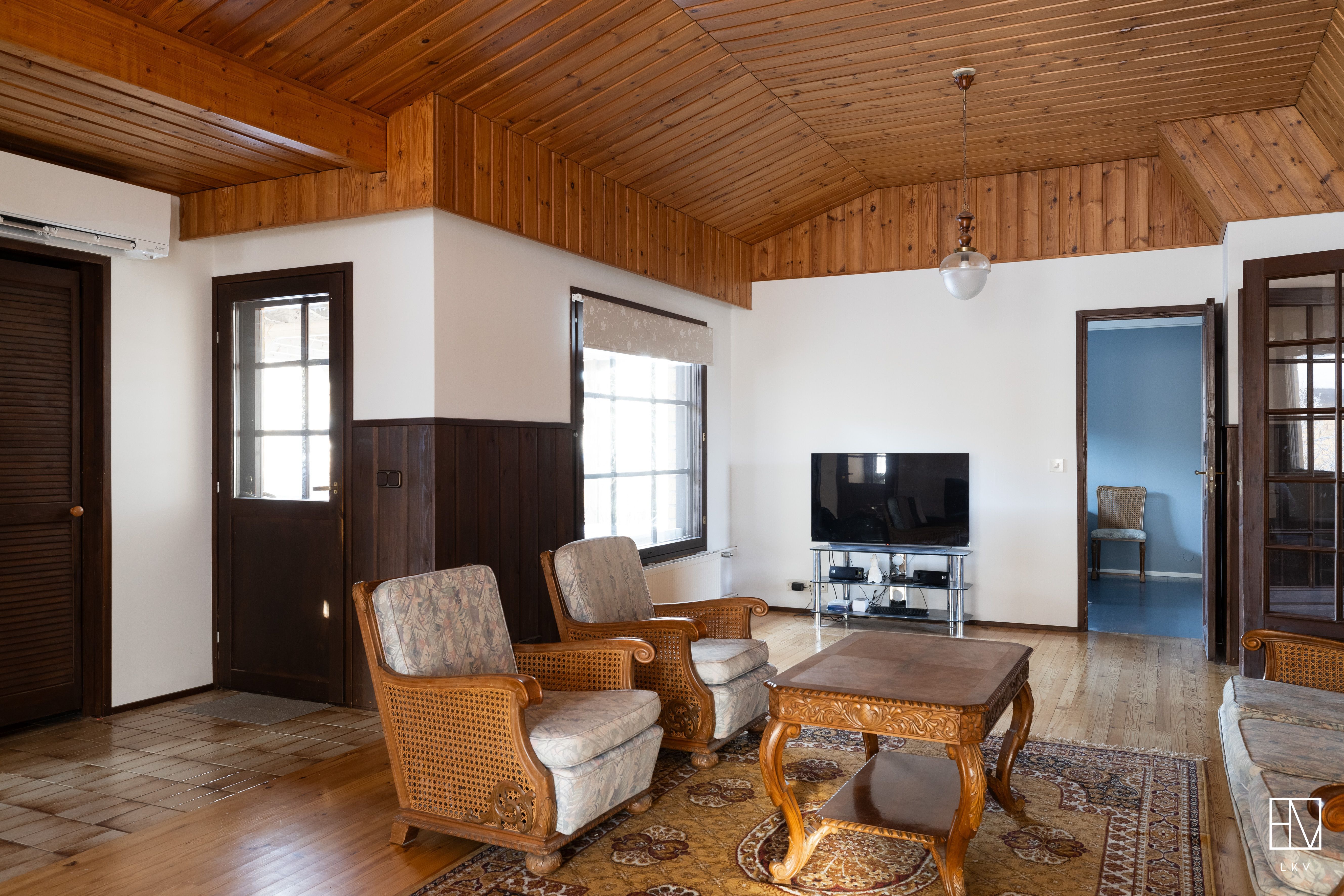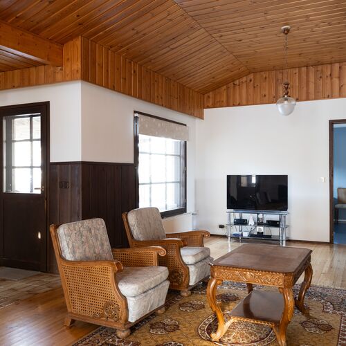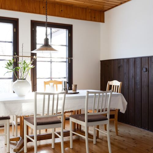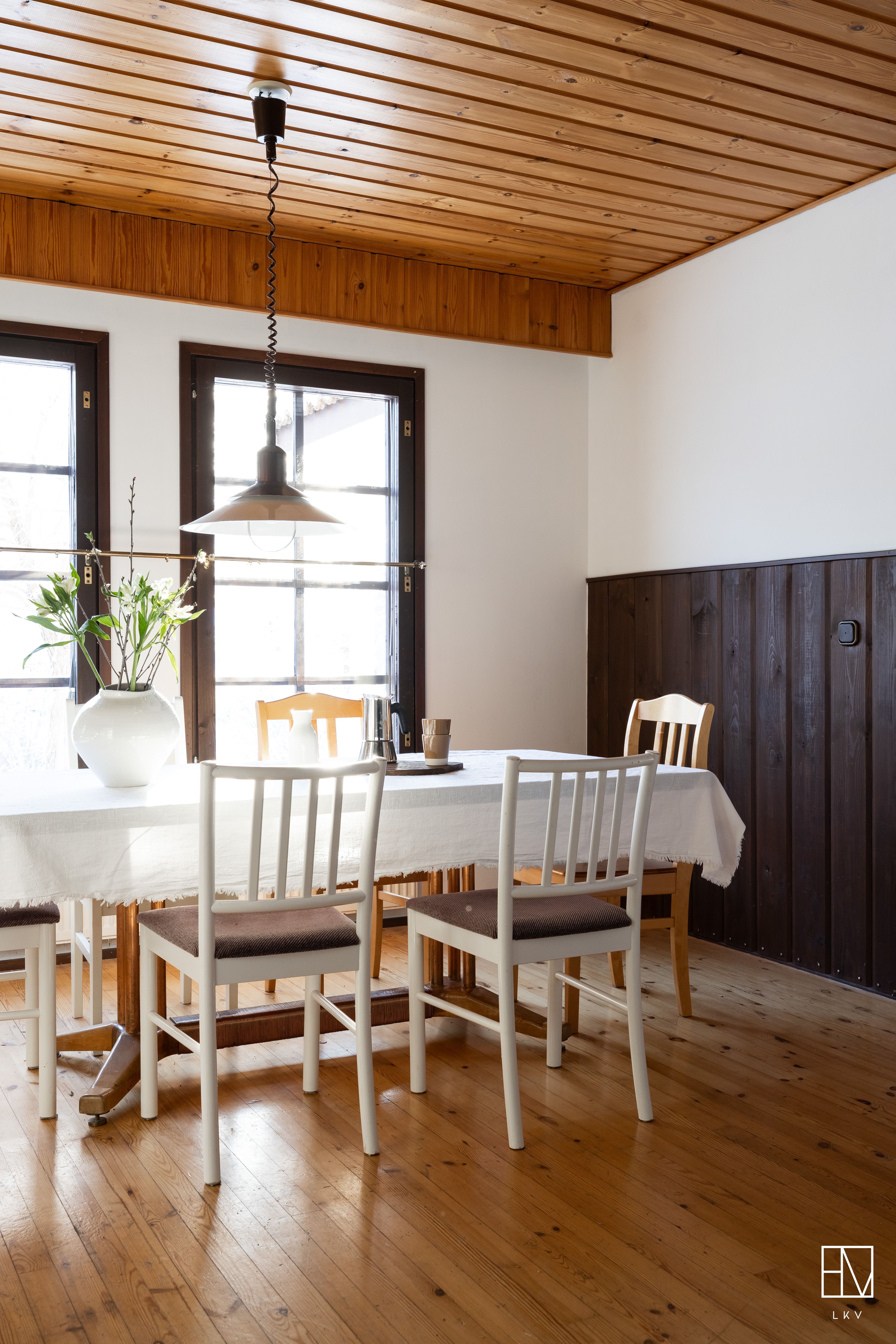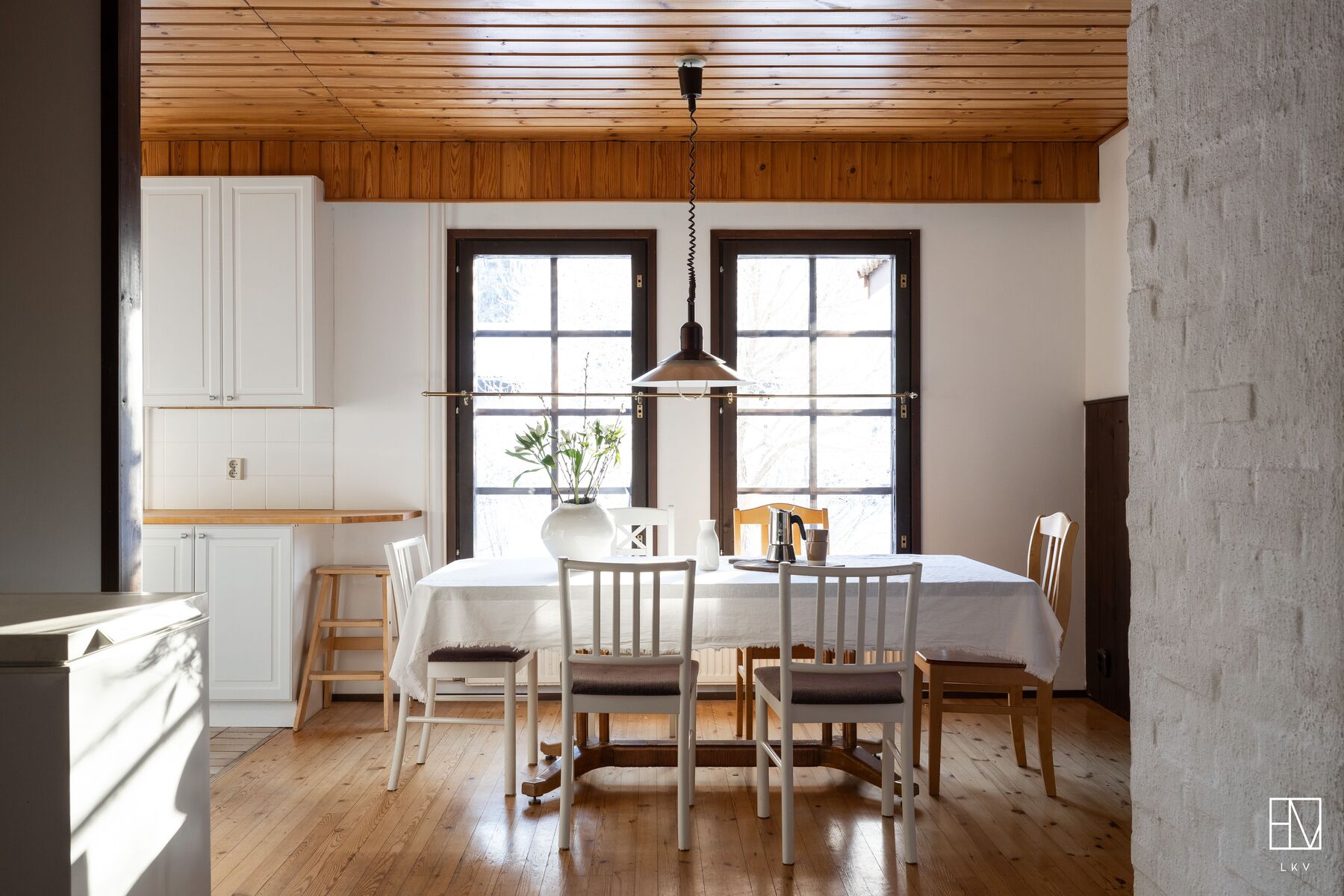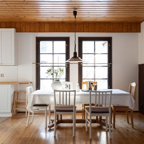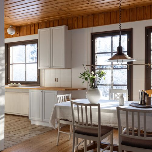 Keittiössä on runsaasti kaappi- ja laskutilaa, ja ruokailutilaan mahtuu hyvin reilunkokoinen ruokailuryhmä. Harmonisen sävyisen keittiön puiset kaapinovet ja työtasot on käsitelty vastikään. Viisi tilavaa makuuhuonetta on sijoiteltu käytännöllisesti oleskelutilojen reunoille.