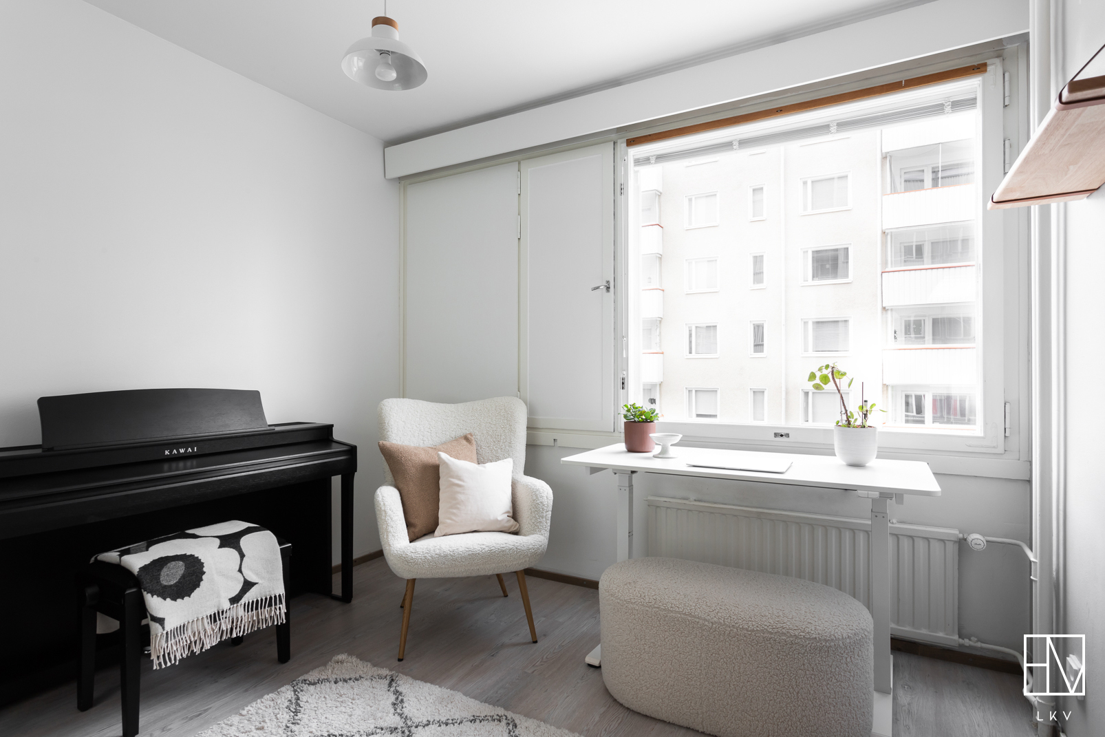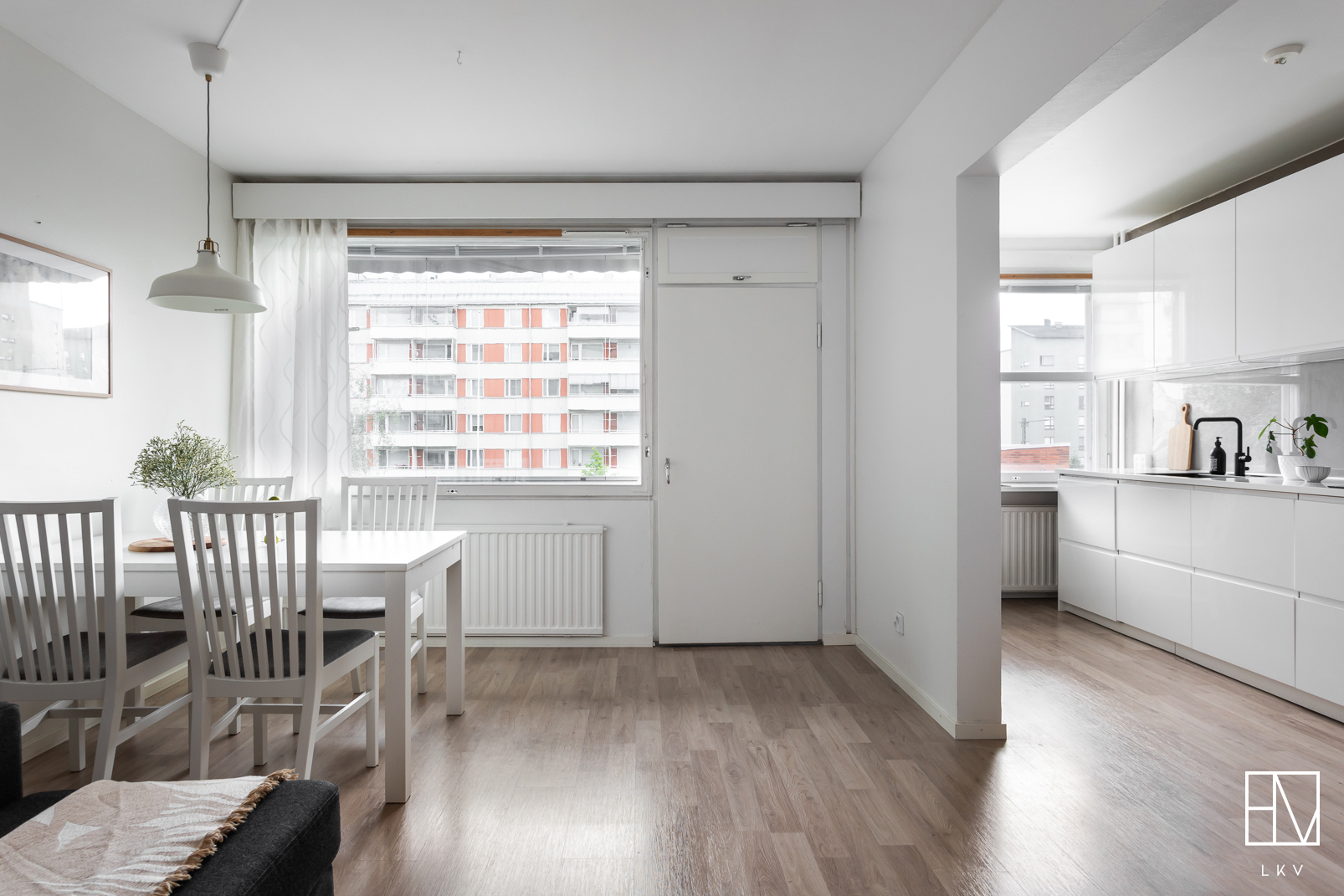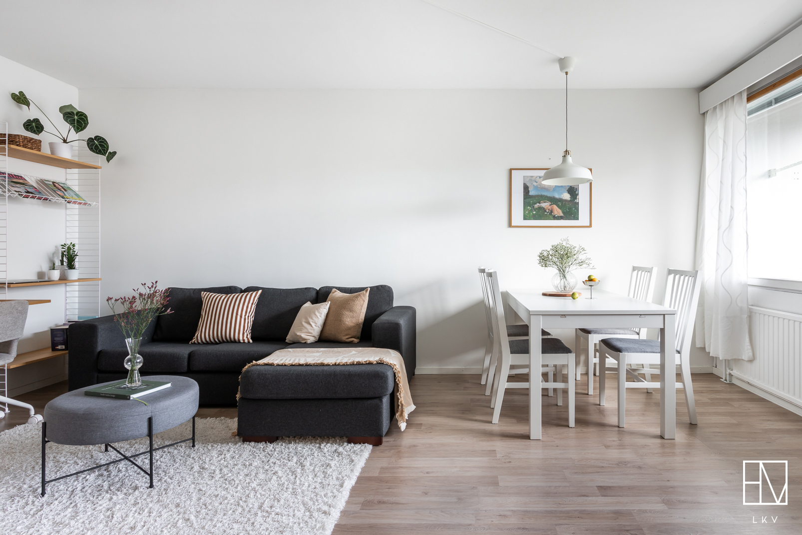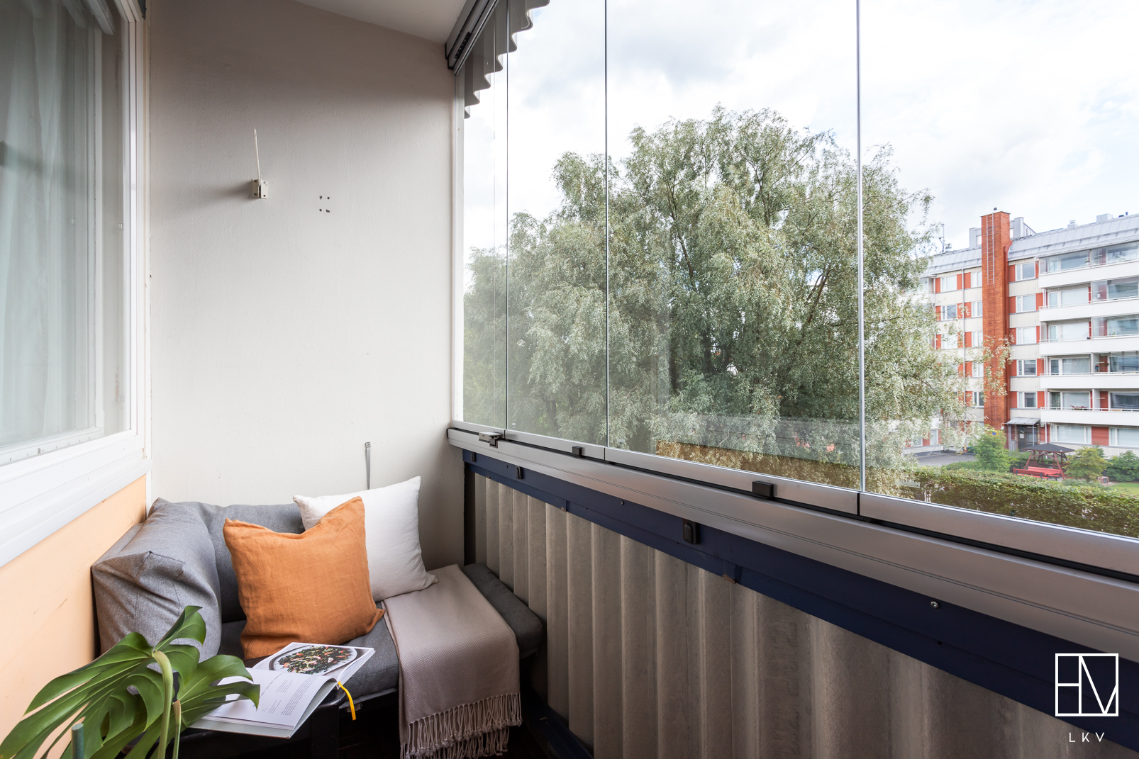 TIlava olohuone tarjoaa tilan niin työpisteelle, sohvalle kuin isommallekin ruokailuryhmälle. Olohuoneesta käy kulku asunnon vuonna 2021 lasitetulle parvekkeelle ja näkymät avautuvat rauhallista sisäpihaa kohti. Iso olohuone yhdistyy skandinaaviseen keittiöön, jonka varusteluun kuuluvat mm. integroidut Boschin kodinkoneet, jääkaappi ja pakastin, induktioliesi ja liesituuletin sekä runsaasti lasku- sekä kaappitilaa.