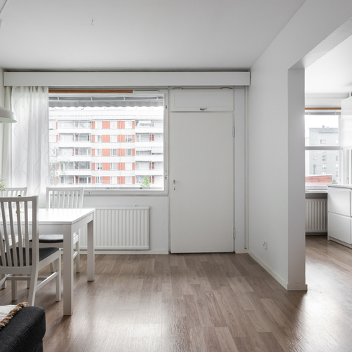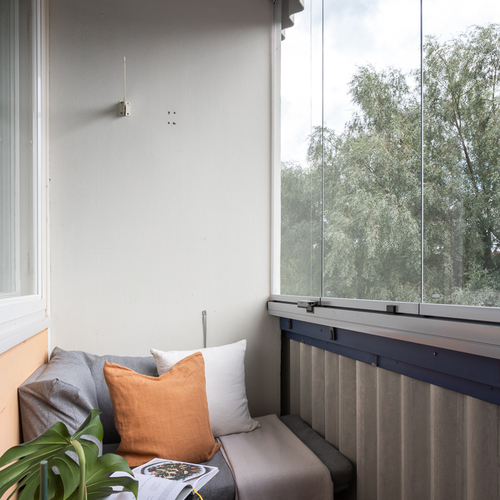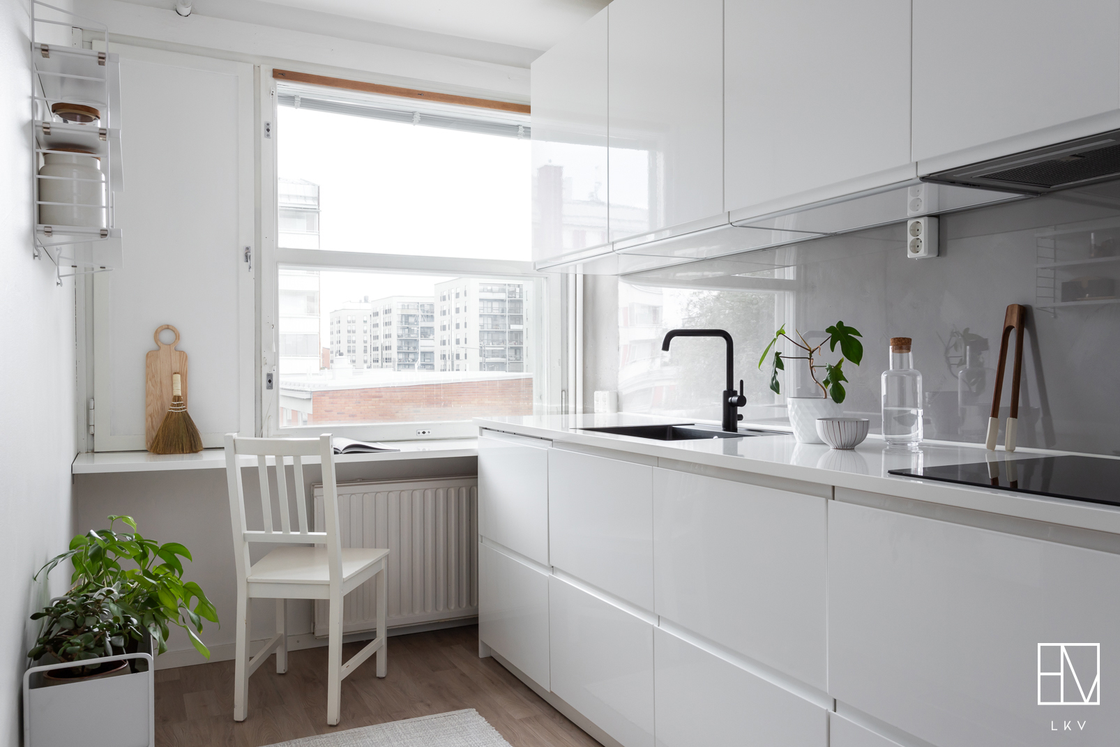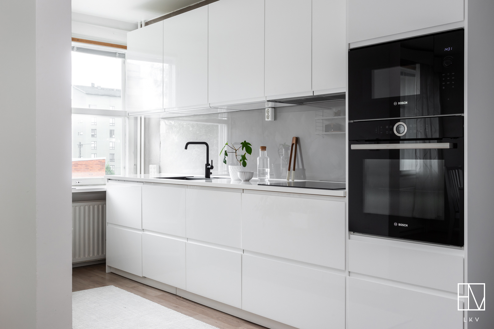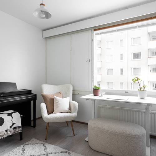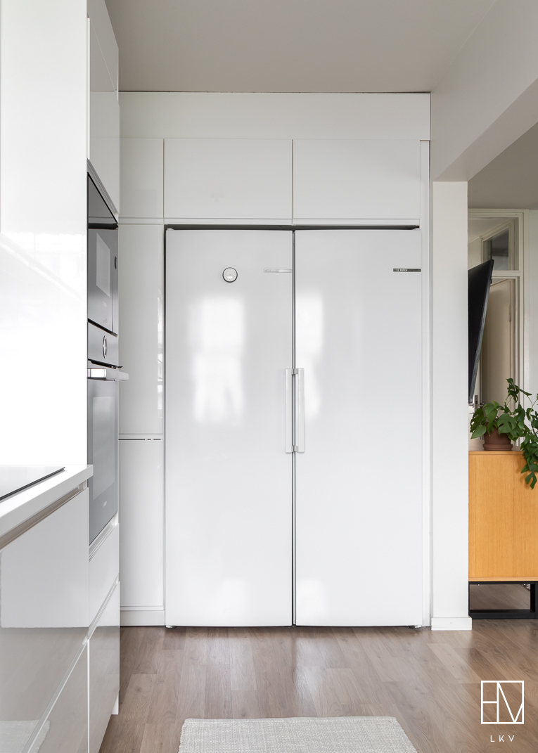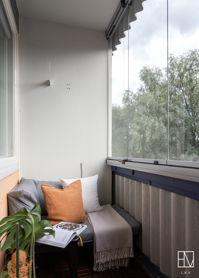 TIlava olohuone tarjoaa tilan niin työpisteelle, sohvalle kuin isommallekin ruokailuryhmälle. Olohuoneesta käy kulku asunnon vuonna 2021 lasitetulle parvekkeelle ja näkymät avautuvat rauhallista sisäpihaa kohti. Iso olohuone yhdistyy skandinaaviseen keittiöön, jonka varusteluun kuuluvat mm. integroidut Boschin kodinkoneet, jääkaappi ja pakastin, induktioliesi ja liesituuletin sekä runsaasti lasku- sekä kaappitilaa.