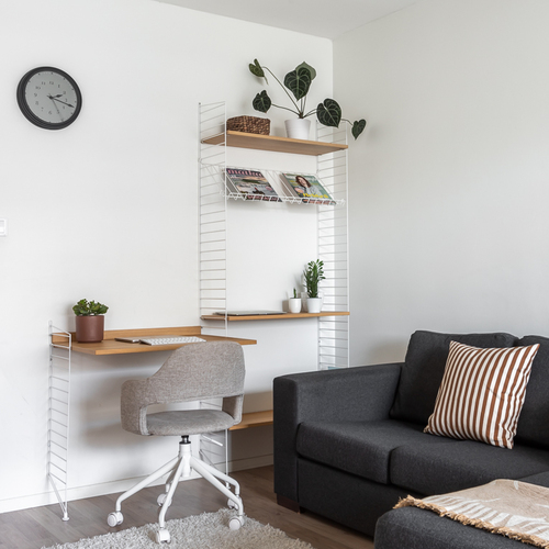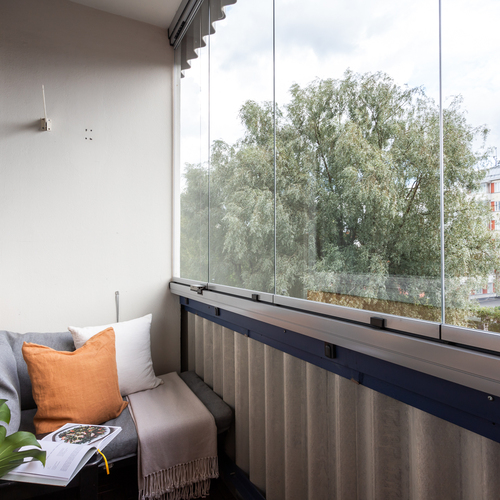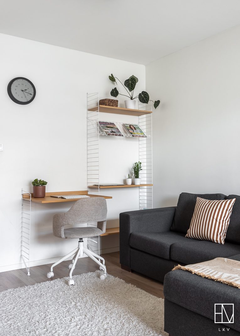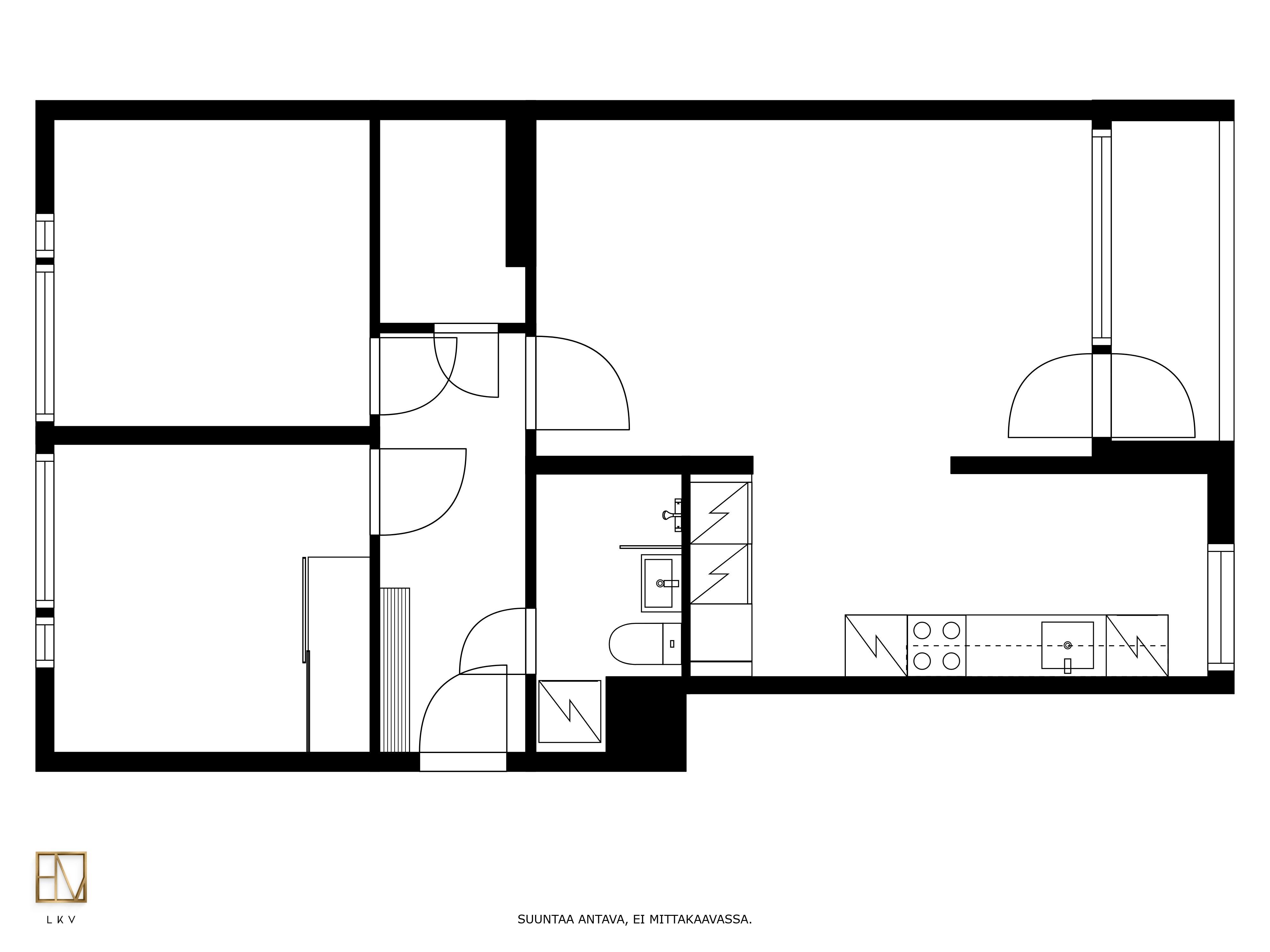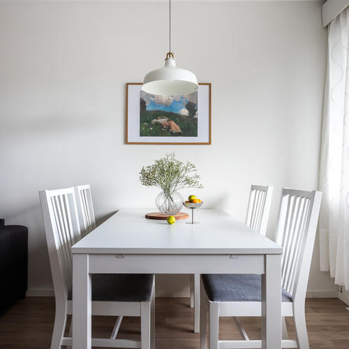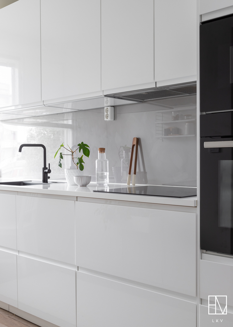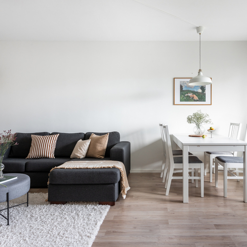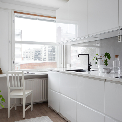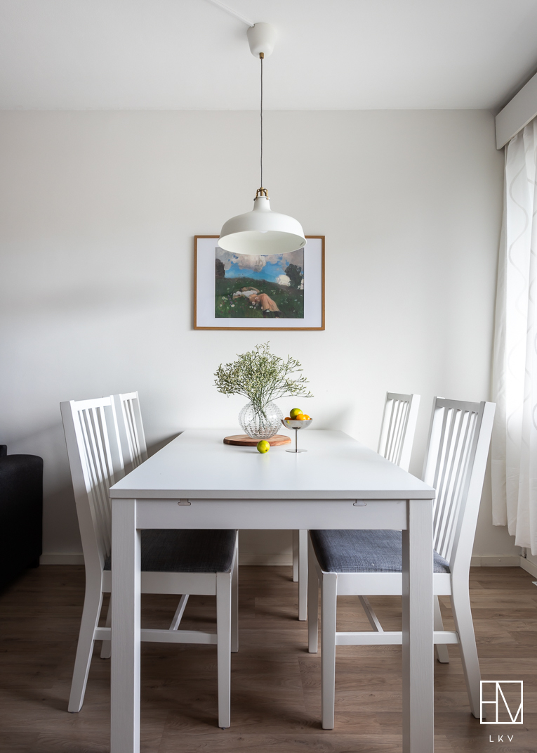 TIlava olohuone tarjoaa tilan niin työpisteelle, sohvalle kuin isommallekin ruokailuryhmälle. Olohuoneesta käy kulku asunnon vuonna 2021 lasitetulle parvekkeelle ja näkymät avautuvat rauhallista sisäpihaa kohti. Iso olohuone yhdistyy skandinaaviseen keittiöön, jonka varusteluun kuuluvat mm. integroidut Boschin kodinkoneet, jääkaappi ja pakastin, induktioliesi ja liesituuletin sekä runsaasti lasku- sekä kaappitilaa.