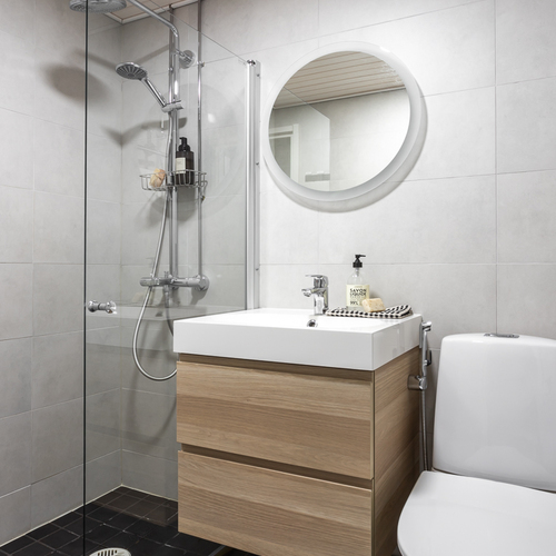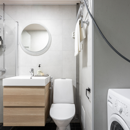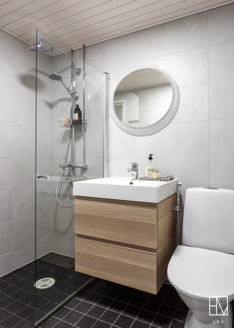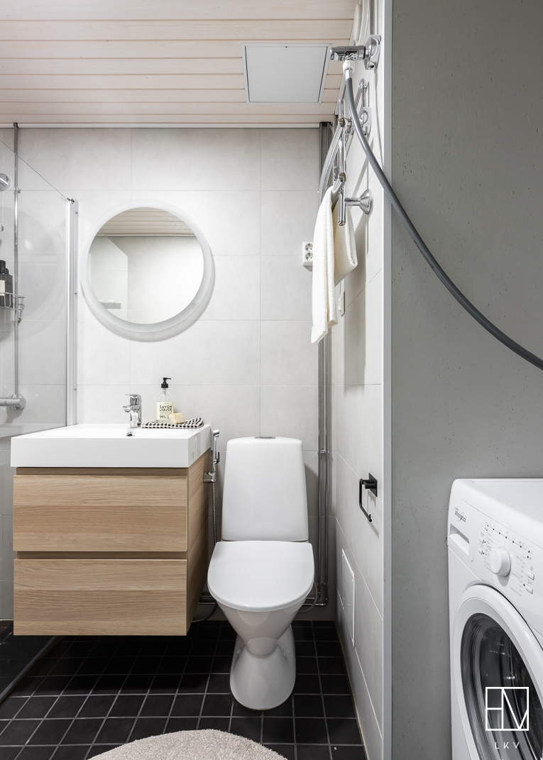 Varusteet: suihkuseinä, pesukoneliitäntä, lattialämmitys, wc-istuin, suihku, peili, kiinteät valaisimet