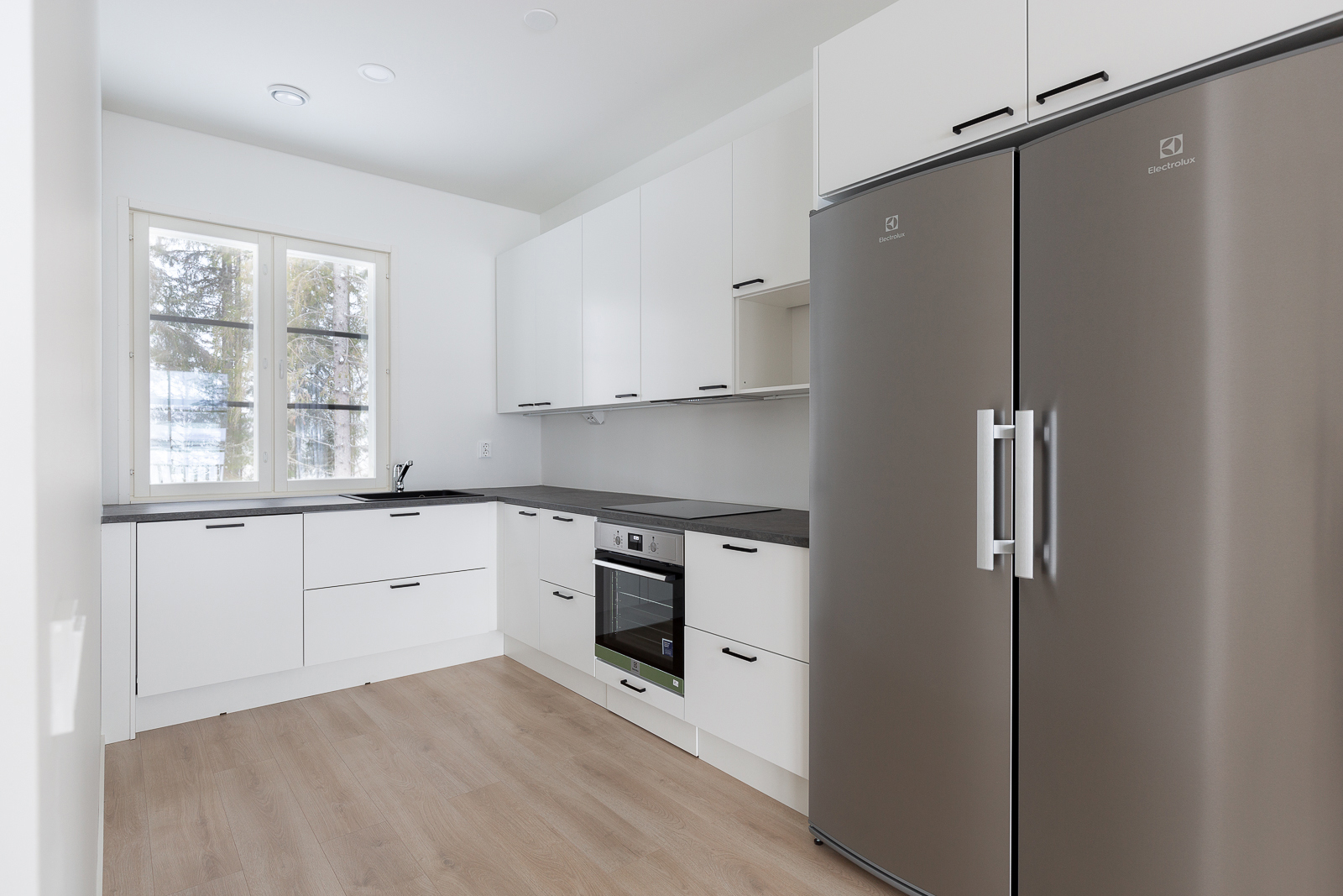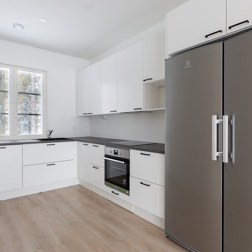 Varusteina induktiotaso, erillisuuni, liesikupu aktiivihiili-suodattimella, täyskorkea jääkaappi ja pakastin, astianpesukone sekä tilavaraus mikroaaltouunille.