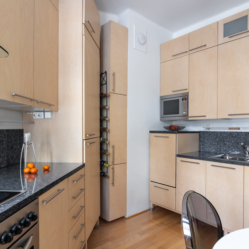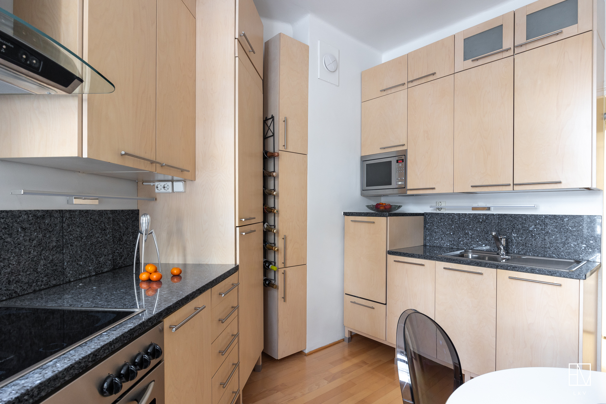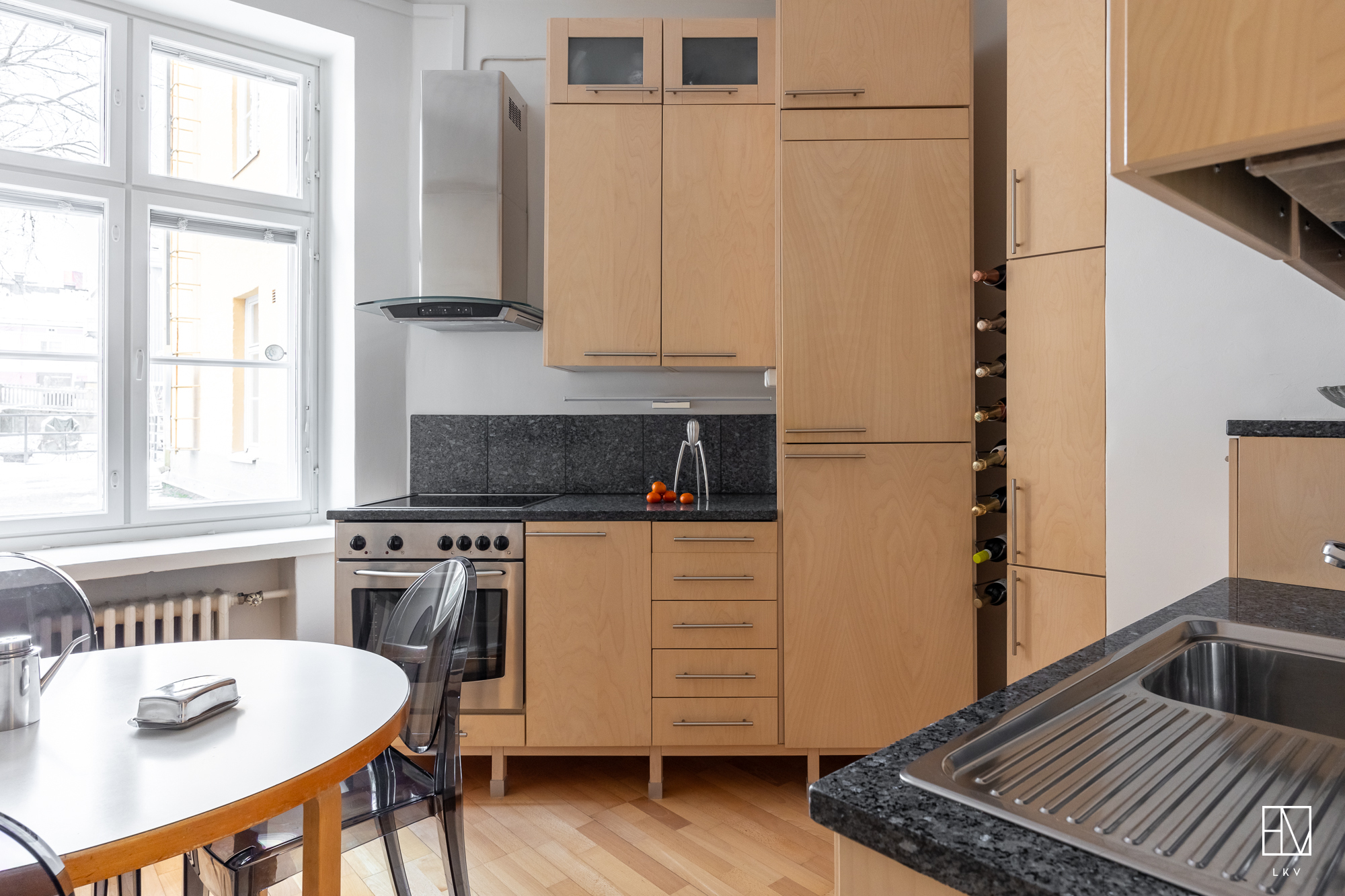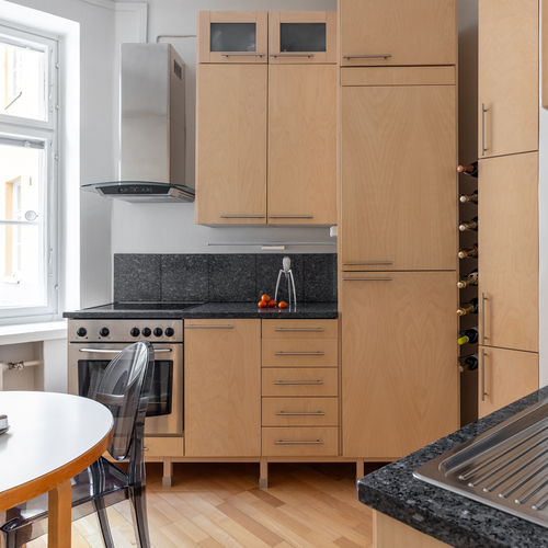 Puustellin koivuviilukaapistot (myös rungot), kivitasot, integroidut kylmäkalusteet ja astianpesukone, rosteriuuni, rosterimikroaaltouuni, keraaminen liesi ja huuva. Pyökkiparketti