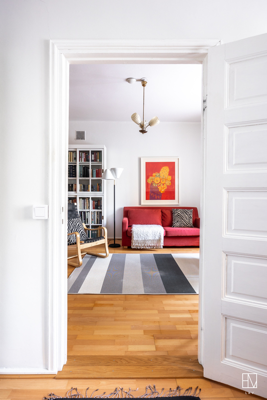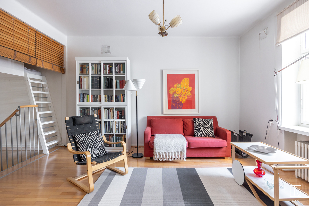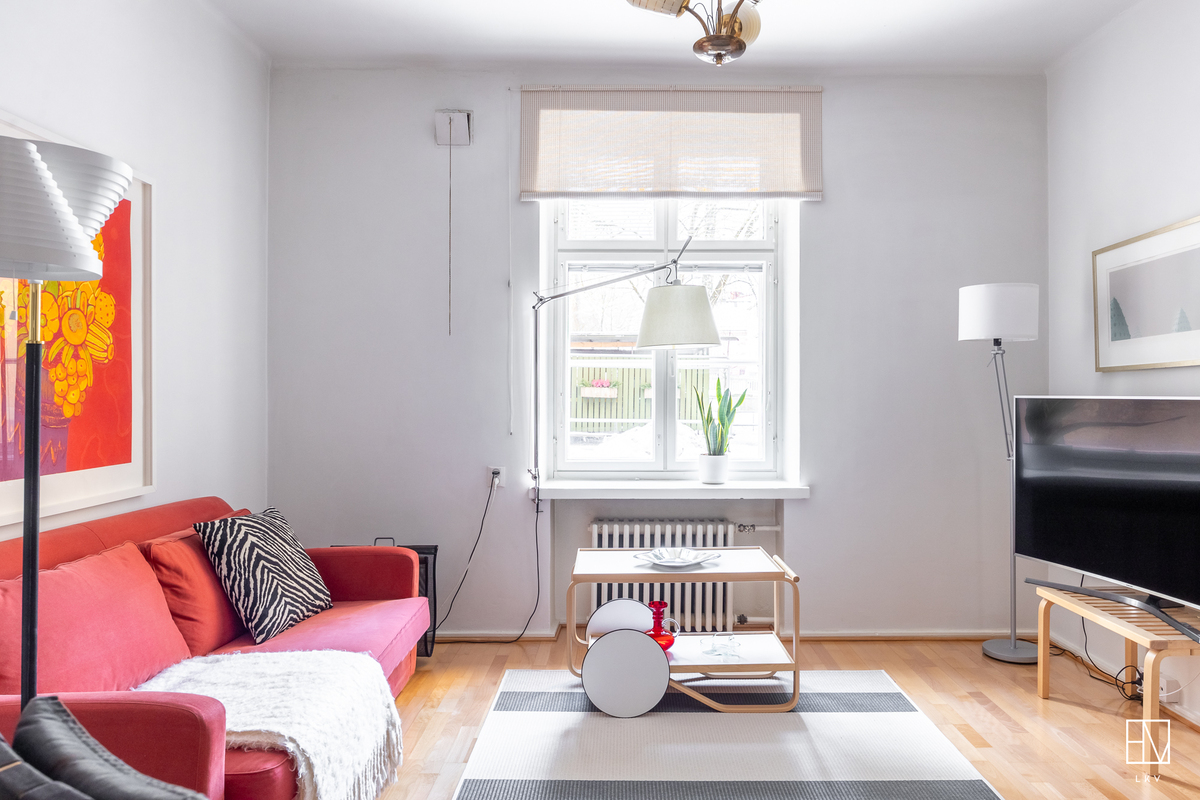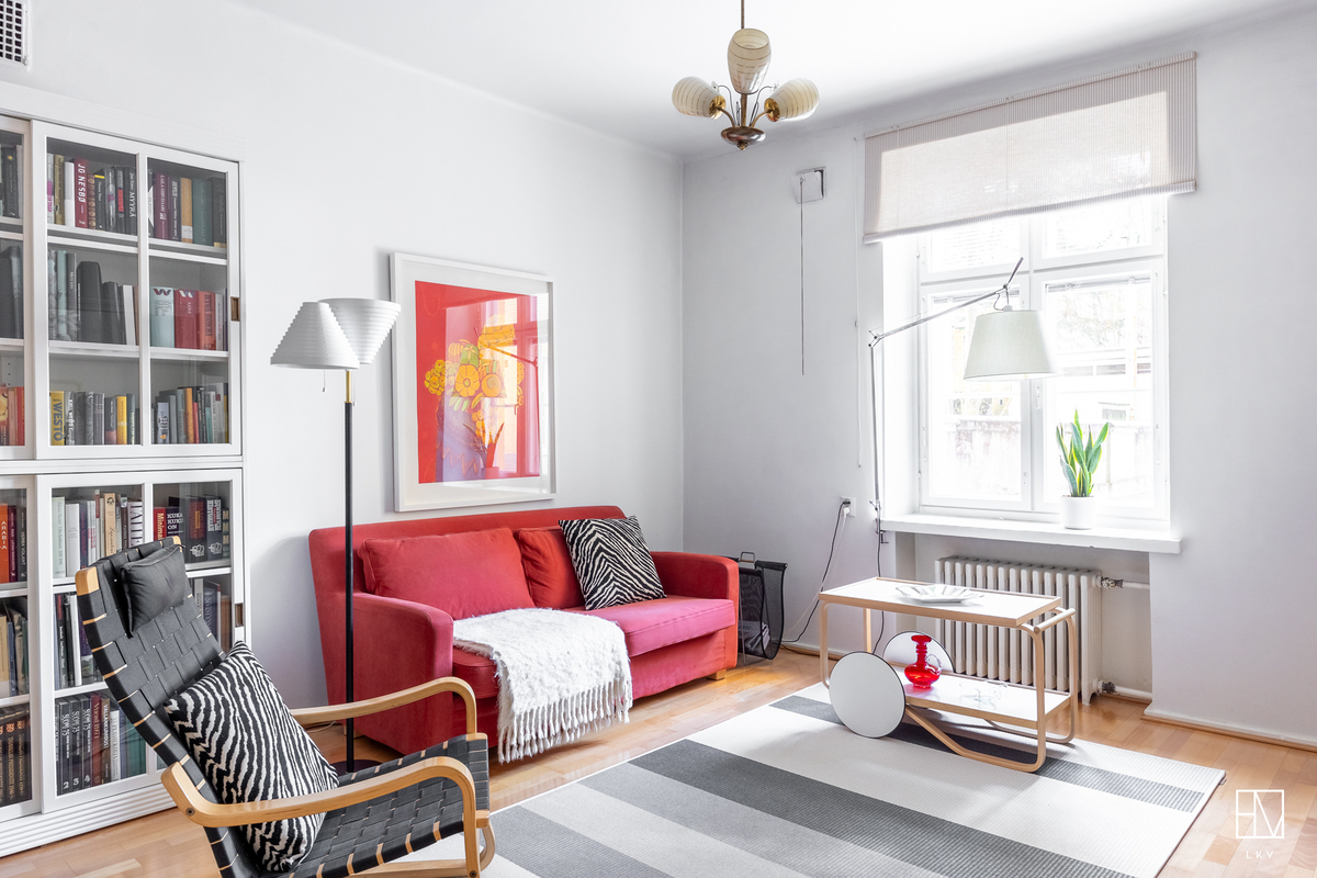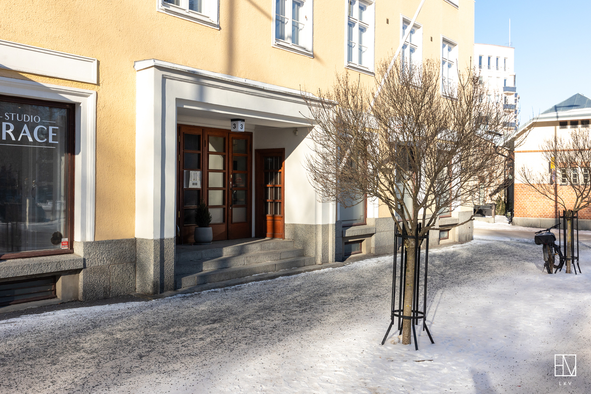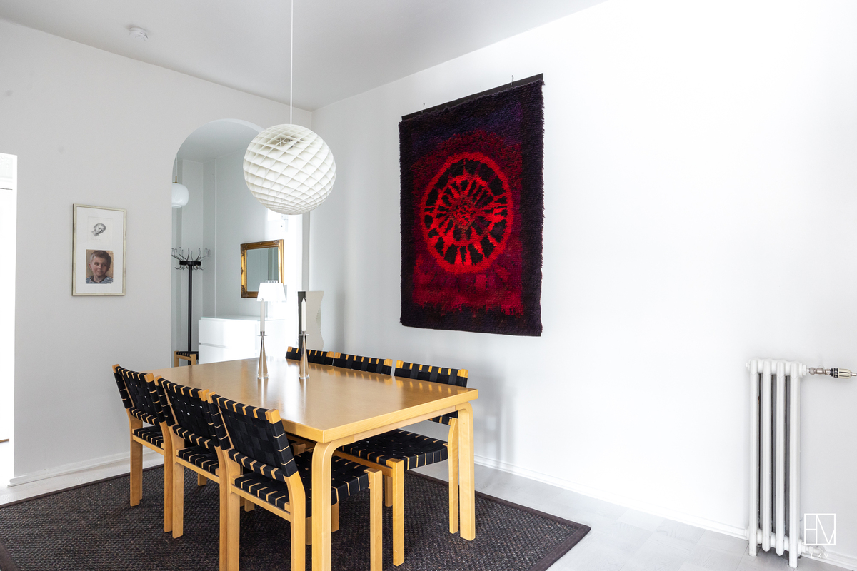 Vuonna 1928 valmistunut asunto huokuu ajalleen tyypillisiä arvokkaita piirteitä, kuten korkea huonekorkeus, leveät ikkunapenkit ja seinään upotetut valurautapatterit. Taloyhtiön näyttävä porrasaula mukailee samaa arkkitehtuuria.