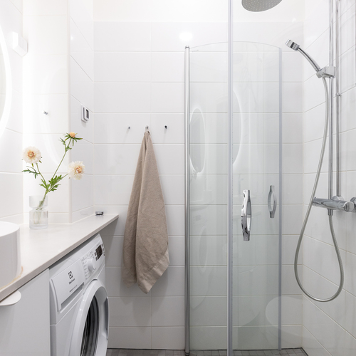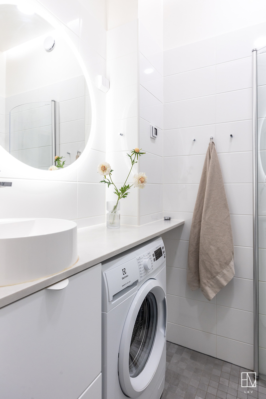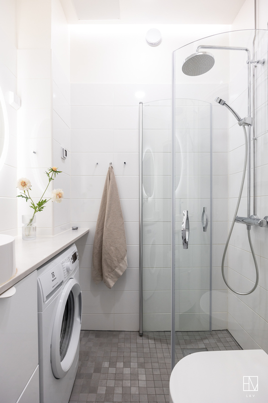 Tyylikäs kylpyhuone remontoitu vuonna 2022. Seinät ja lattia laattaa.