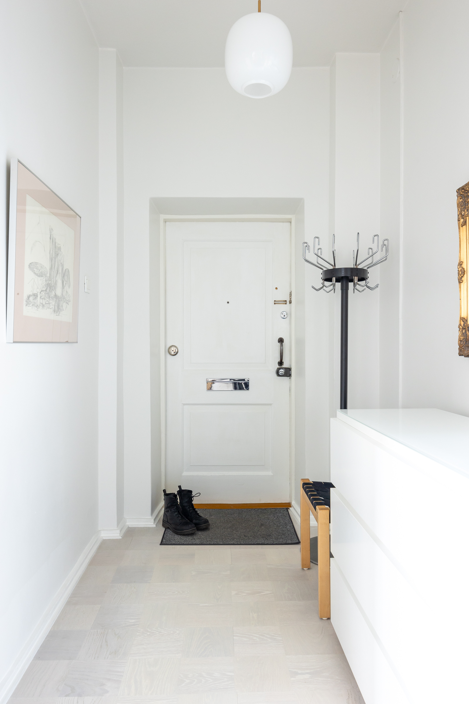 Valkovahattu tammiparketti eteisessä ja ruokailutilassa.