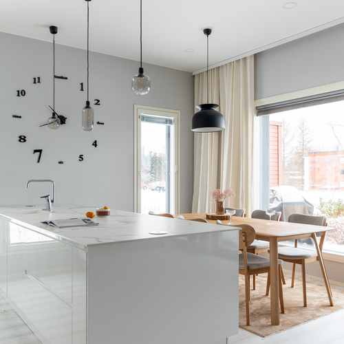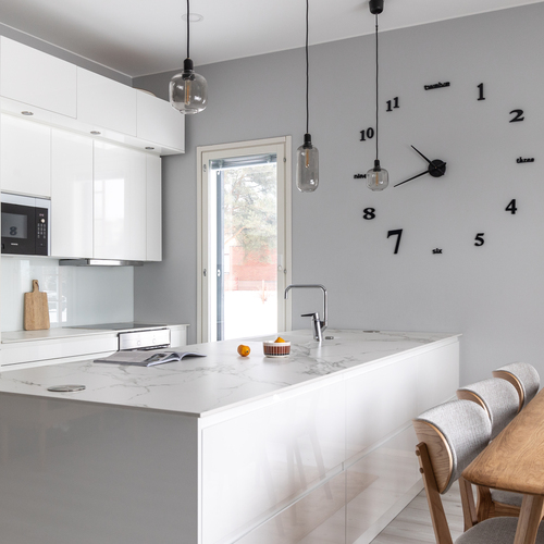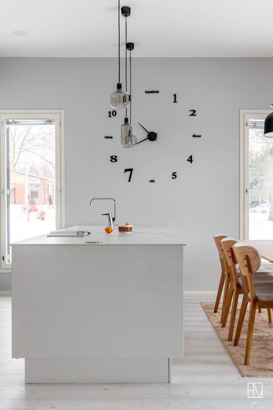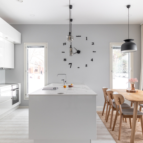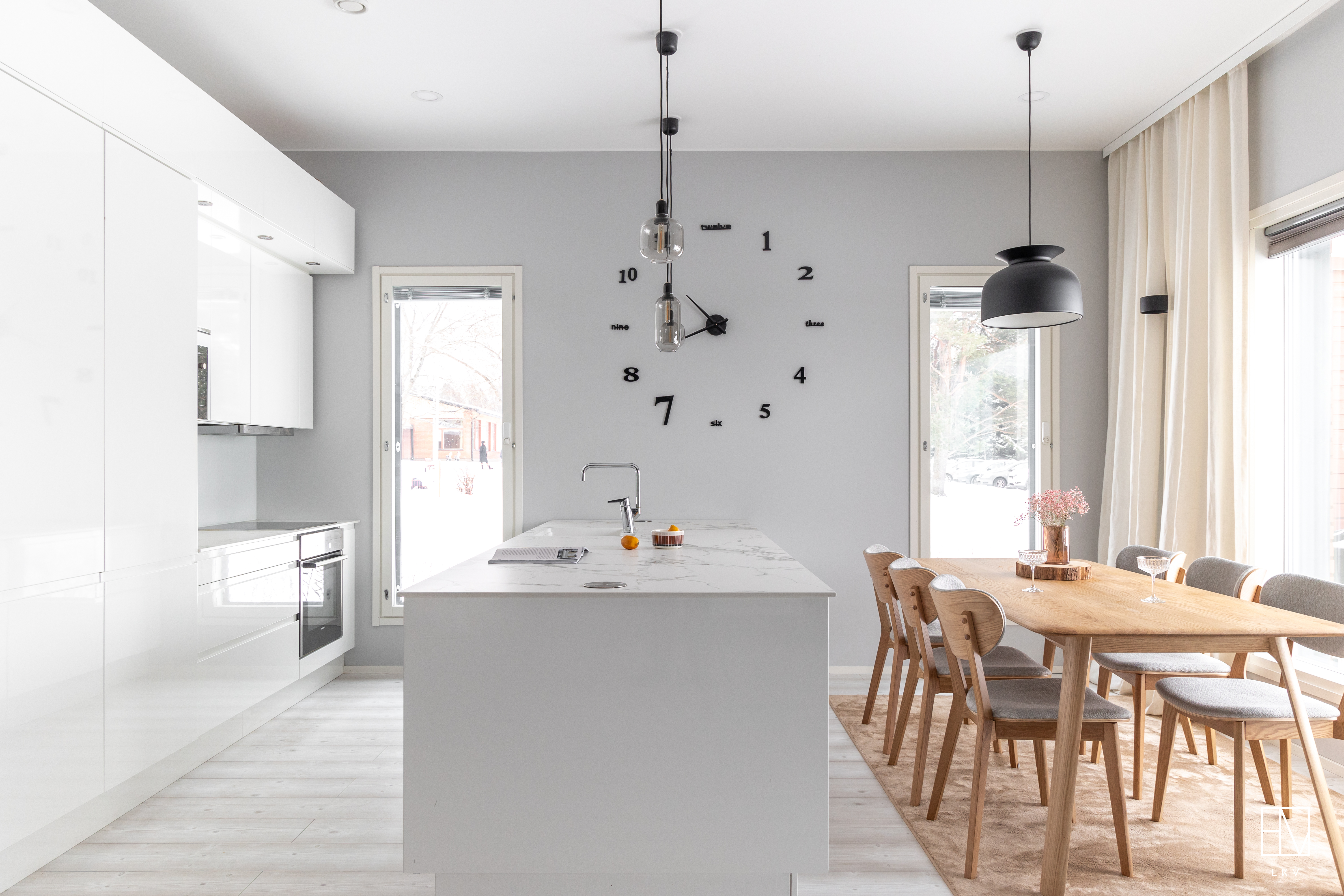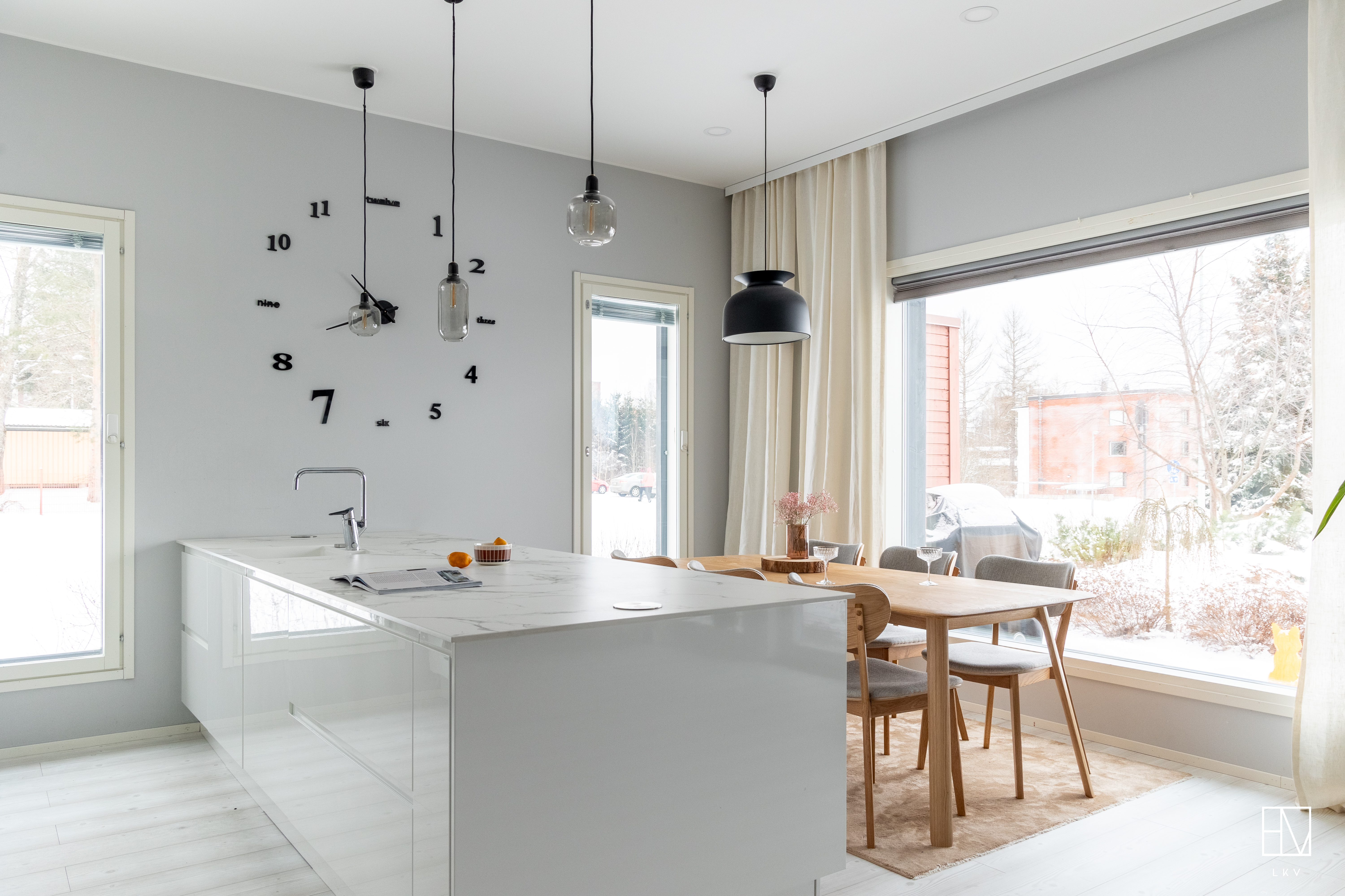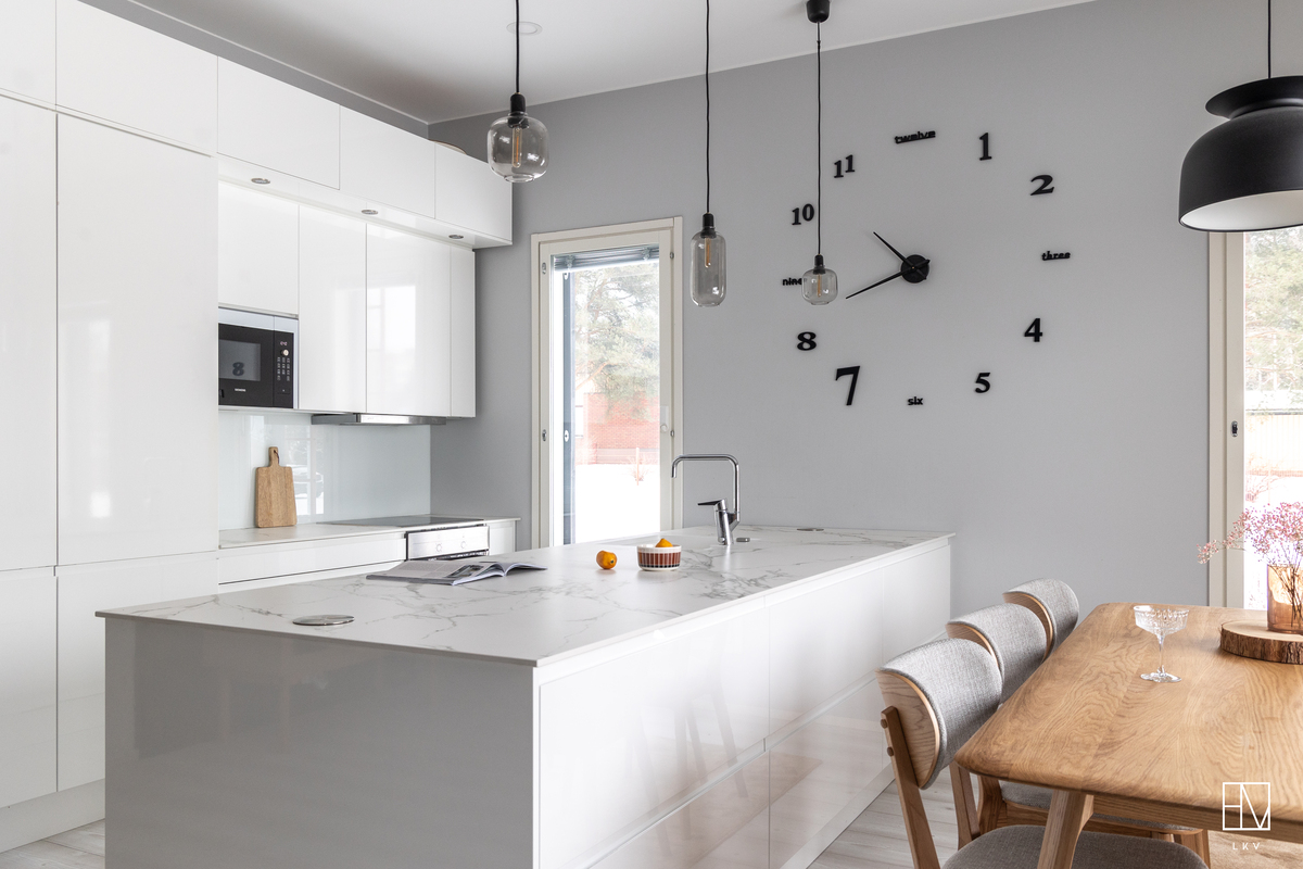 Tyylikkäässä vaaleassa keittiössä mukavasti lasku- ja kaappitilaa. Suuri saareke, missä myös säilytystilaa.
