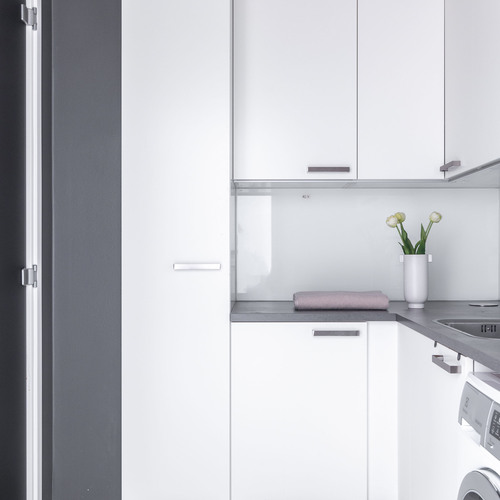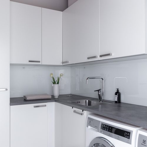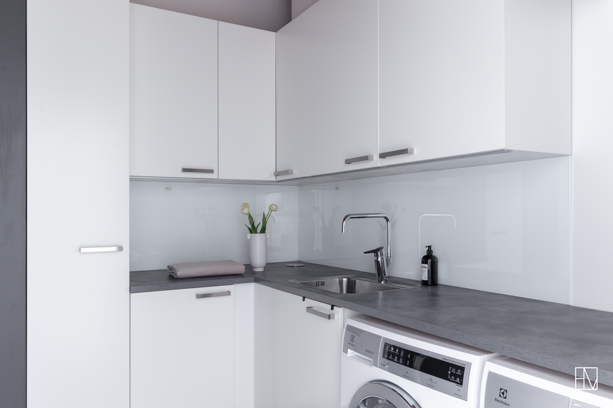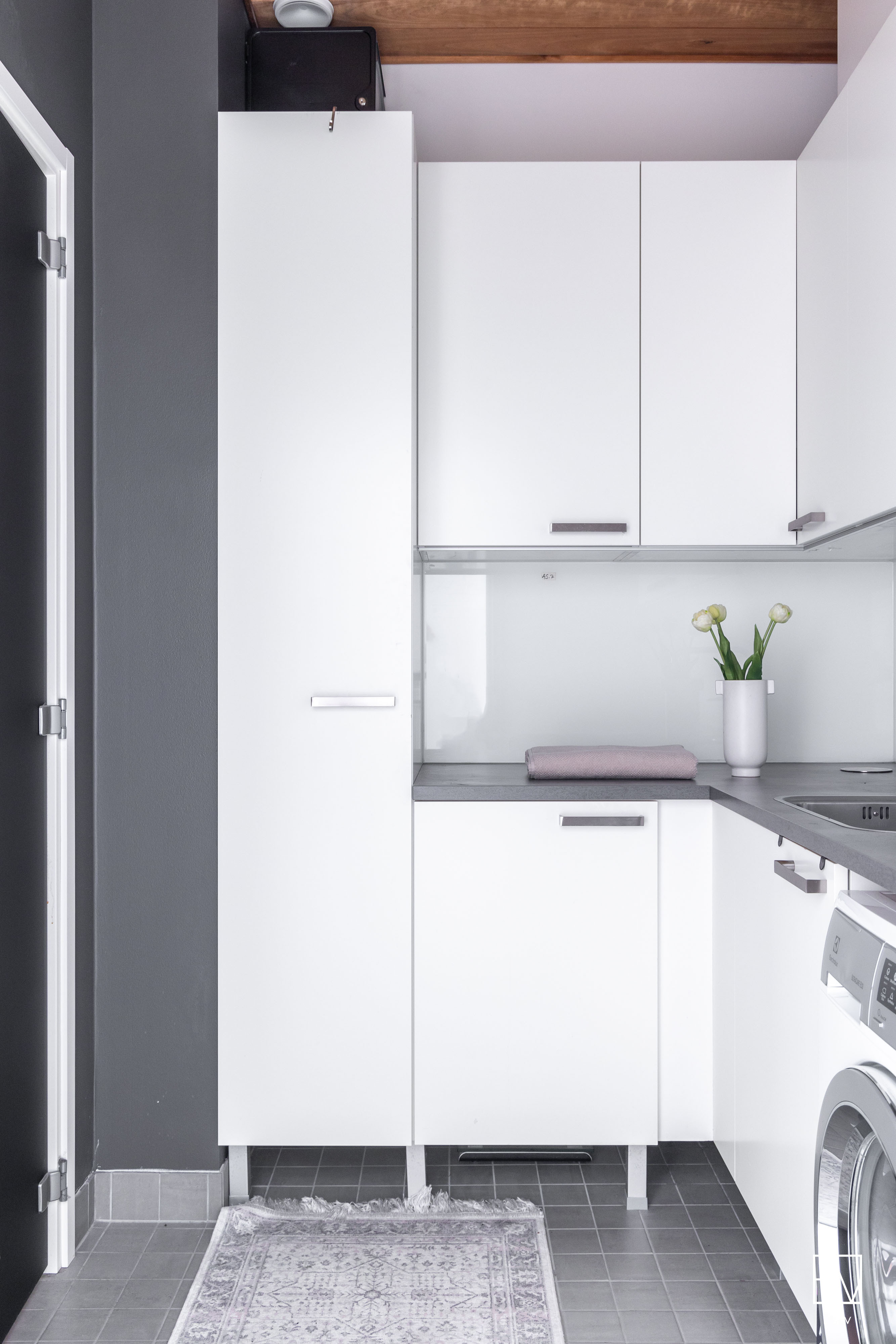 Kodinhoitohuoneessa mukavasti kaappi- ja laskutilaa. Laattalattia. Pesuallas ja paikka pyykinpesukoneelle sekä kuivausrummulle.