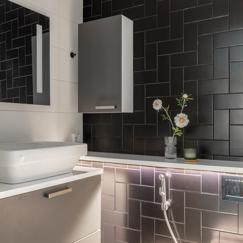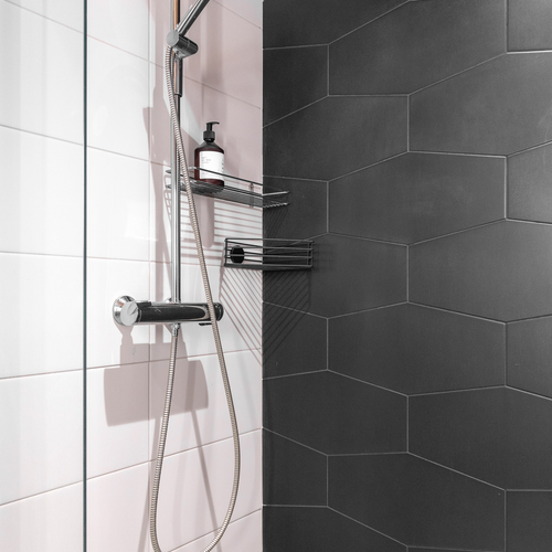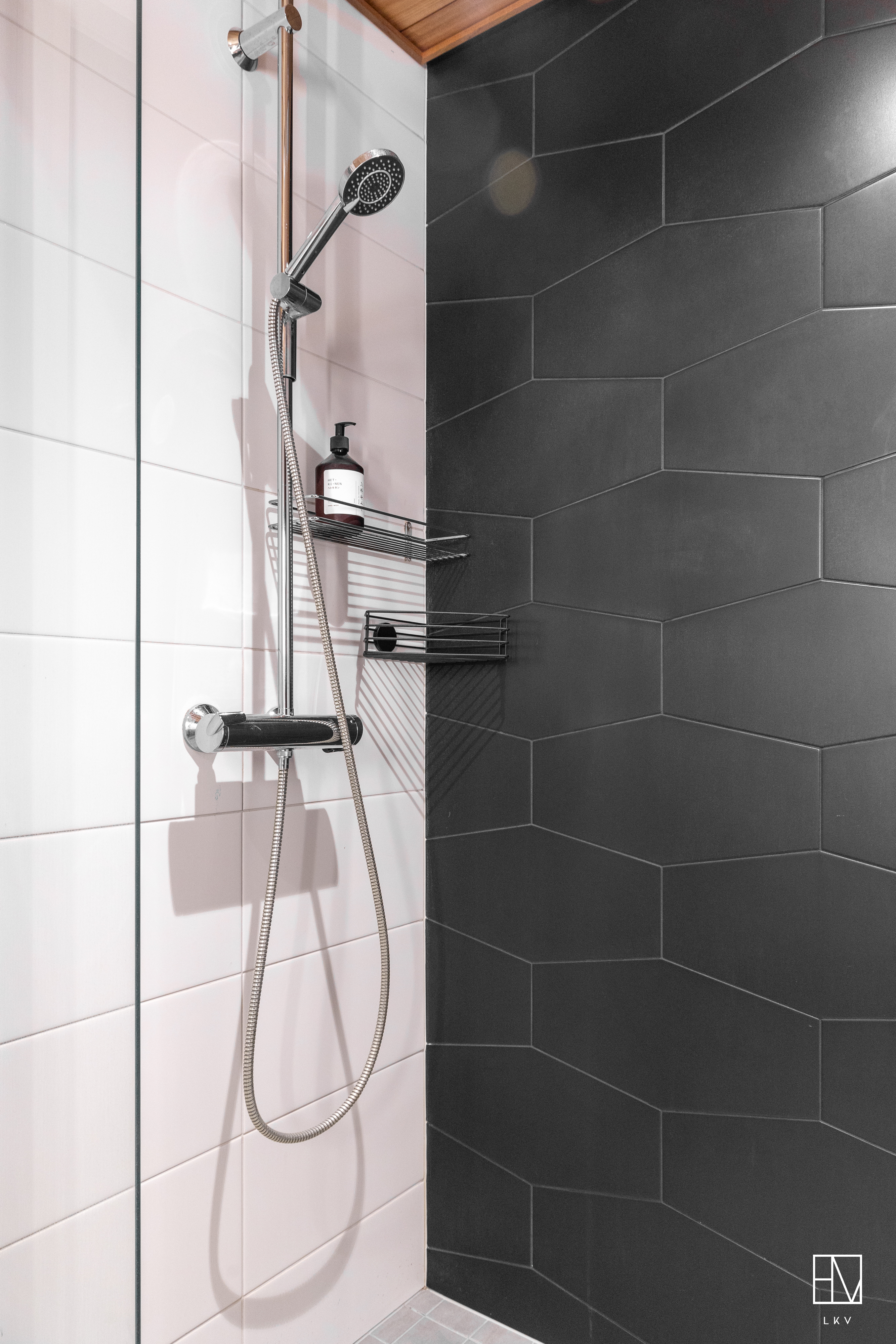 Kylpyhuoneessa seinissä ja lattioissa näyttävät laatat. Suihku, pesuallas, allaskaappi, seinä-wc.